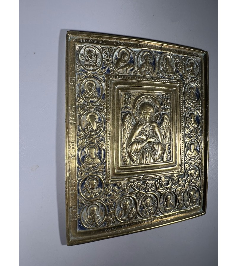 Ikona, plaketė Gerosios tylos su išrinktaisiais šventaisiais Gelbėtojas antikvarinė, stačiatikių, krikščionių ortodoksų, pravoslavų, puošta mėlyna emale. Kaina 213