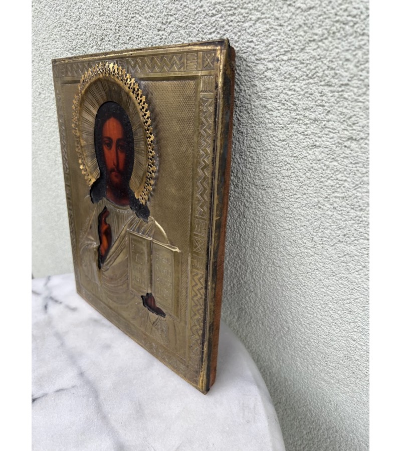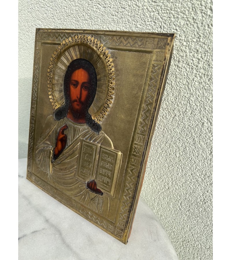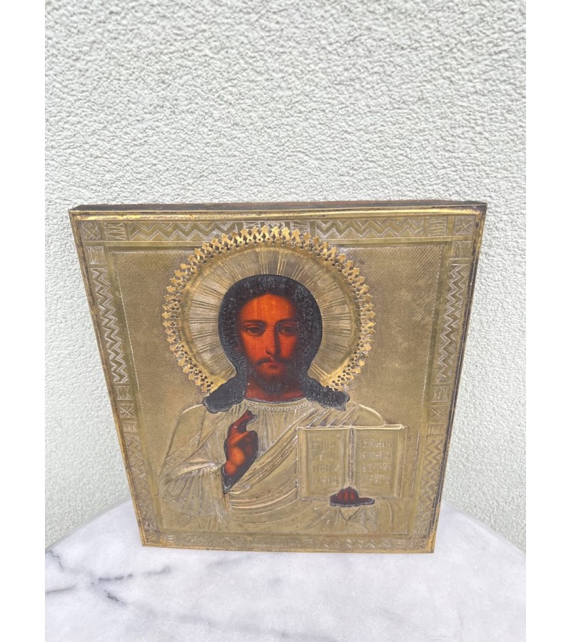 Ikona Kristus Pantokratorius (gr. Pantokrator reiškia Visagalis, Visavaldys), aliejinė tapyba ant medžio, žalvariniu okladu. Originali rusų stačiatikių ikona. XIX a. pb. Dydis: 2 x 26 x 31 cm. Kaina 487
