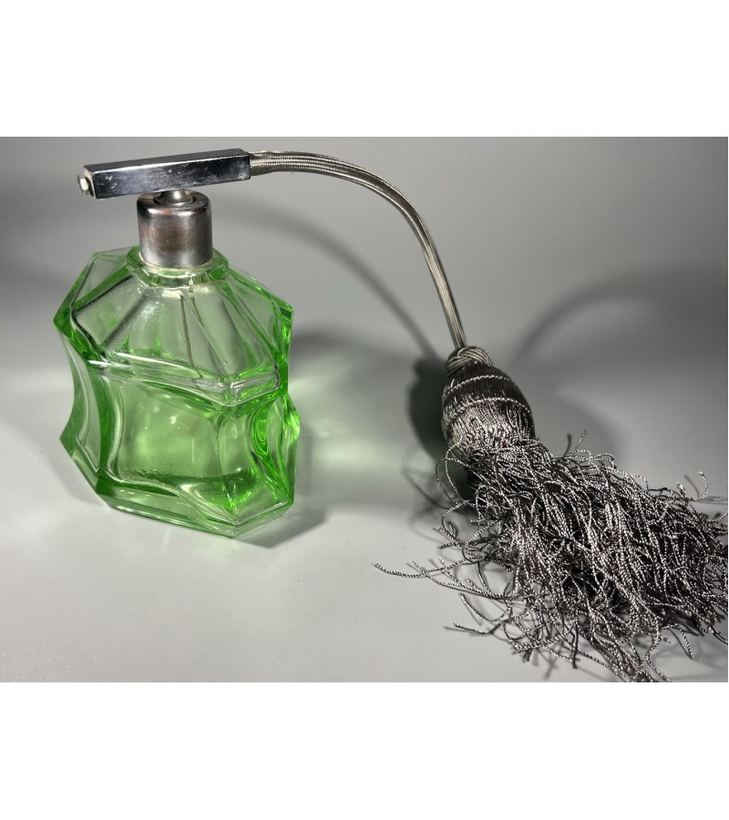 Buteliukas, purškiklis urano stiklo, Art Deco stiliaus, antikvarinis, kvepalams, odekolonui su kriauše-purkštuku. Veikiantis. Veikiantis. Aukštis 12 cm. Kaina 128