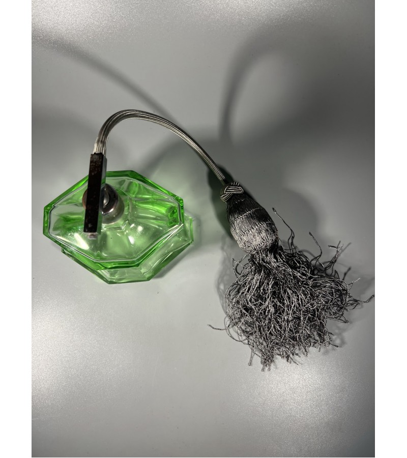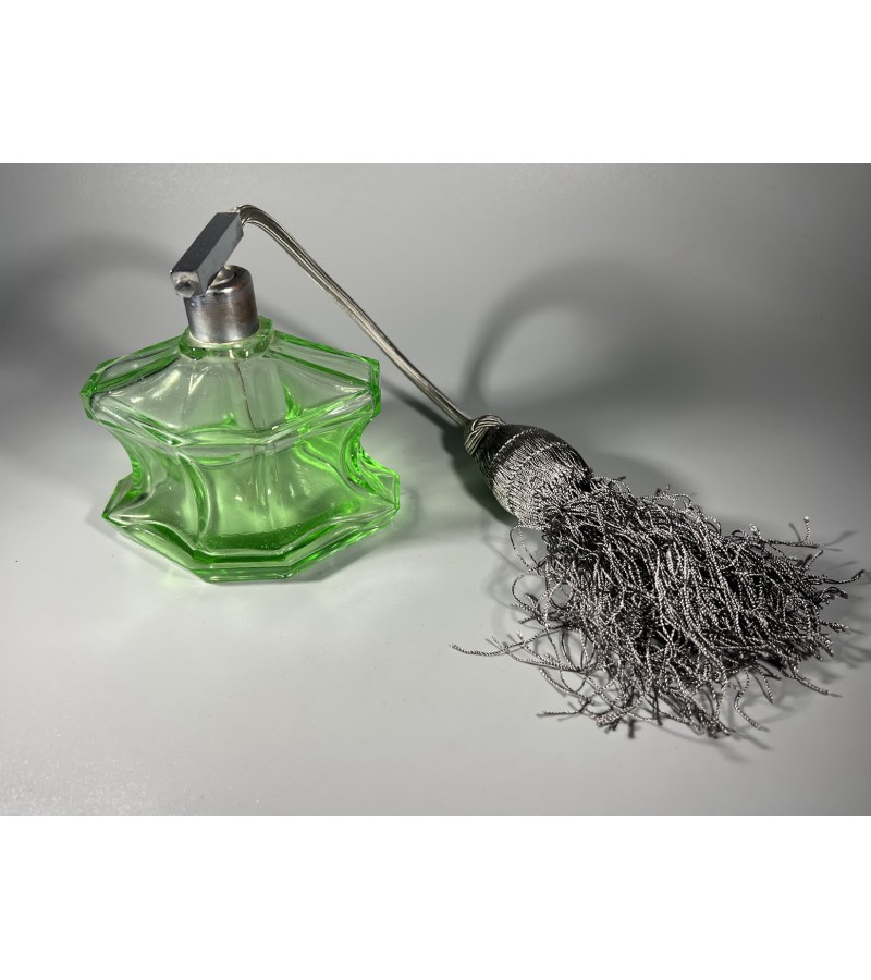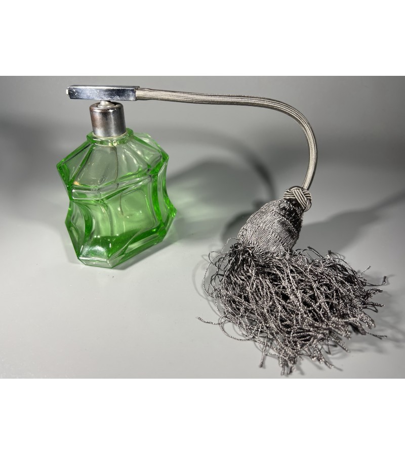 Buteliukas, purškiklis urano stiklo, Art Deco stiliaus, antikvarinis, kvepalams, odekolonui su kriauše-purkštuku. Veikiantis. Kaina 128