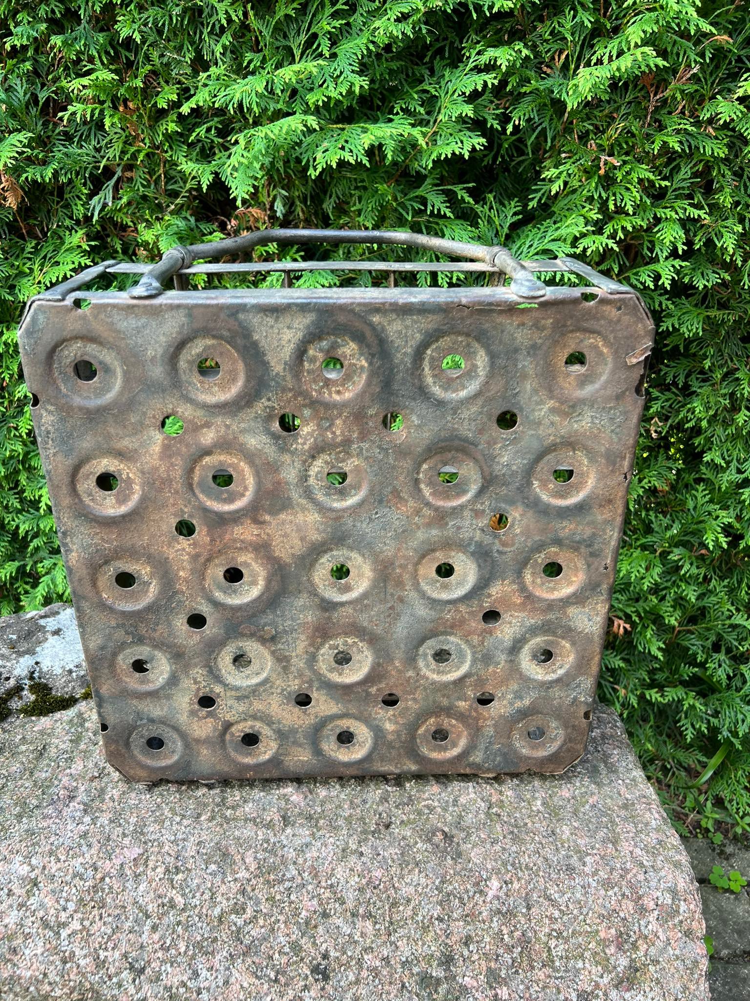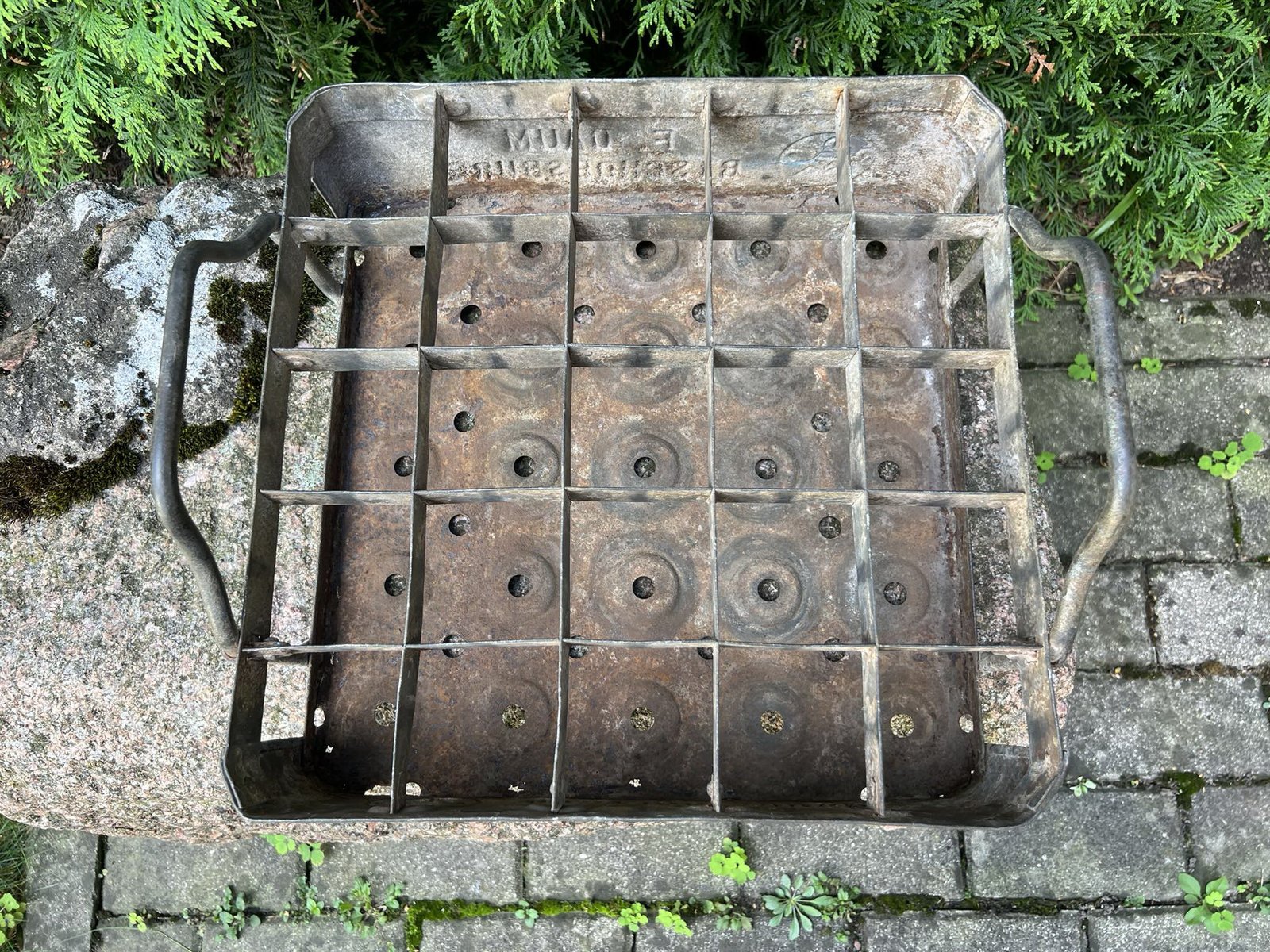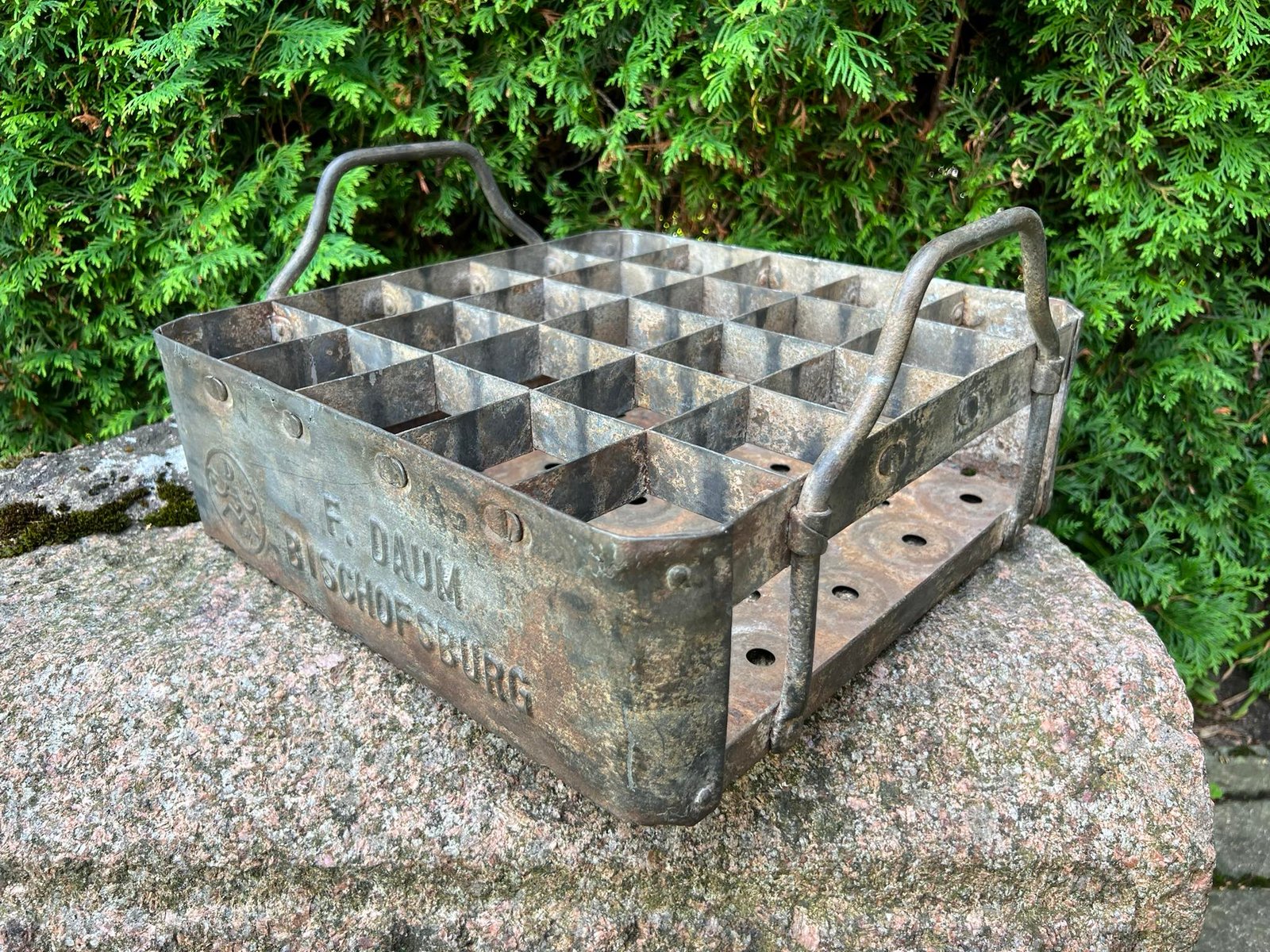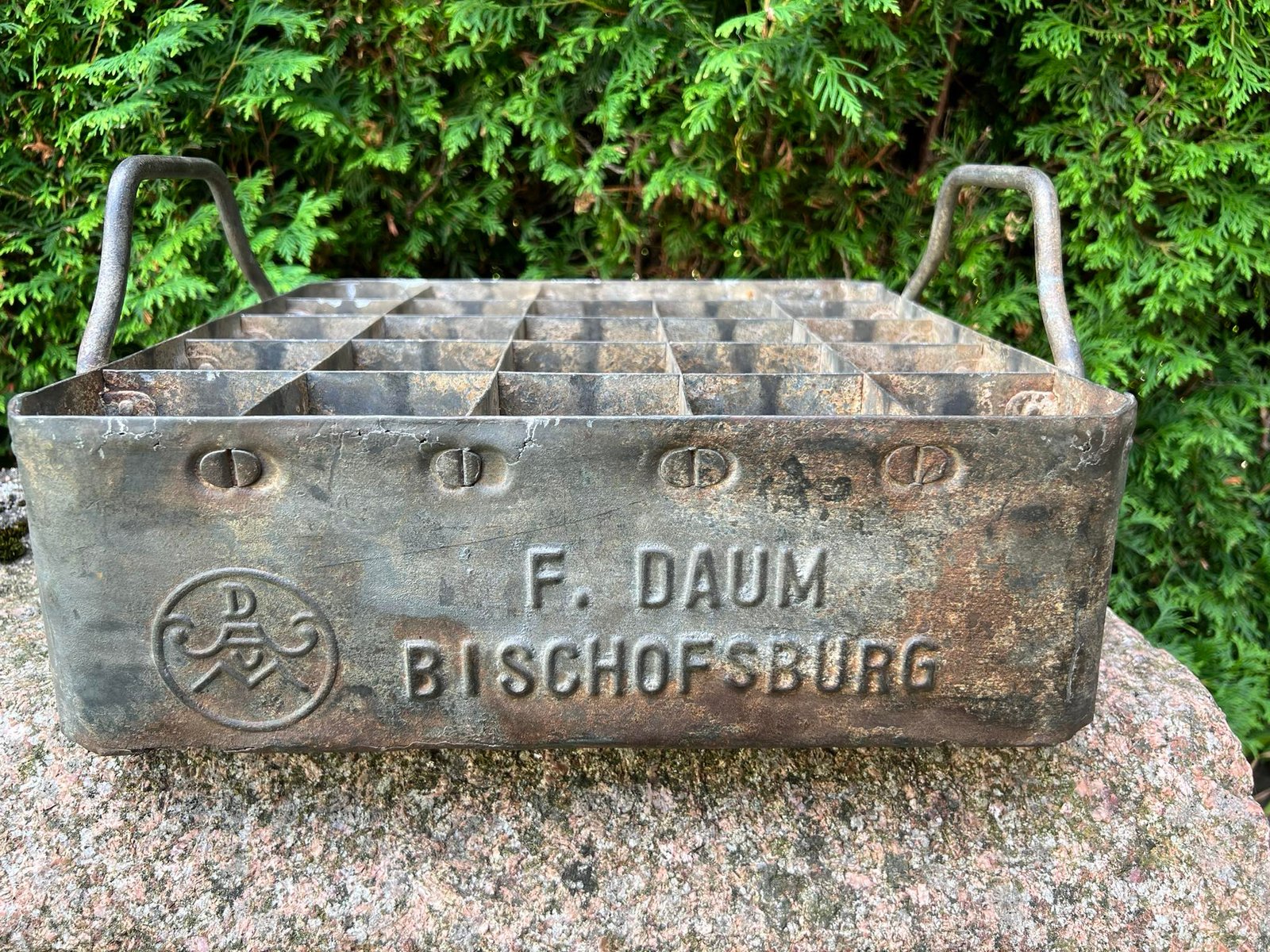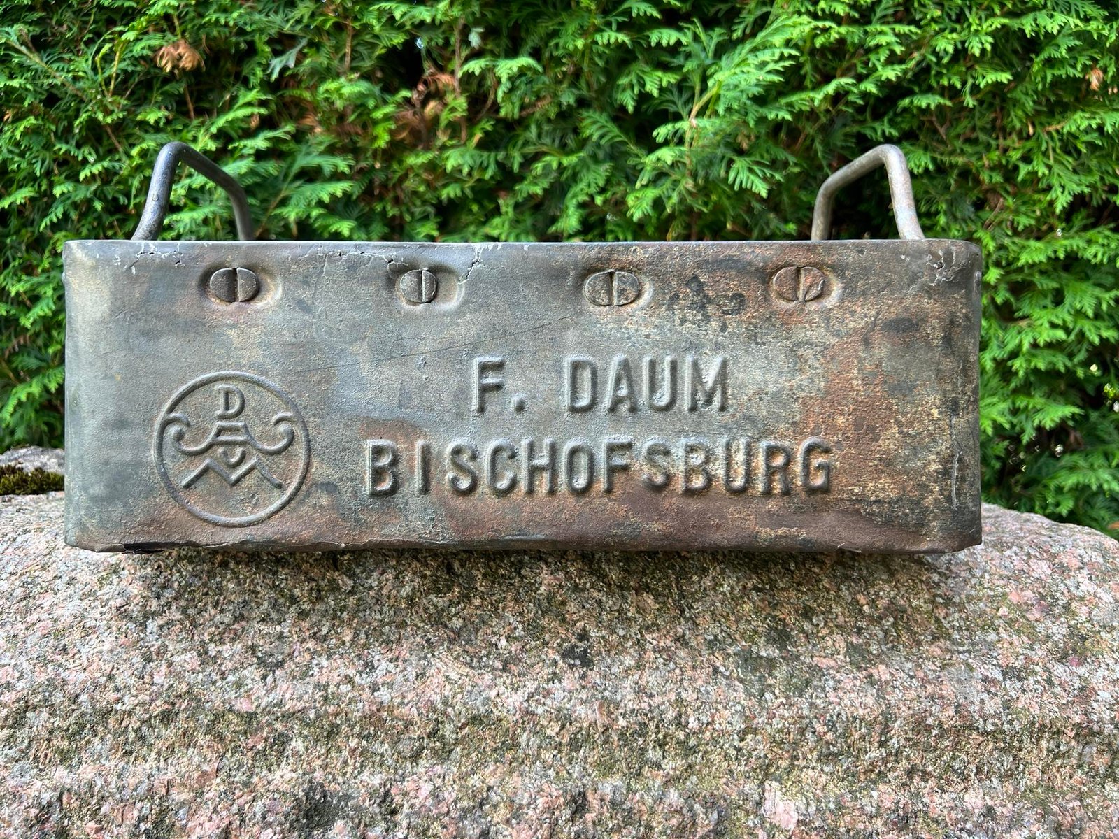 Alaus dėžė antikvarinė, skardinė, tarpukario laikų F. DAUM BISCHOFSBURG (Bischofsburg. Ost Preussen). Rytų Prūsija. Ilgis 50, plotis 36, aukštis 12, aukštis su rankenmis 20 cm. Kaina 108