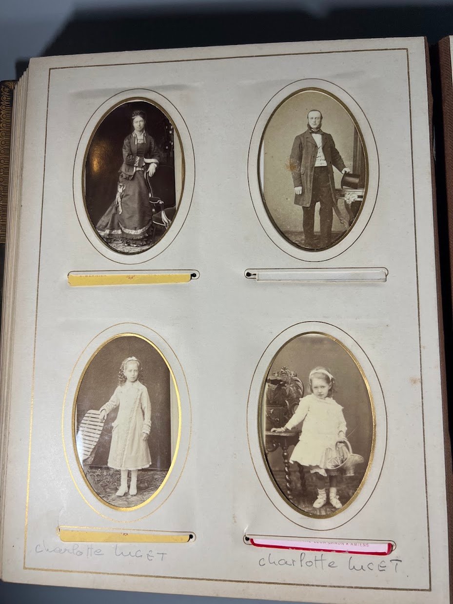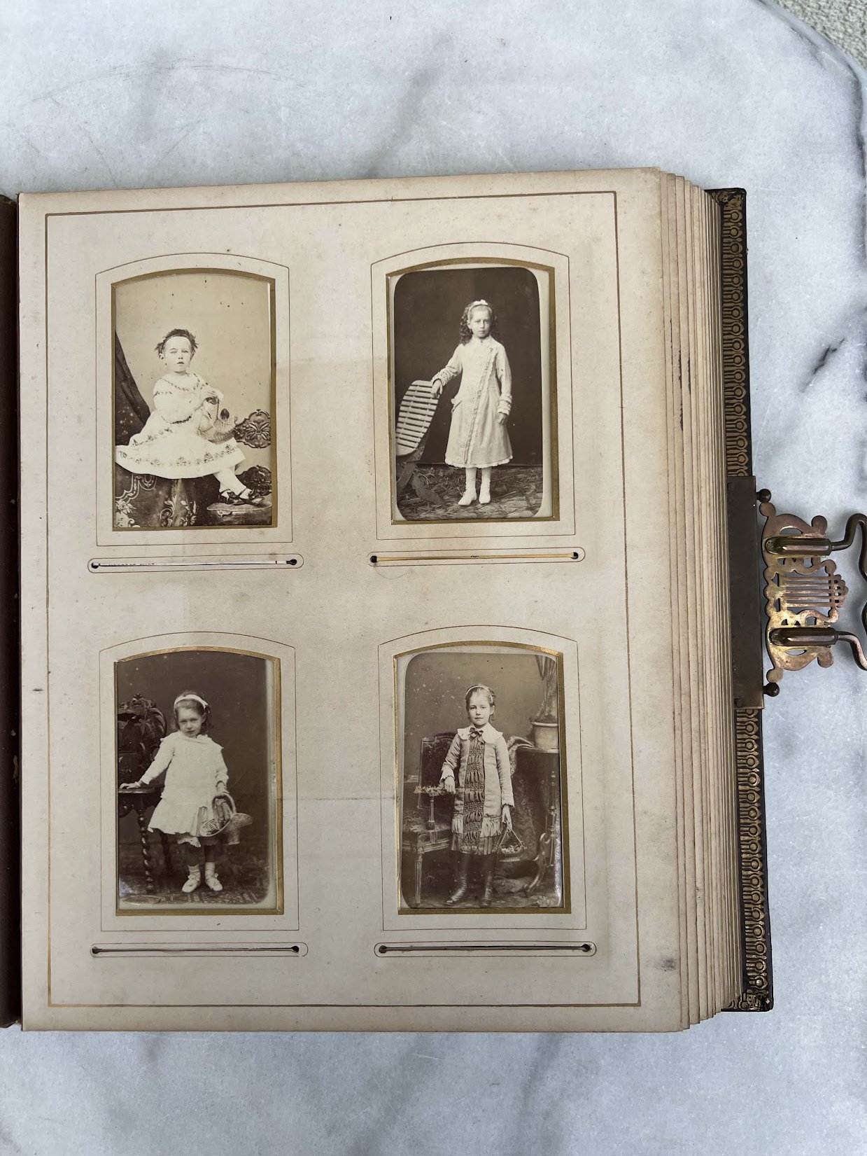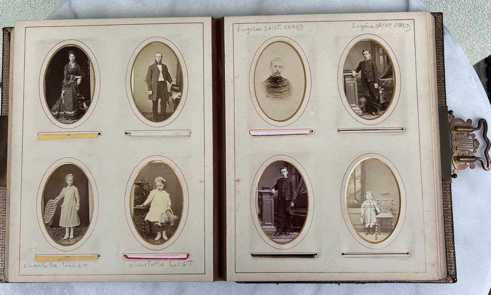 Albumas su kartonažinėmis nuotraukomis, antikvarinis. Prancūzija. Albumo dydis: 5 x 23 x 28 cm. Kaina 178 už viską.