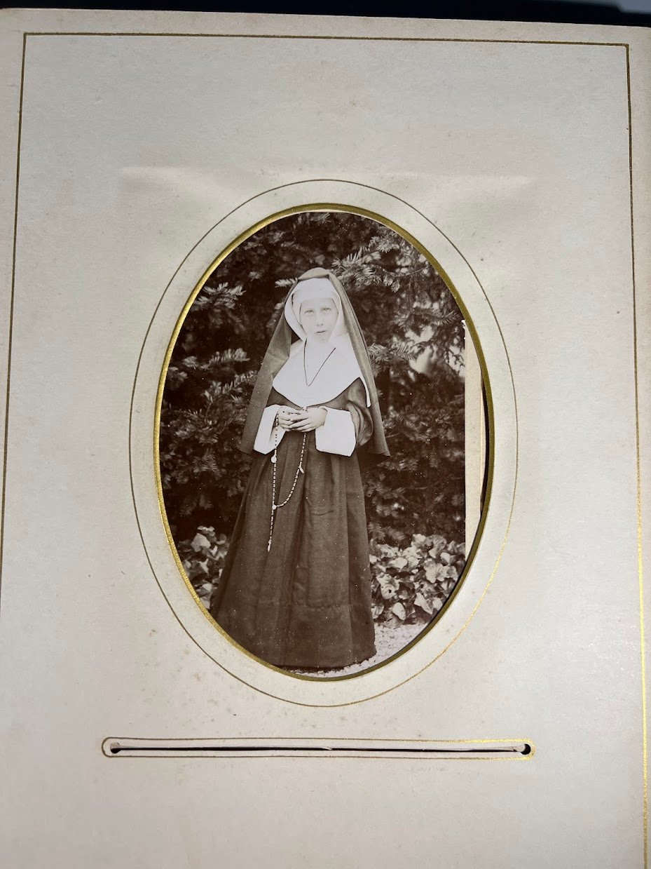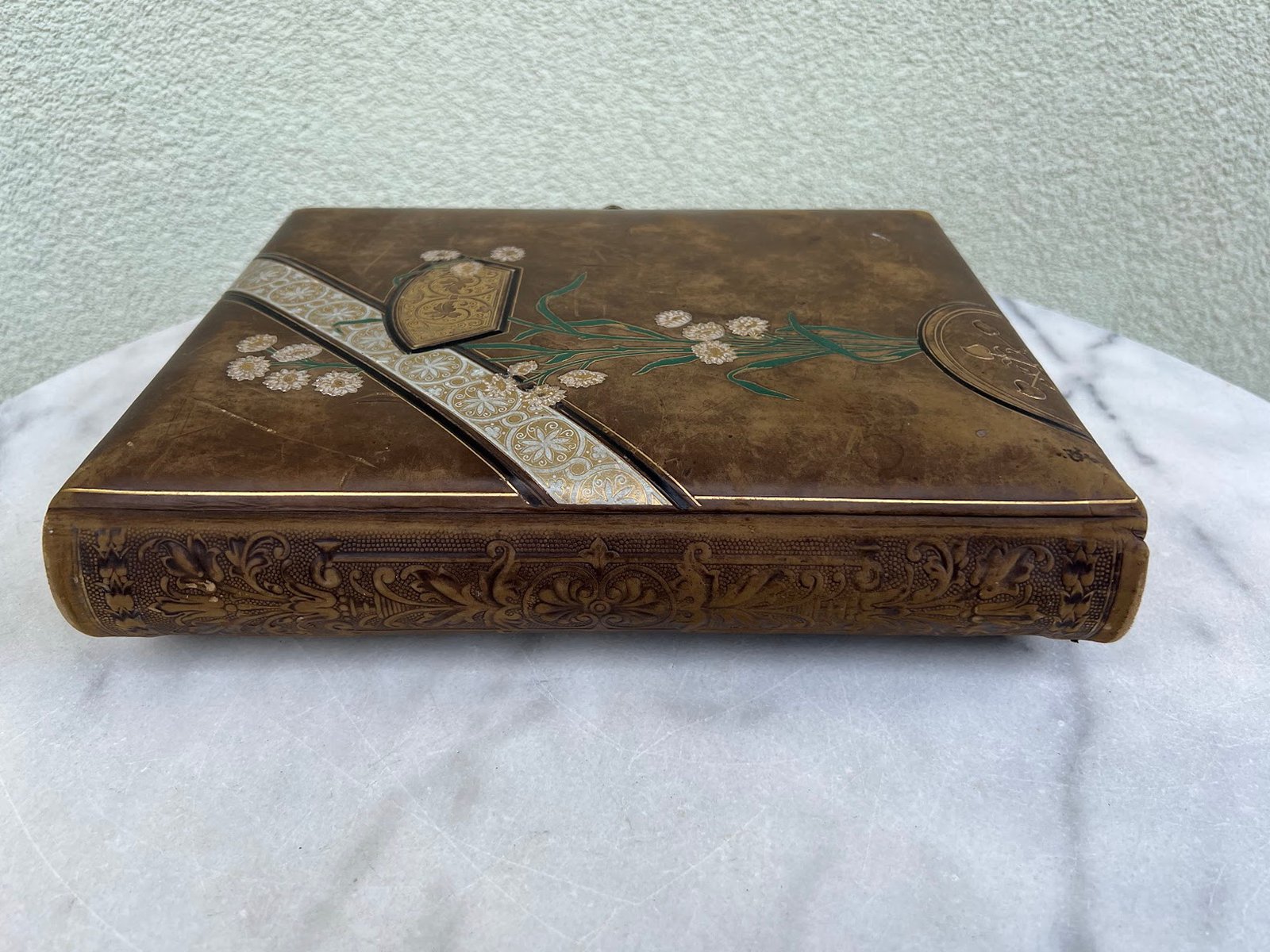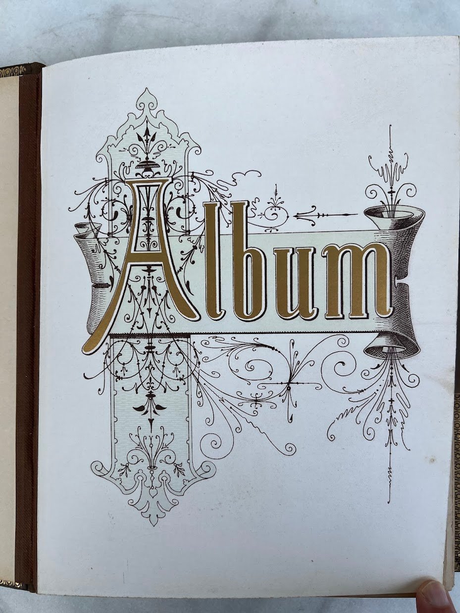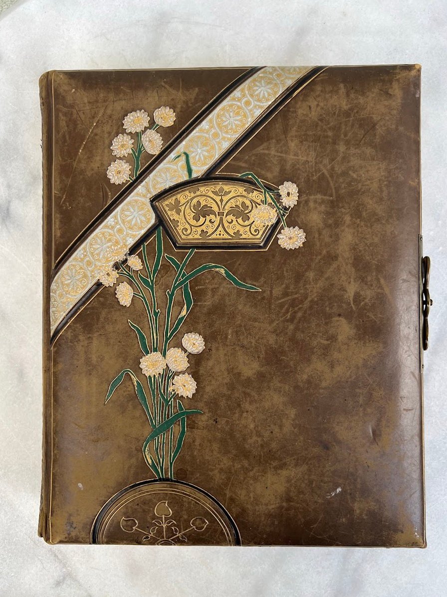 Albumas su kartonažinėmis nuotraukomis, antikvarinis. Prancūzija. Albumo dydis: 5 x 23 x 28 cm. Kaina 178 už viską.