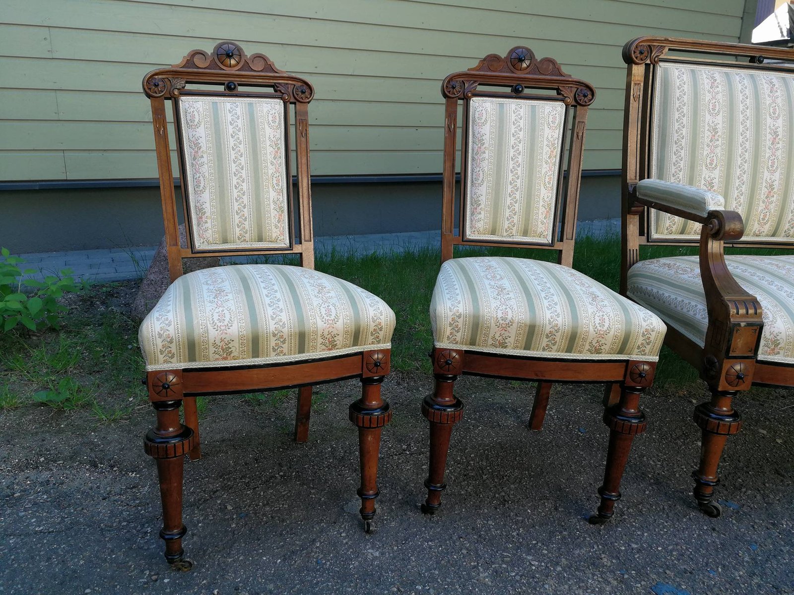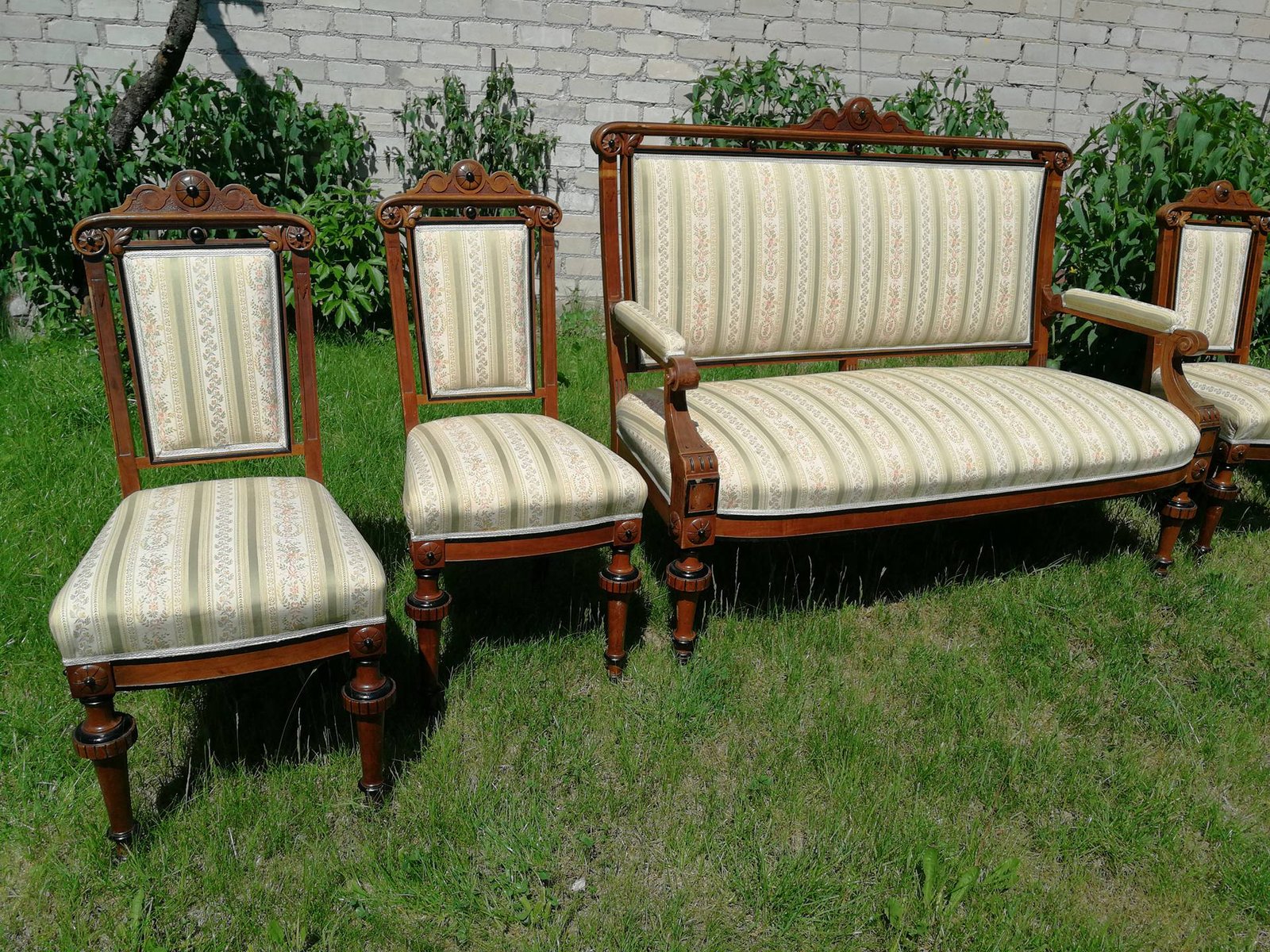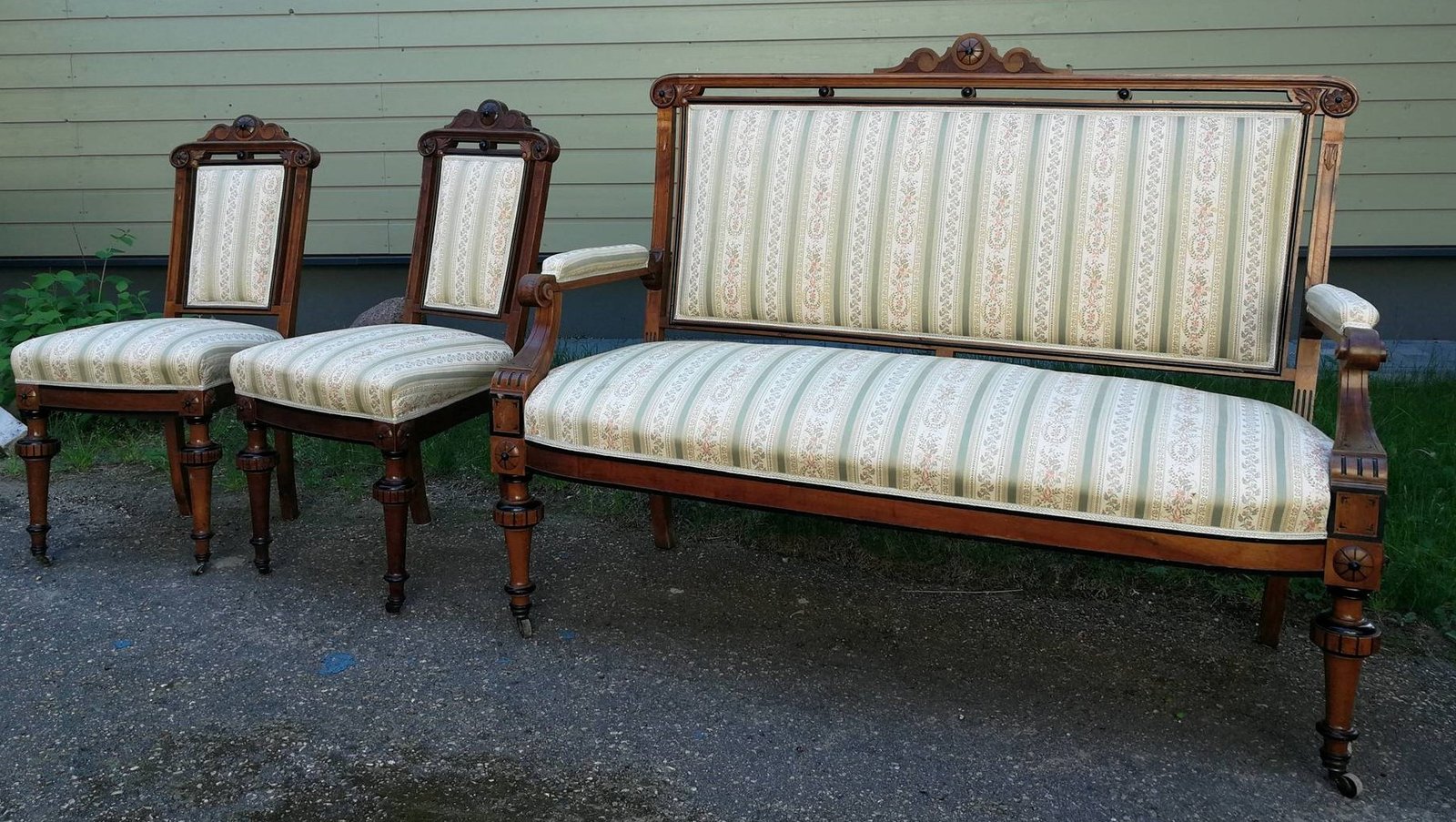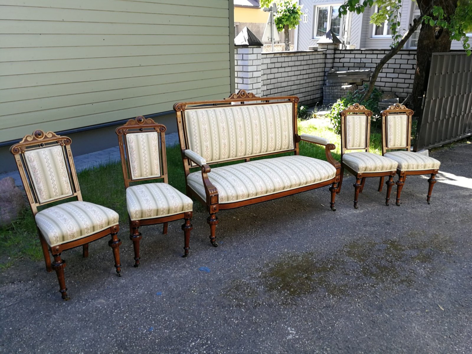 Antikvarinis komplektas: kanapa, sofa, minkštasuolis ir keturios kėdės. Galima pirkti atskirai: kanapos kaina 278, kėdės po 73 eur. Komplekto kaina 458