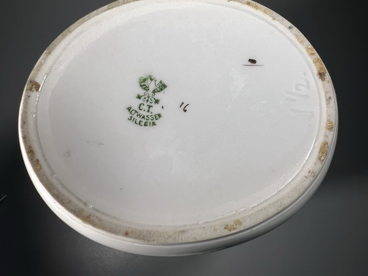 Apie Carl Tielsch Altwasser fabriką: Fabriką 1845 metais Altwasser mieste (tuometinė Prūsijos Silezijos provincija, dabar Stary Zdrój, Lenkija) įkūrė Carl Tielsch. Tai greitai tapo antra pagal dydį porceliano gamykla Silezijoje. Jų gaminiai buvo vertinami dėl aukštos kokybės ir meninės vertės, kartais lyginami net su Berlyno ar Meiseno porcelianu. Per savo istoriją fabrikas naudojo įvairius ženklus, kurie padeda datuoti gaminius. Erelio simbolis buvo vienas iš būdingų šio gamintojo ženklų. Vėliau, XX amžiuje, fabrikas keitė savininkus ir pavadinimus, pavyzdžiui, buvo susijęs su „Hutschenreuther“.