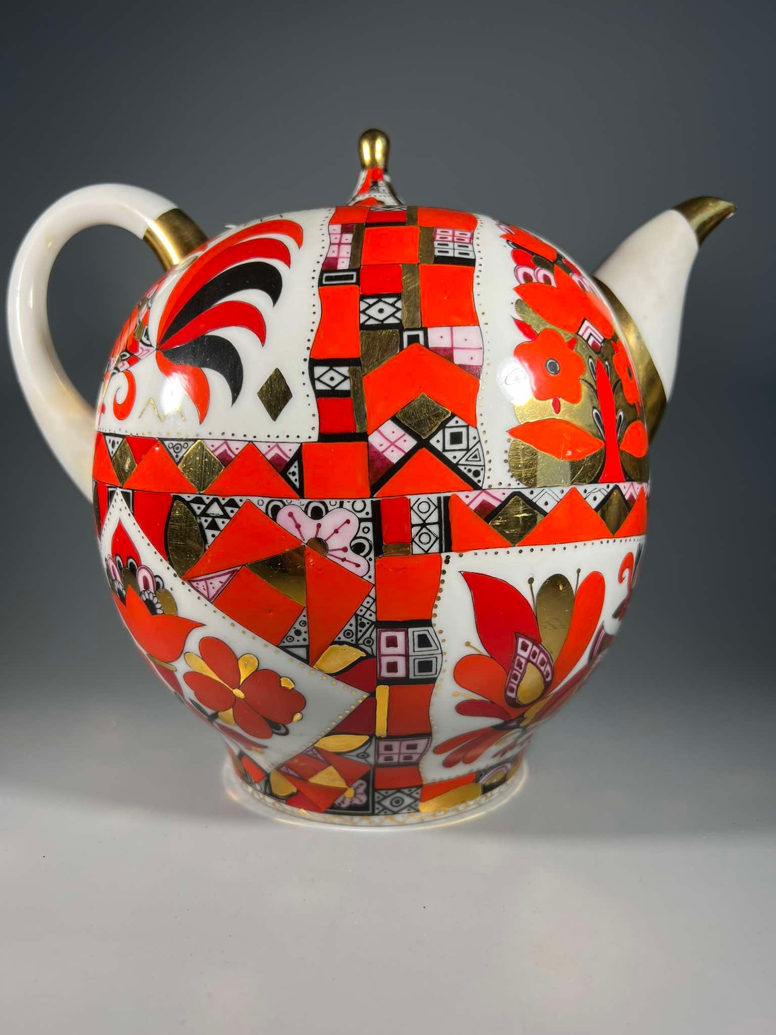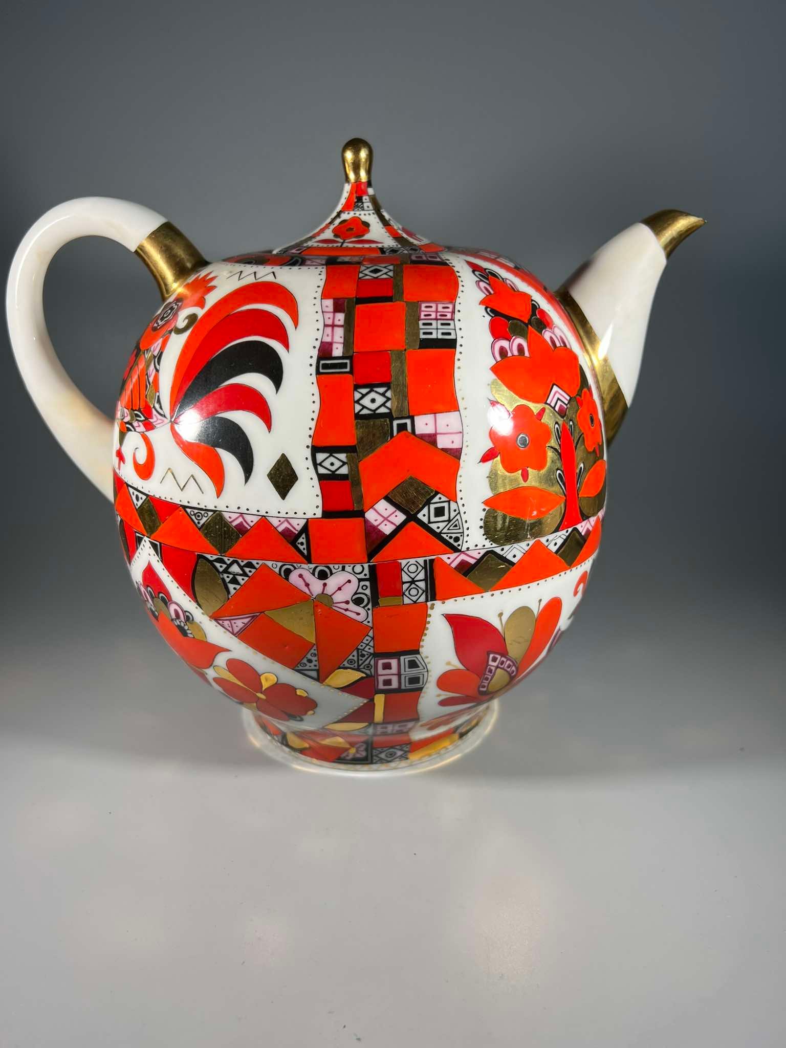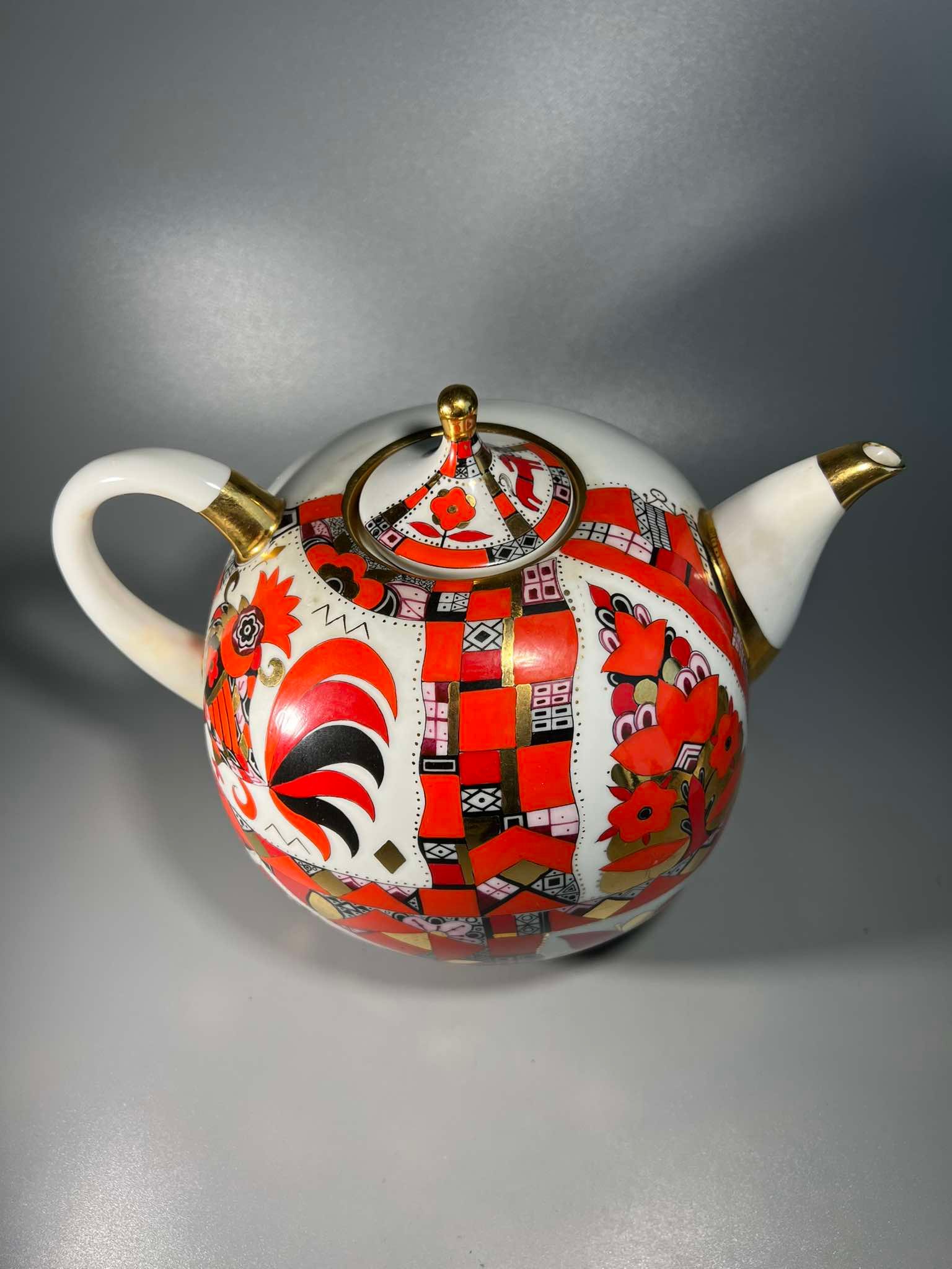 Arbatinukas porcelianinis Raudonasis arklys, menininkas Vorobjevskis, Novgorodo forma, gamintojas LFZ. 1960 m. Talpa 2,5 l. Nedidelis nuskilimas. Ilgis 24, plotis 16, aukštis 31 cm. Kaina 46