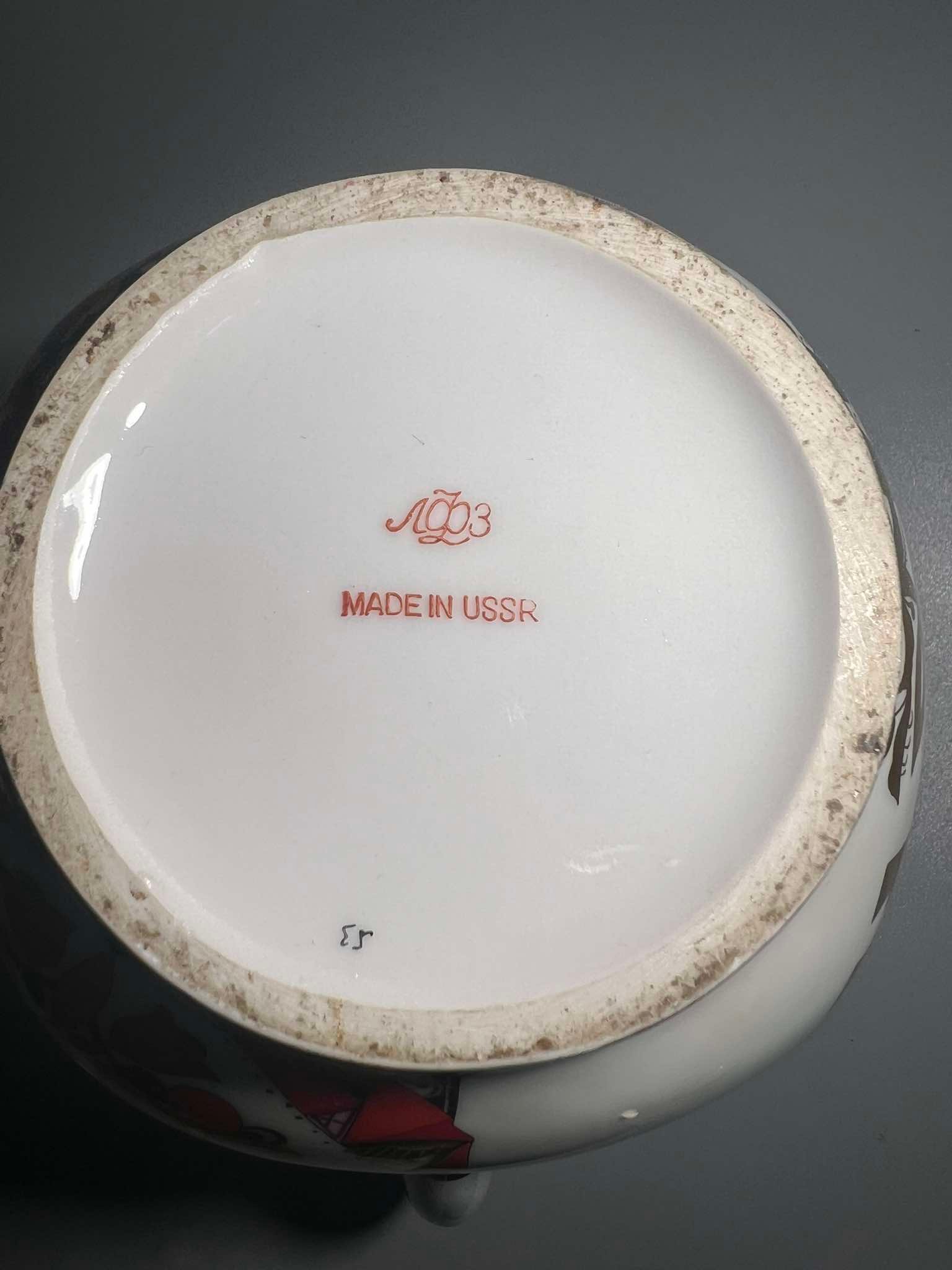 Medžiaga: Kietas porcelianas, auksavimas (22 karatai). Forma: Novgorodas. Formos autorius: Krimmer E.M. Piešinio autorius: Vorobjevskis A.V.