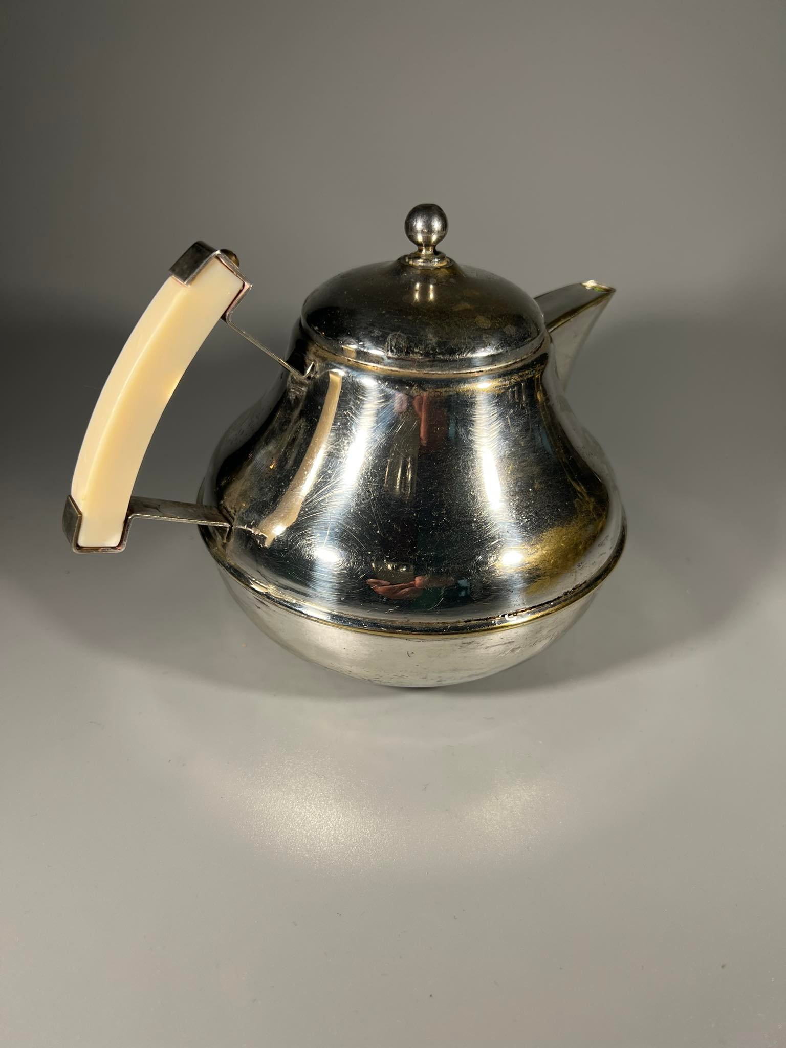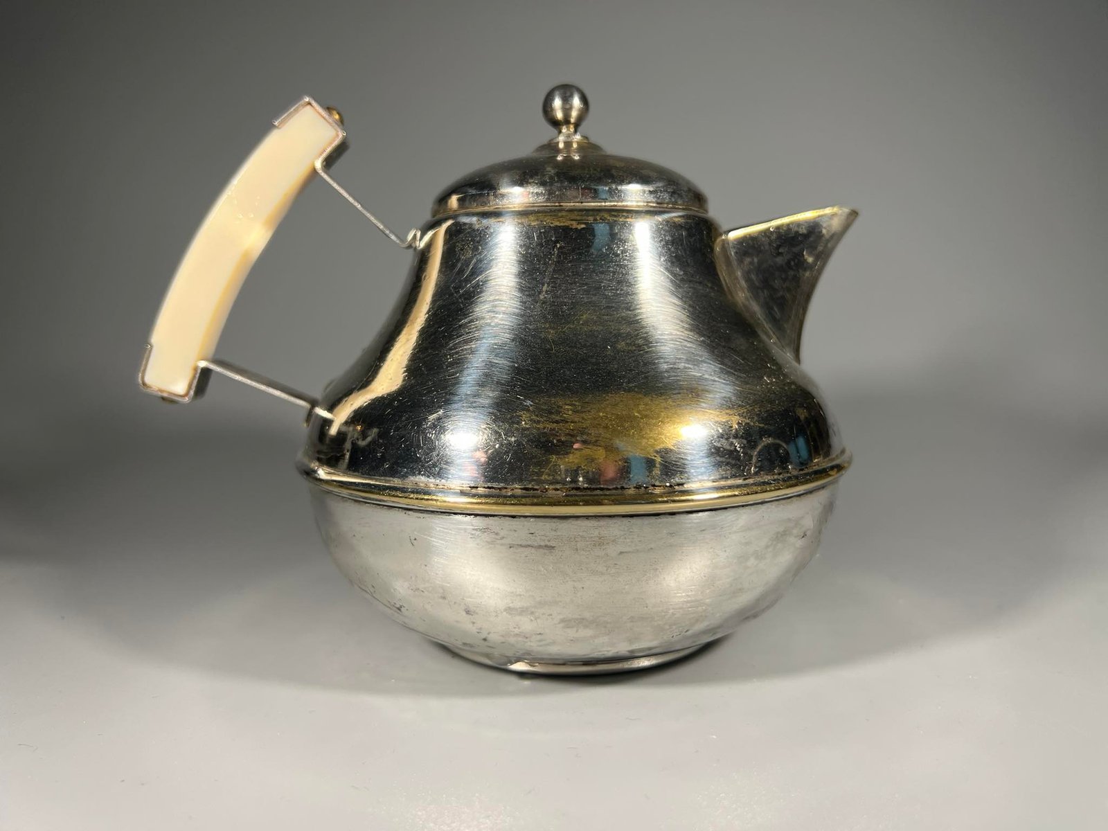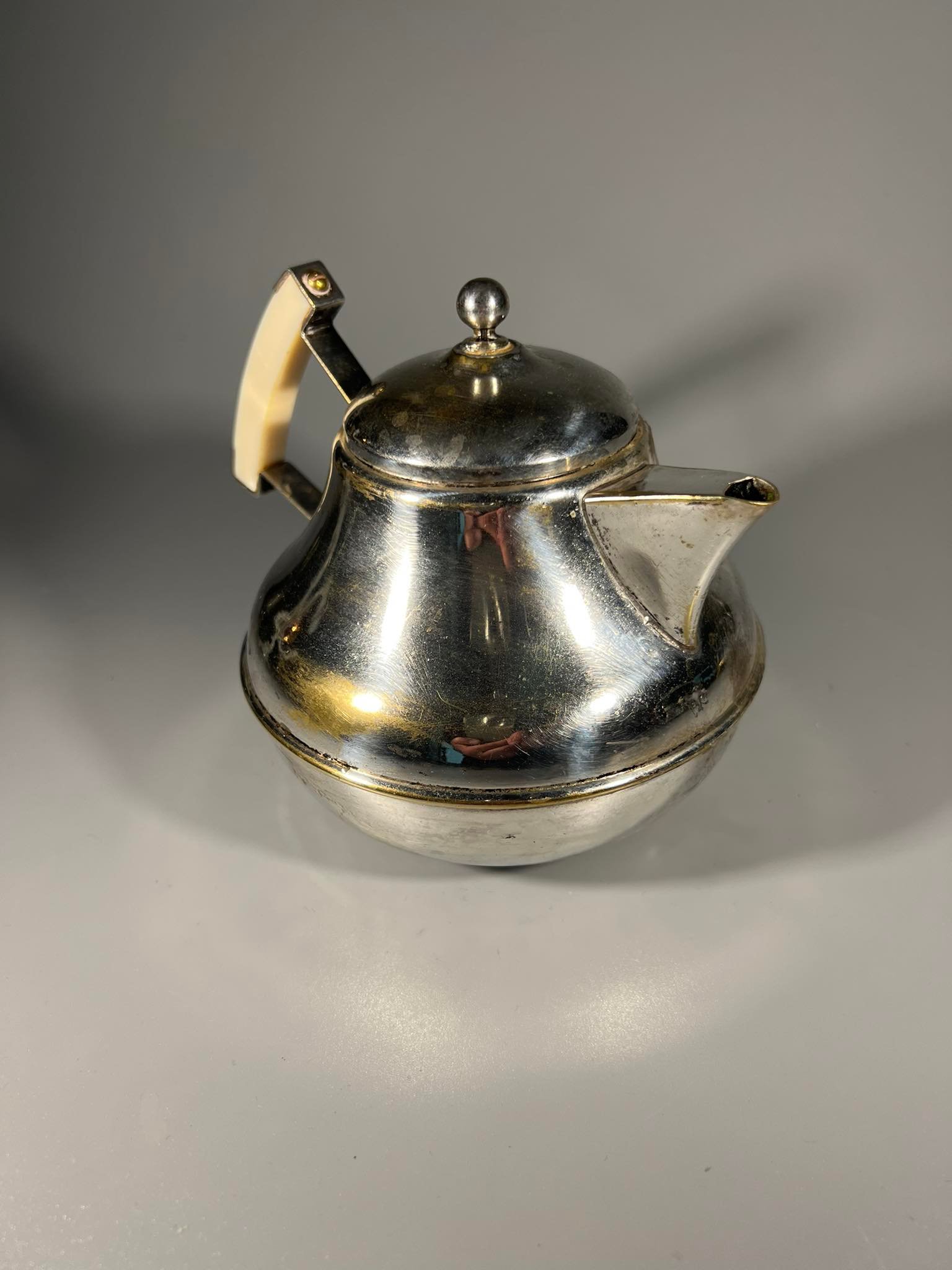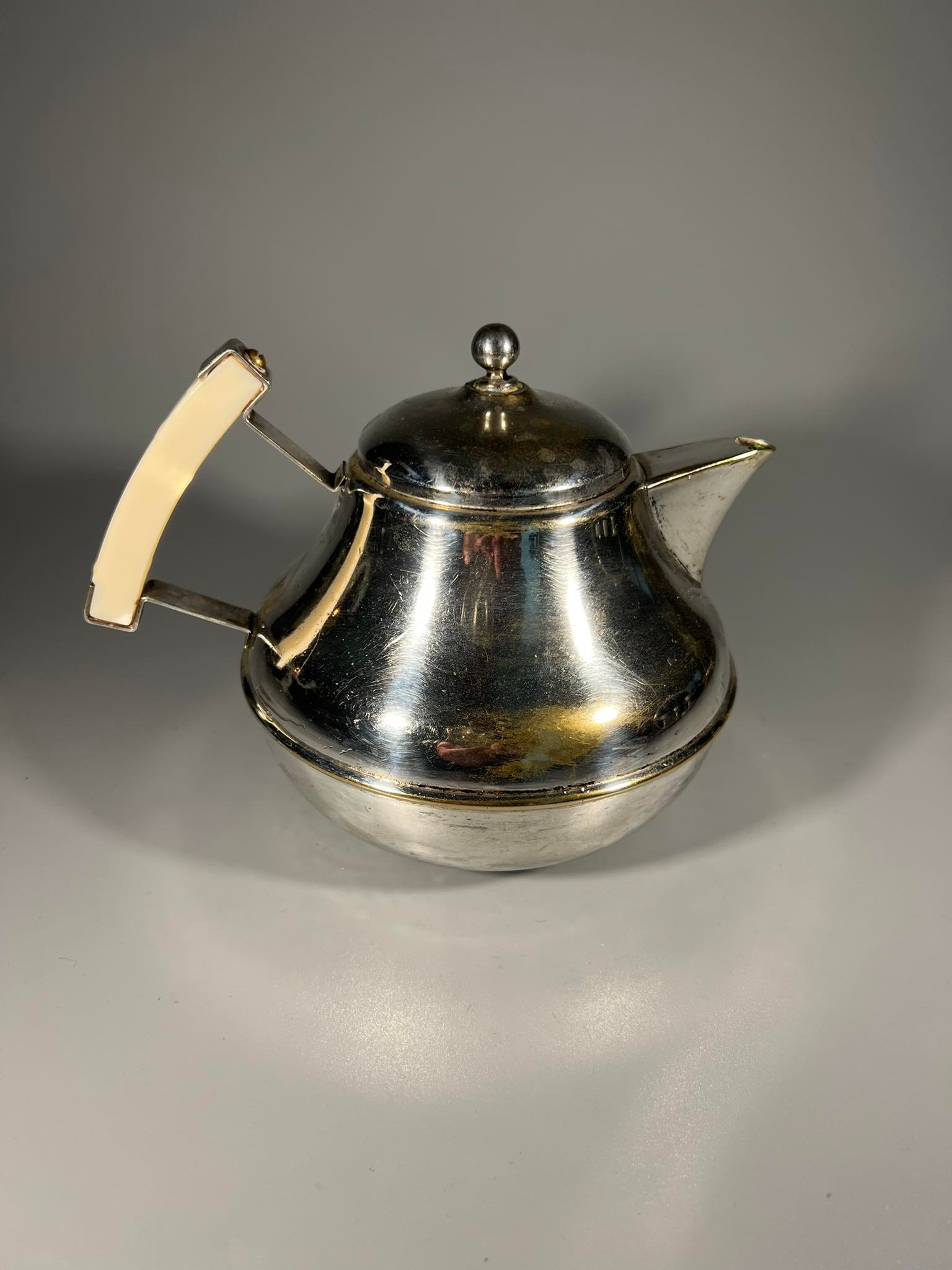 Arbatinukas sidabruotas, antikvarinias, Art Deco stiliaus. Prima N.S. Aukštis 14 cm., skersmuo be rankenos 13 cm. Kaina 26