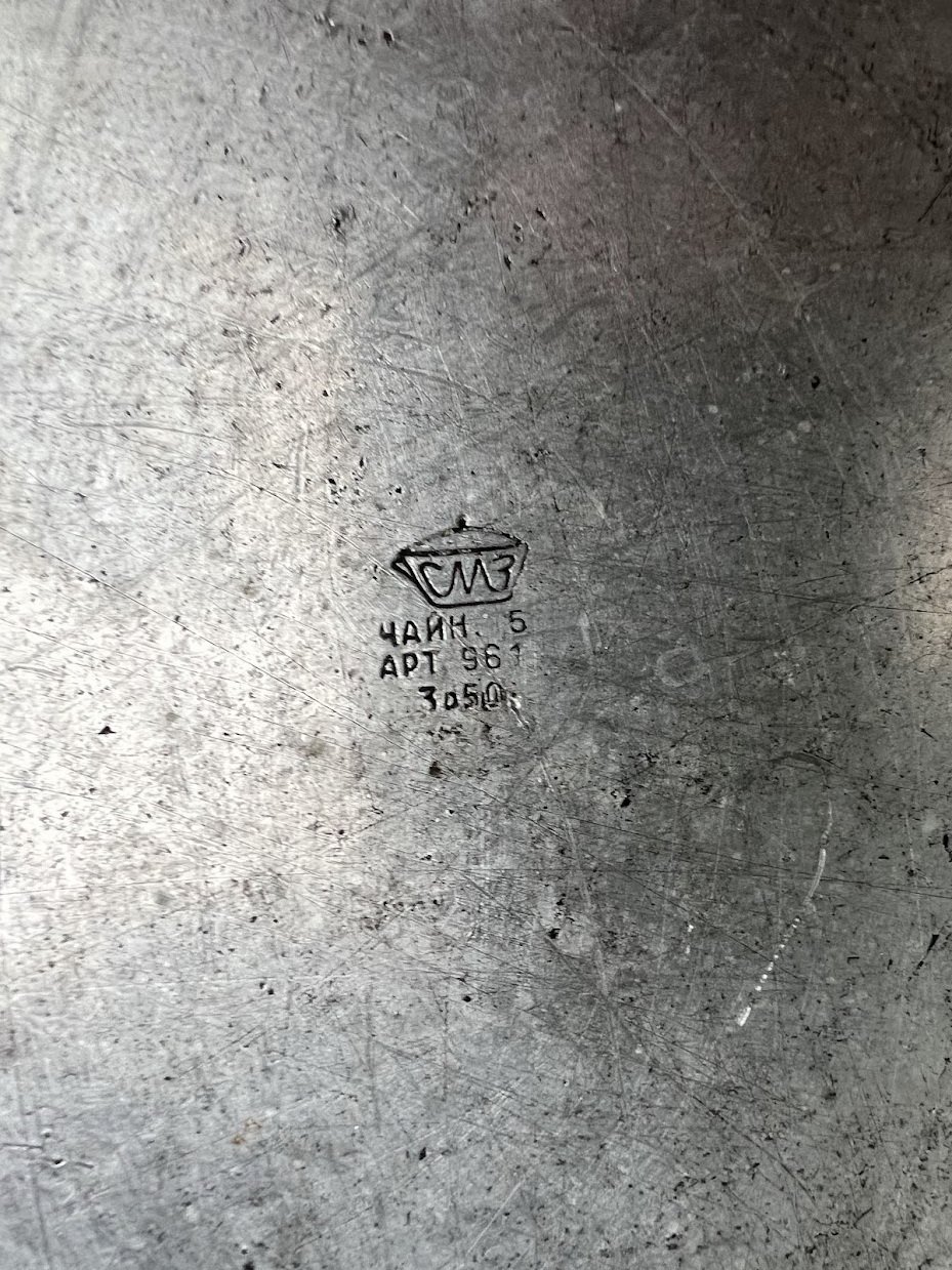 Spaudas: СМЗ – gamyklos krumpliaračio formos logotipas. ЧАЙН. 5 – nurodo, kad tai yra arbatinukas, kurio talpa yra 5 litrai. АРТ 961 – gaminio (prekės) numeris (artikulas).