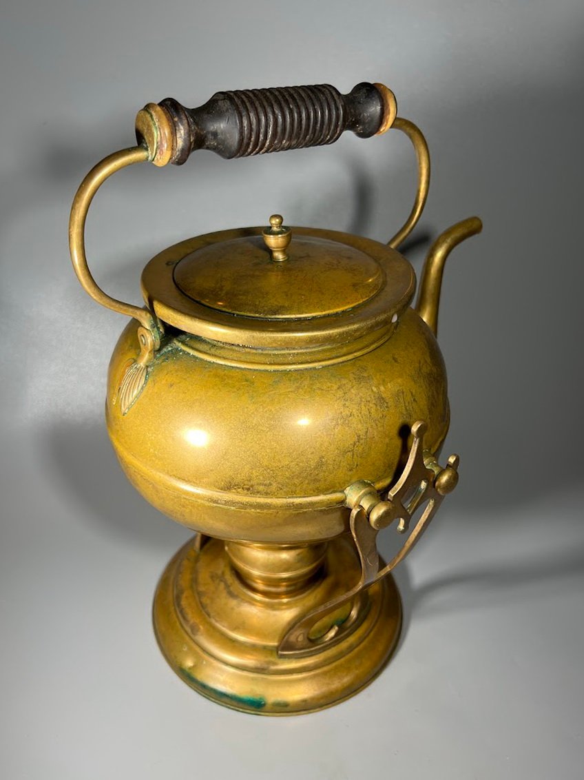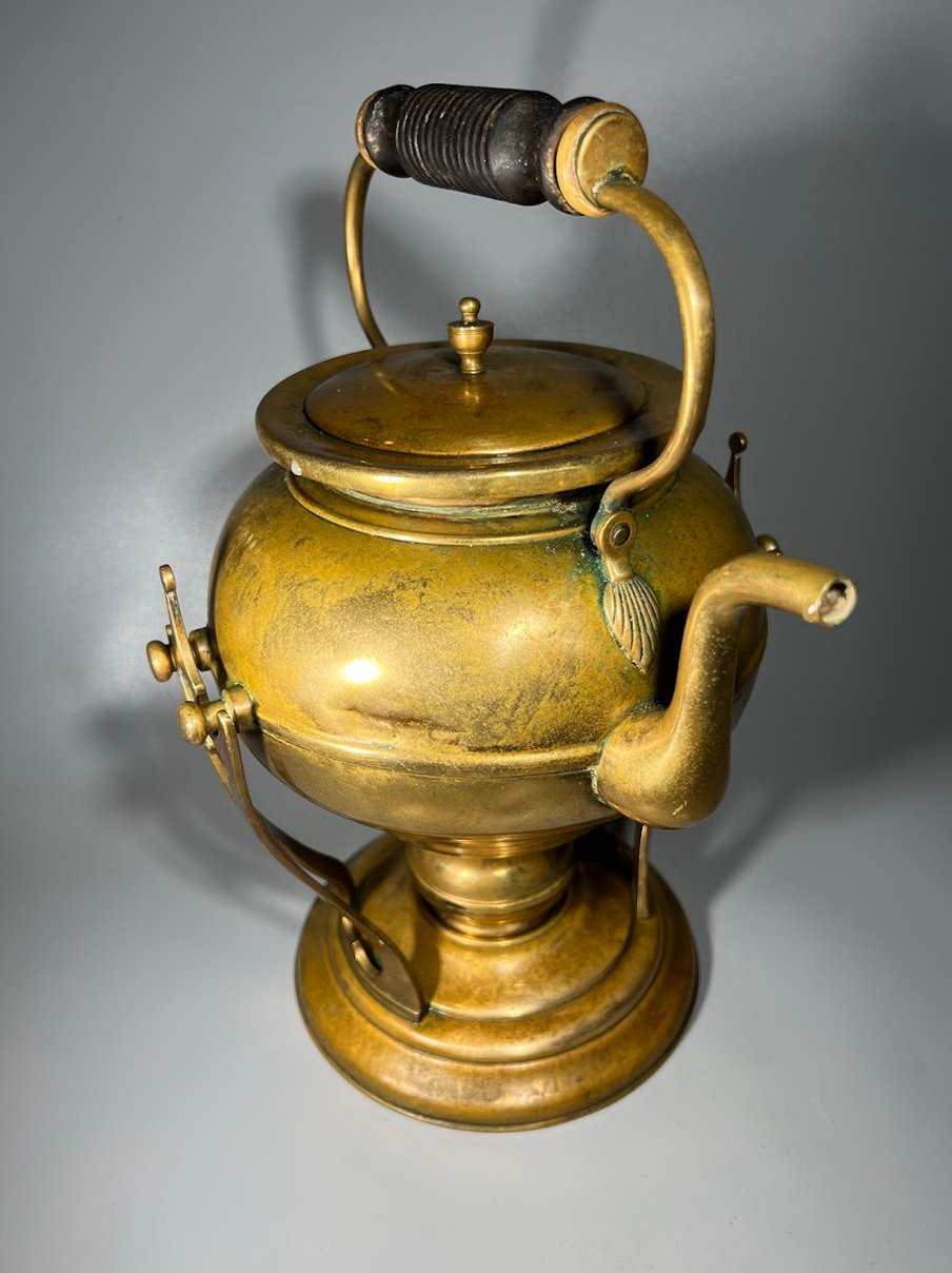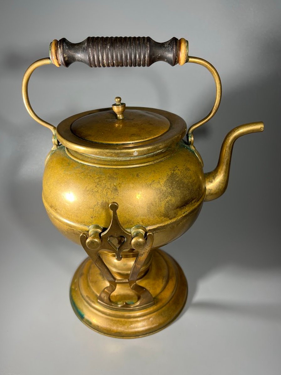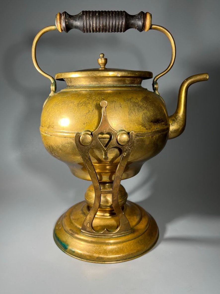 Arbatinukas žalvarinis su stovu ir pakaitinimu, Art Nouveau stiliaus. švediškas, Skultuna, Nr. 3. 1890 – 1910 m. Viso aukštis su rankena 31 cm. Kaina 113