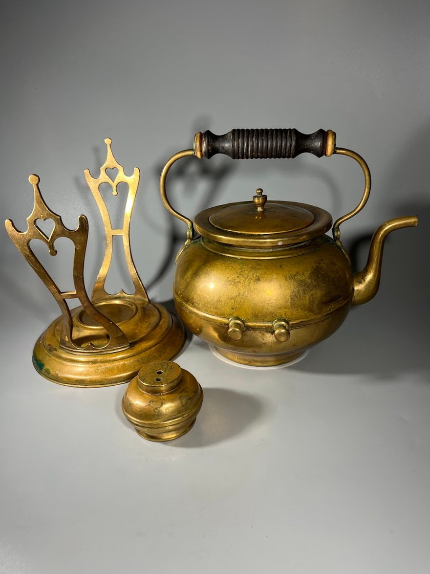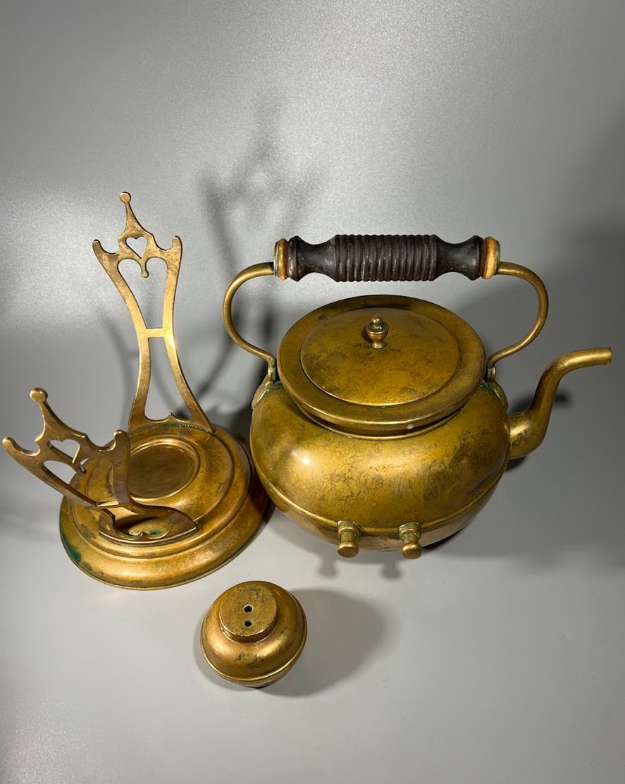 Arbatinukas žalvarinis su stovu ir pakaitinimu, Art Nouveau stiliaus. švediškas, Skultuna, Nr. 3. 1890 – 1910 m. Kaina 113