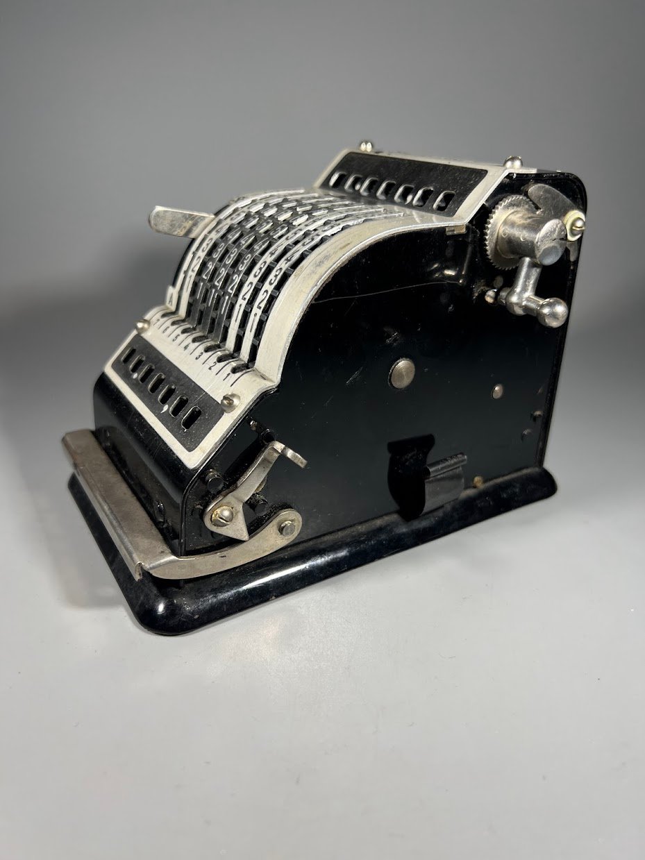 Aritmometras, skaičiuotuvas, mechaninė skaičiavimo mašina Resulta-BS 7, vokiška. 1950–1960 m. Aukštis 11, ilgis 15, plotis 10 cm. Svoris 1,6 kg. Kaina 58