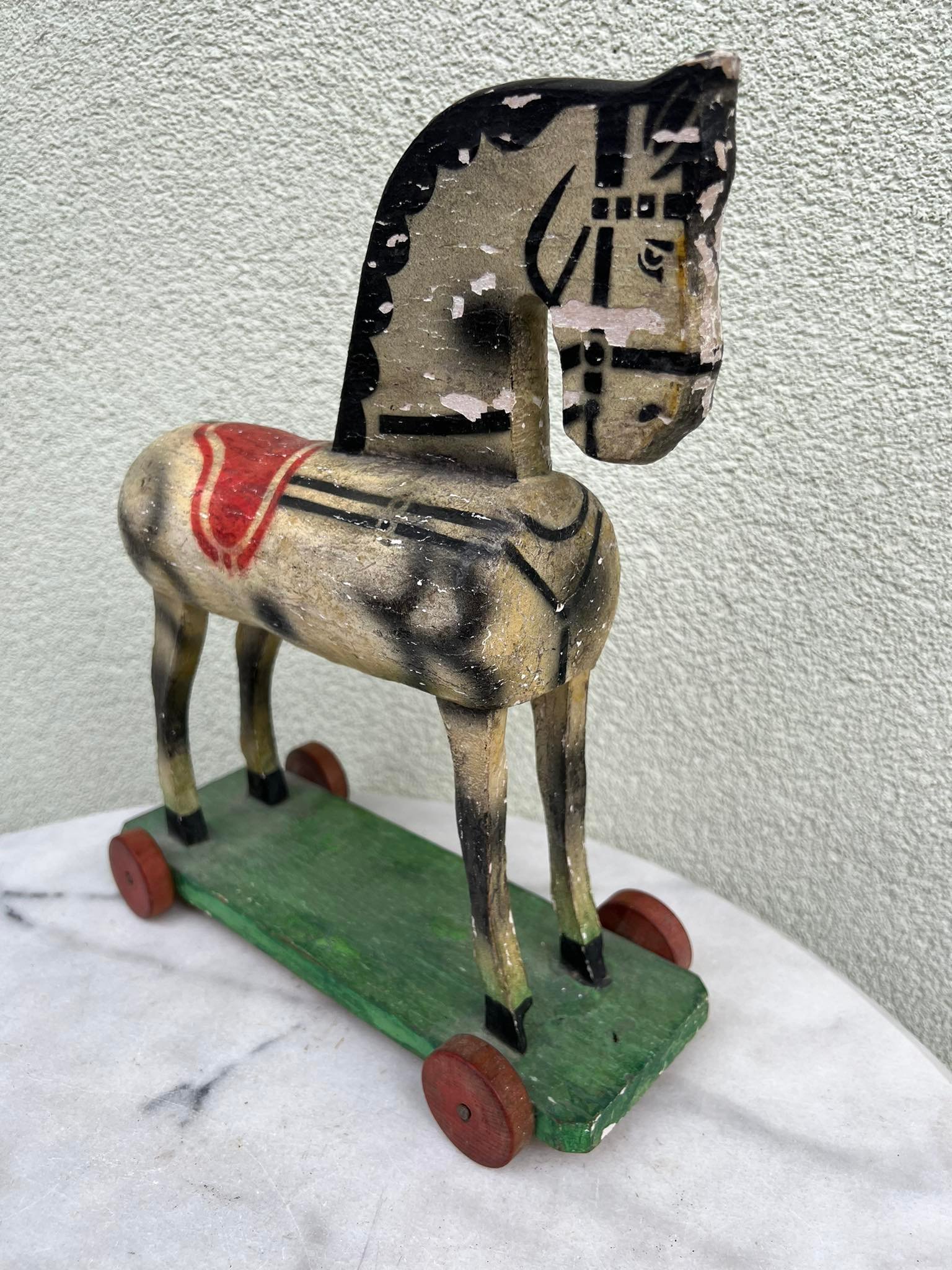 Arkliukas medinis su ratukais. antikvarinis. Aukštis 33, ilgis 28, plotis 12 cm. Kaina 53