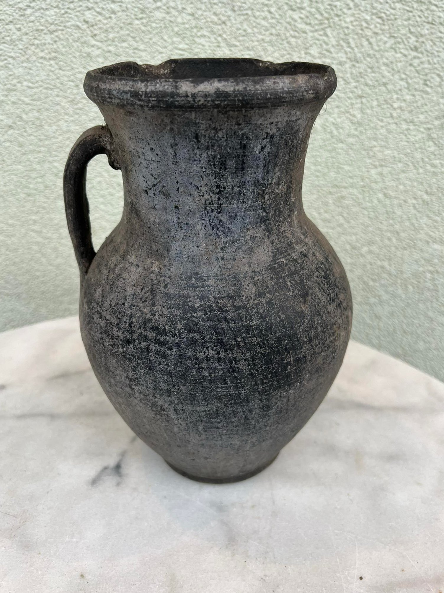 Ąsotis molinis, keraminis, juodo molio antikvarinis su skyle šone. Aukštis 25 cm. Kaina 38