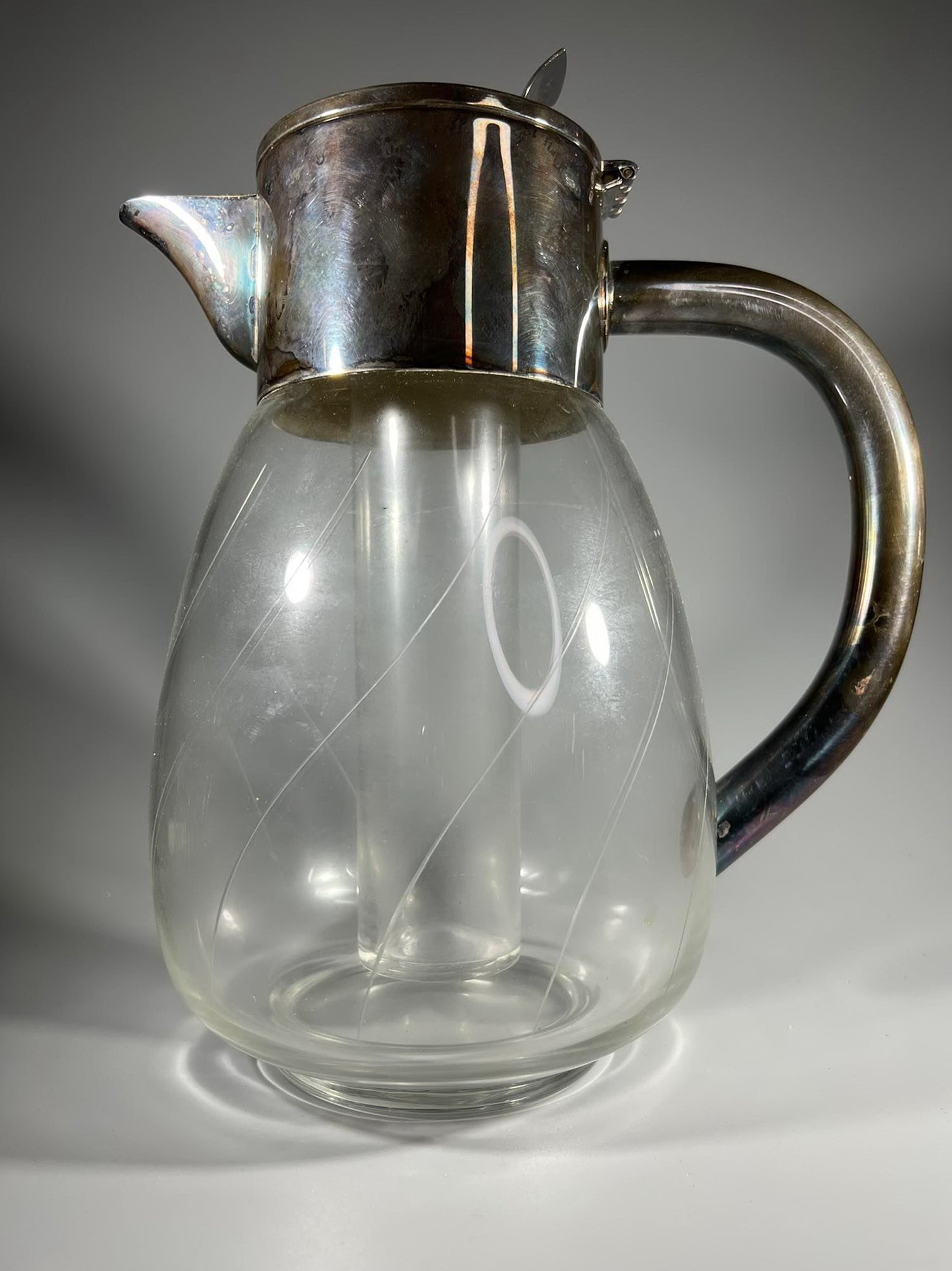 Ąsotis su šaldymo indu sidabruotas, antikvarinis, raižytu stiklu. Gamintojas WMF (Württembergische Metallwarenfabrik) Vokietija. Aukštis 28, apatinis skersmuo 17 cm. Kaina 87