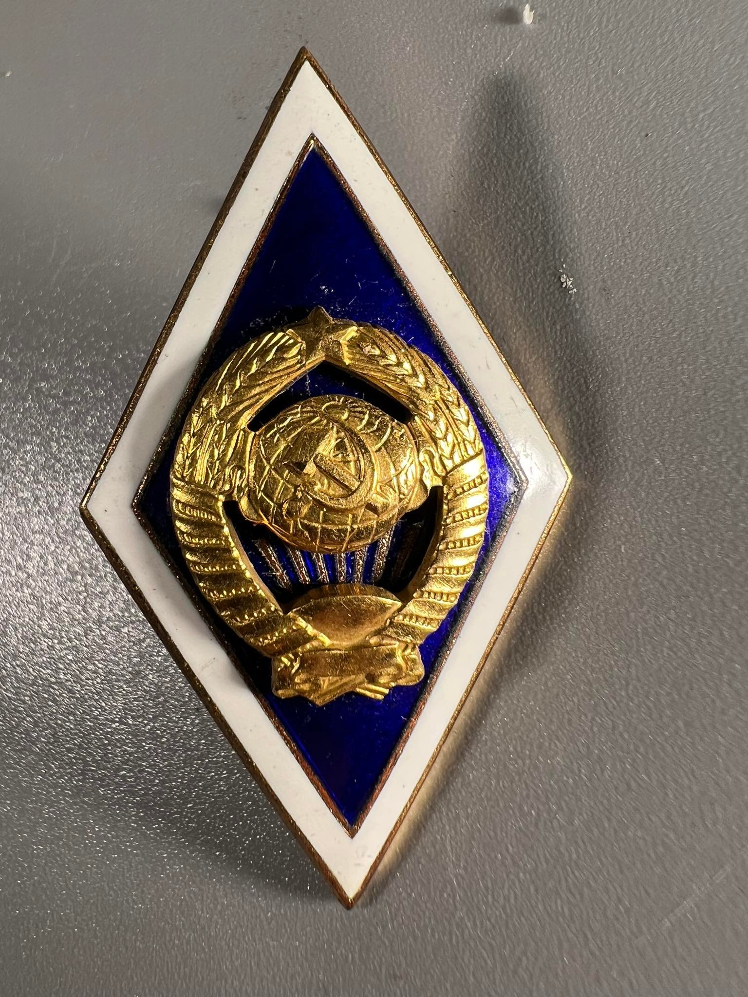 Aukštojo mokslo baigimo ženklelis, rombas sovietinis, tarybinių laikų. Kaina 13