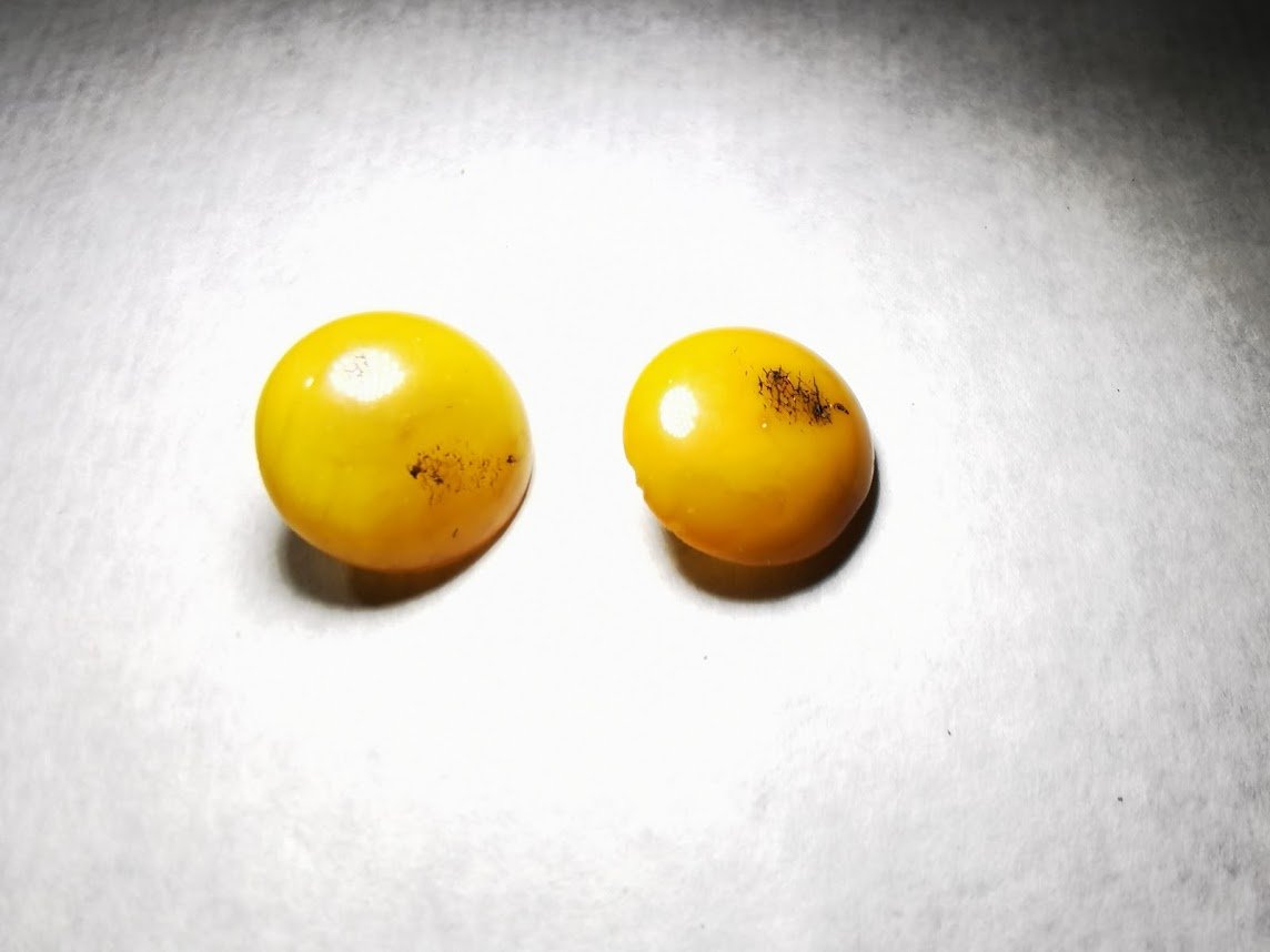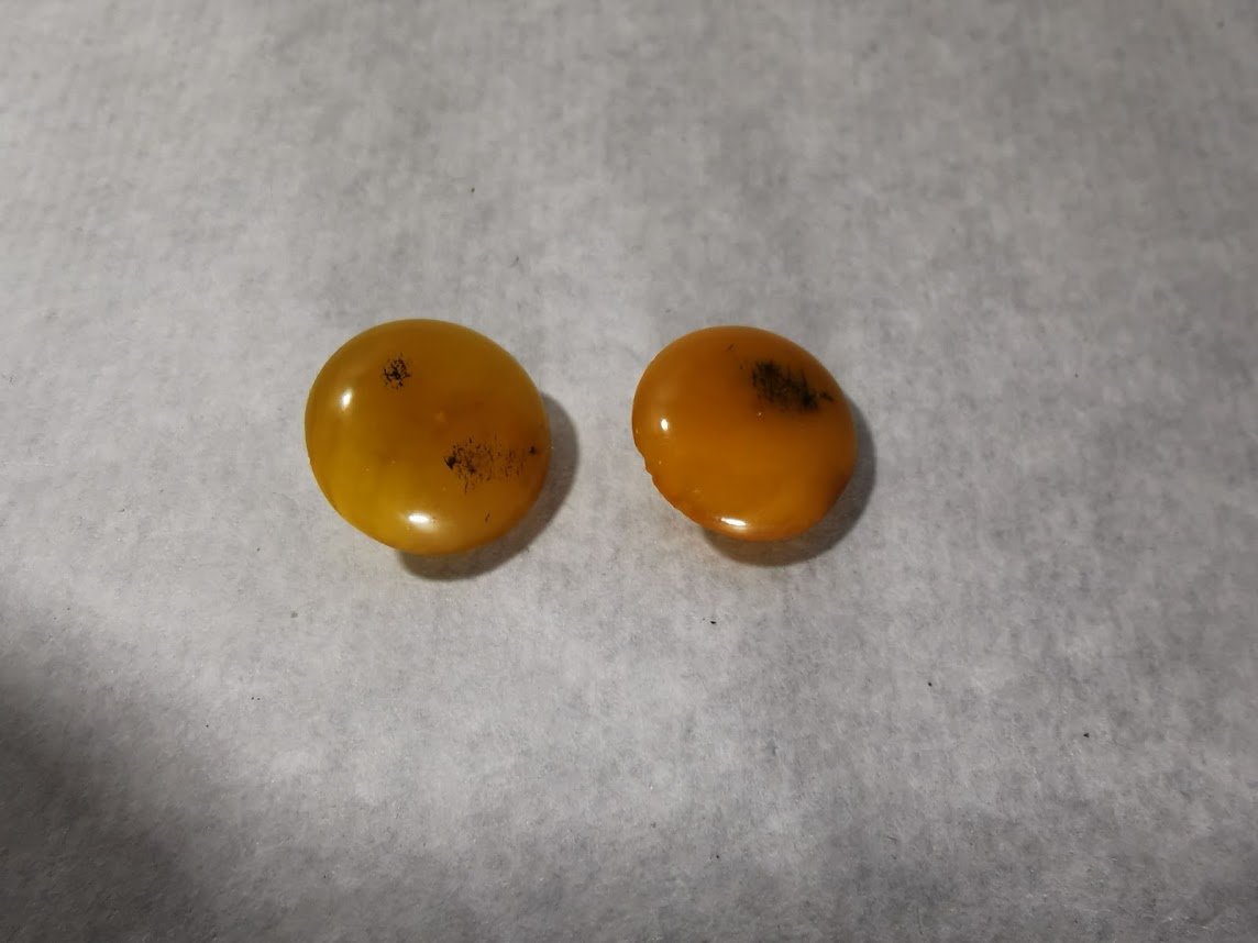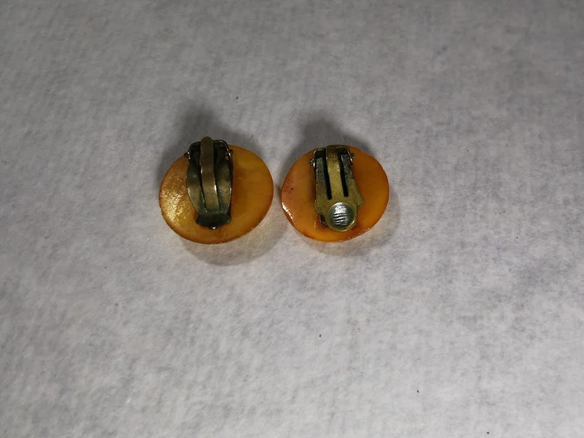 Auskarai gintariniai užsegami, užspaudžami, klipsai vintažiniai. Skersmuo 2,5 cm. Kaina 26