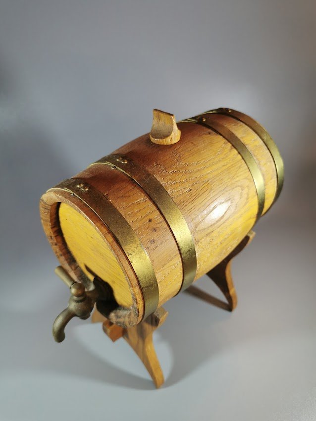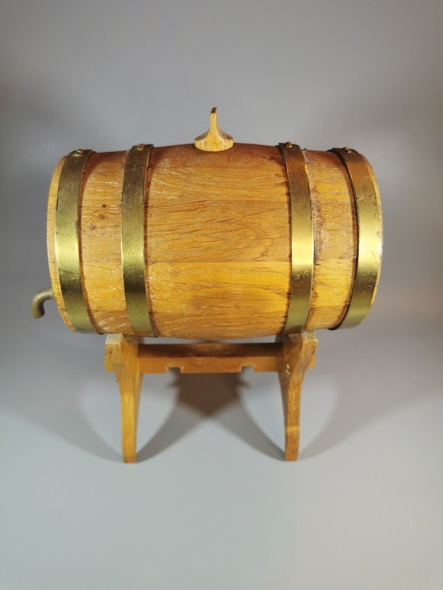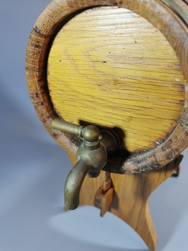 Bačkutė ąžuolinė su stovu ir metaliniu veikiančiu čiaupu. Tinkama naudoti pagal paskirtį. Bačkutės ilgis 17, skersmuo 12 cm. Aukštis su stovu 21 cm. Kaina 43