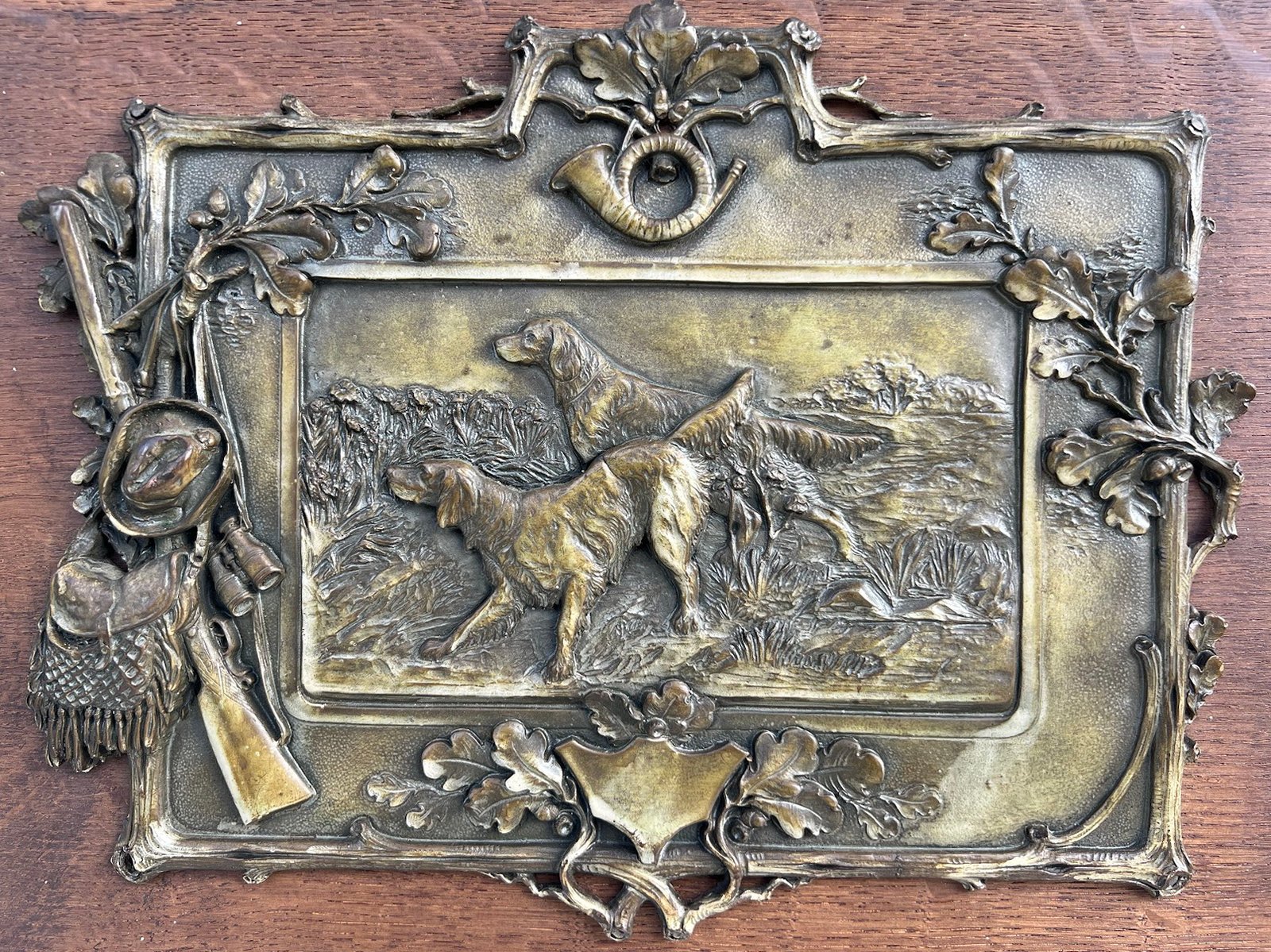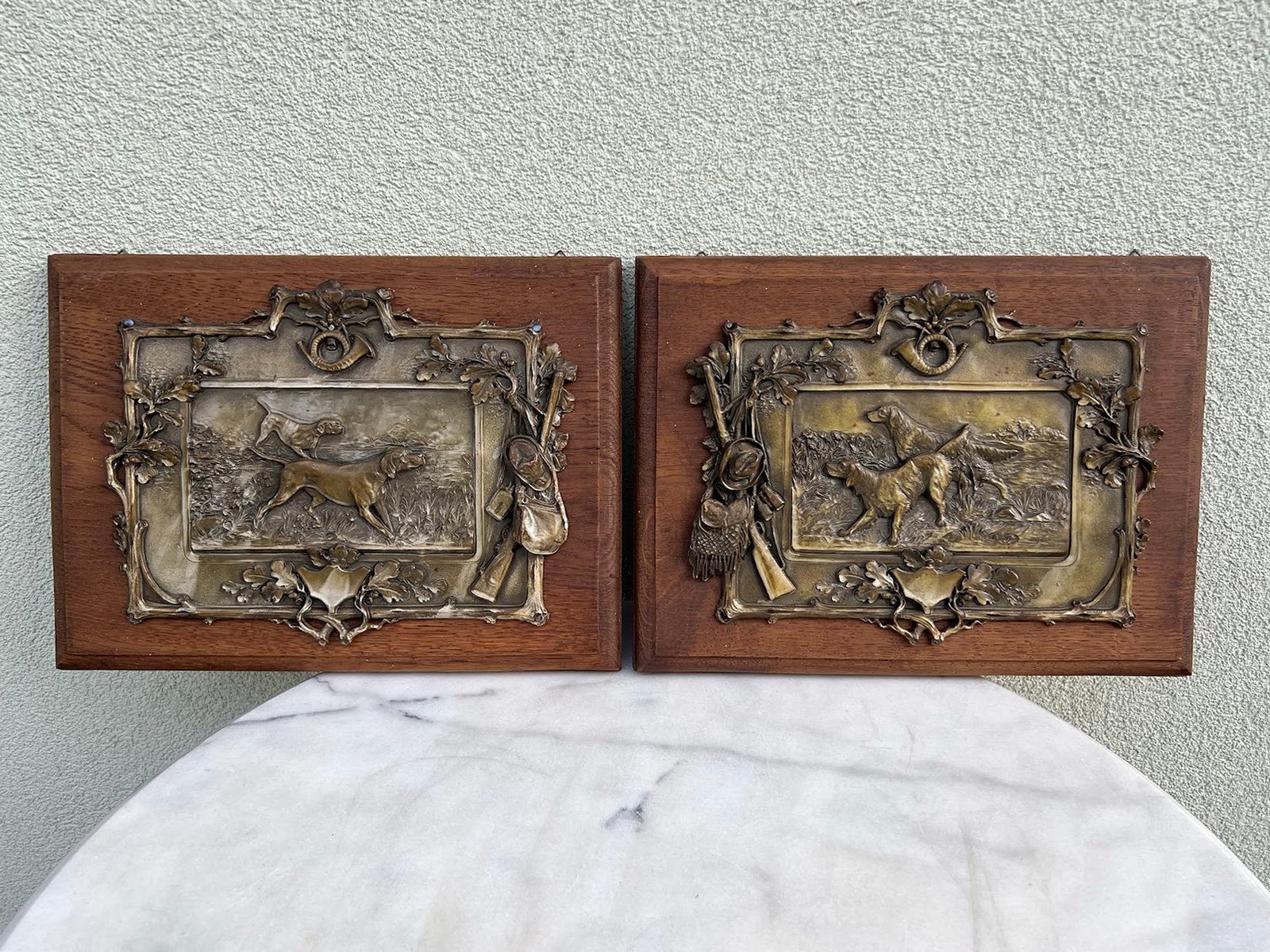 Bareljefai, pano medžioklės tema Medžiokliniai šunys. Alavas, ąžuolinė lenta. 2 vnt. Kaina po 133