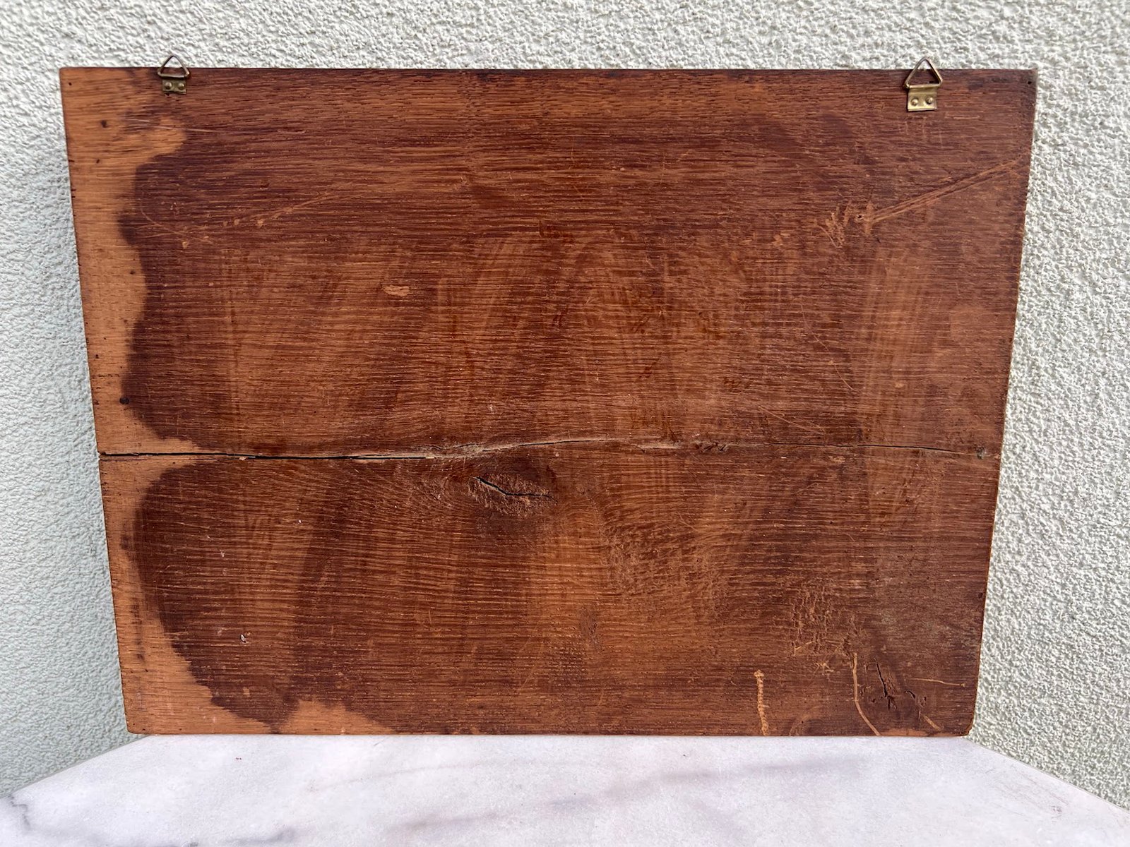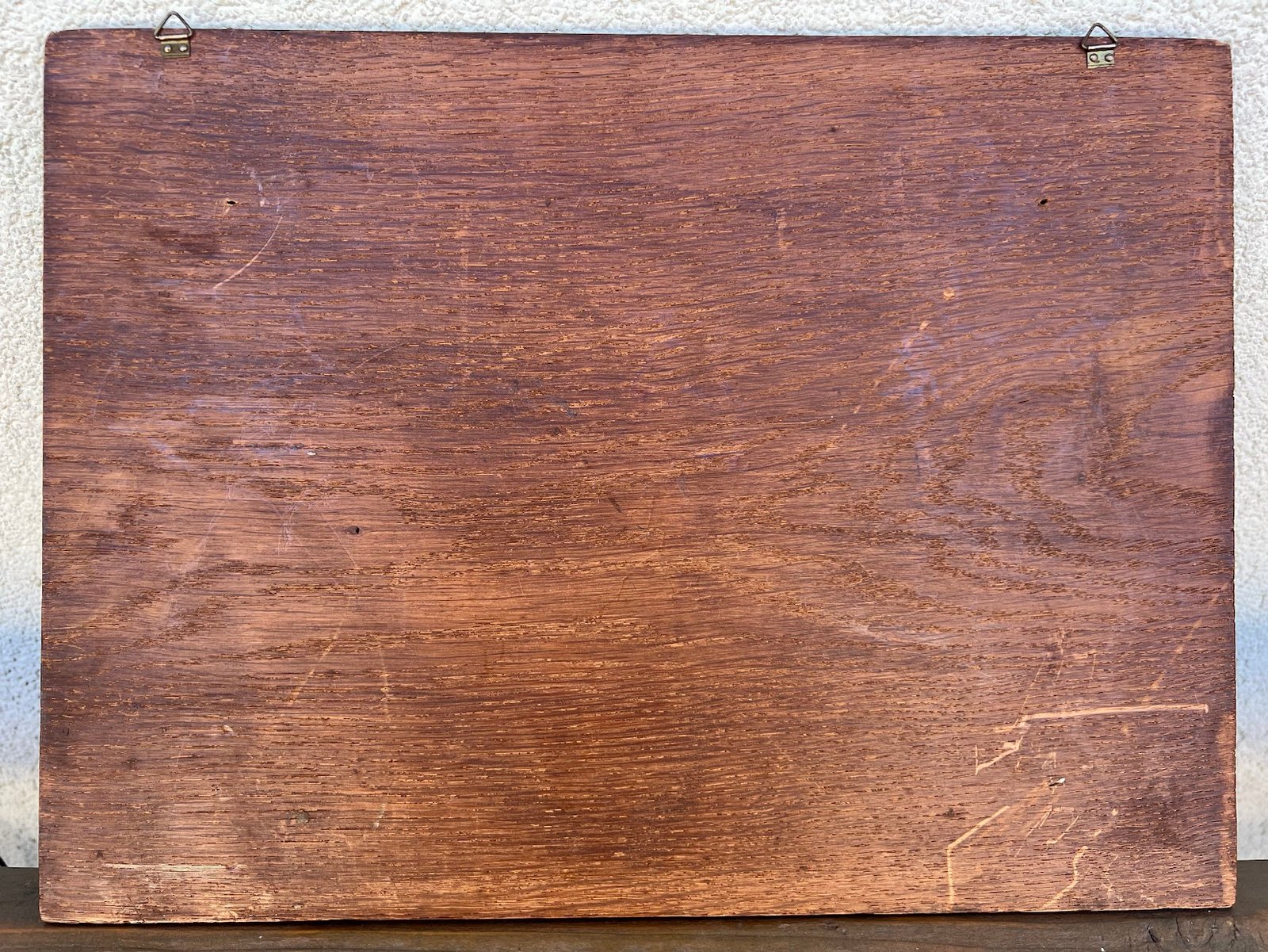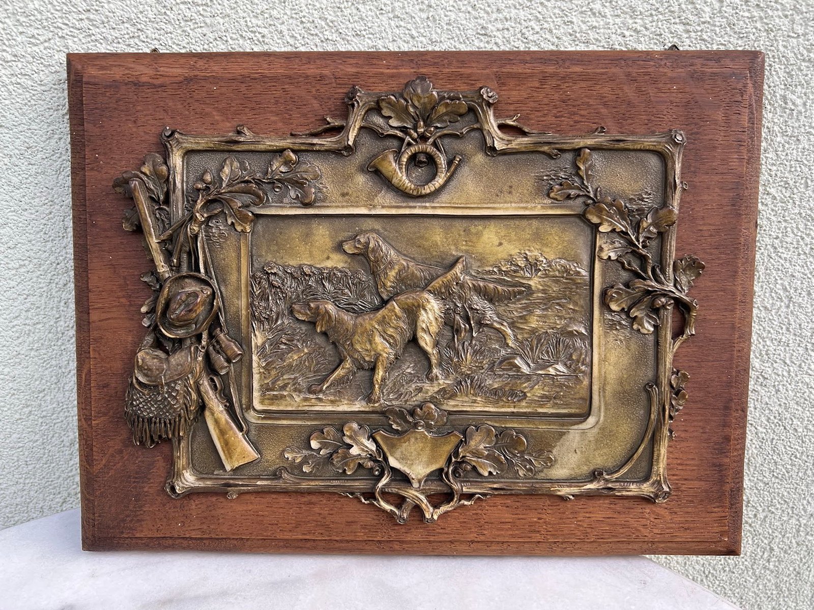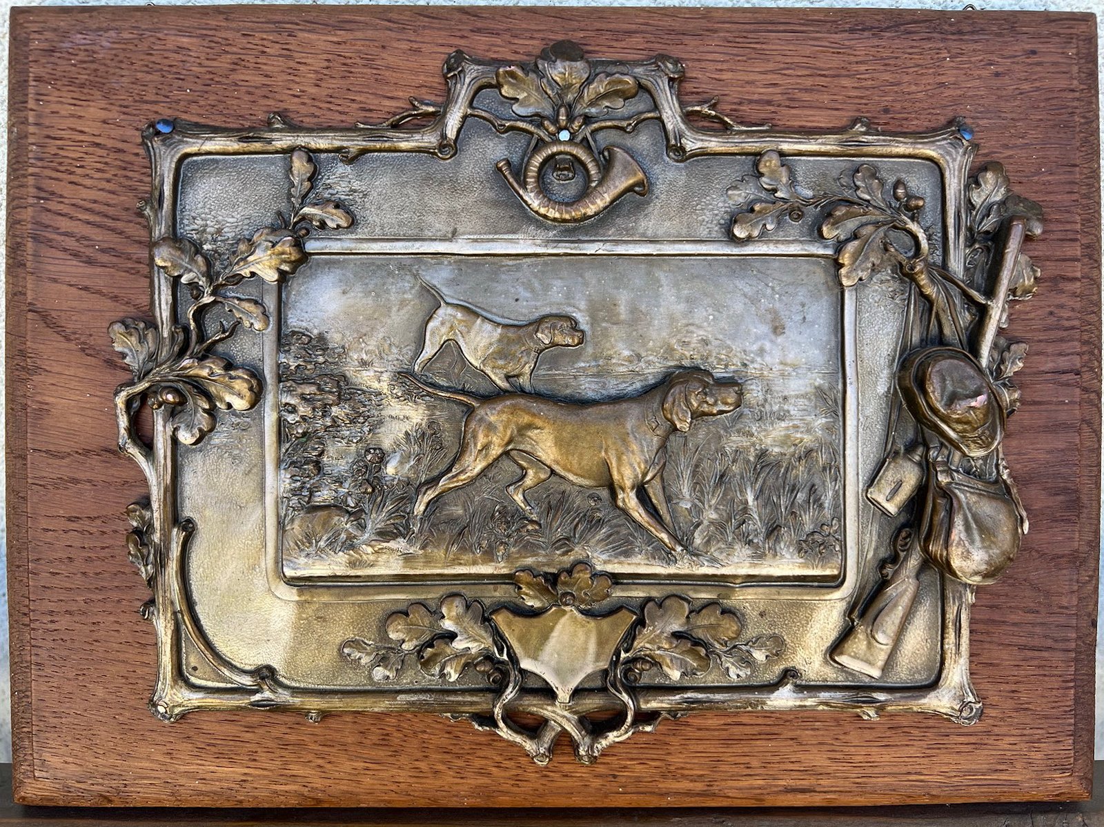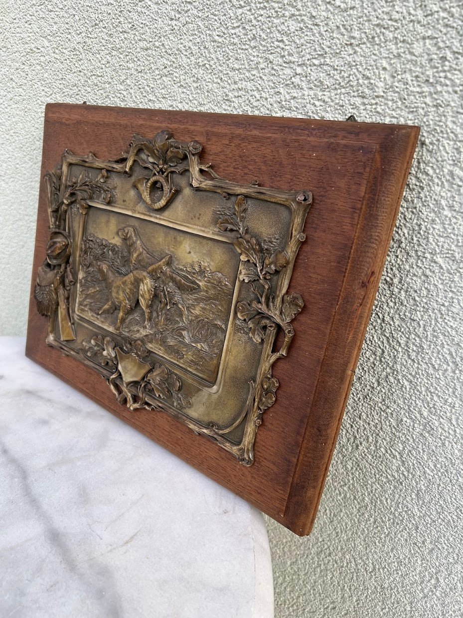 Abu pano su su medžioklinio šuns atvaizdu centre ir įvairiomis su medžiokle susijusiomis dekoracijomis kraštuose, pritvirtintas prie ąžuolinės lentos.