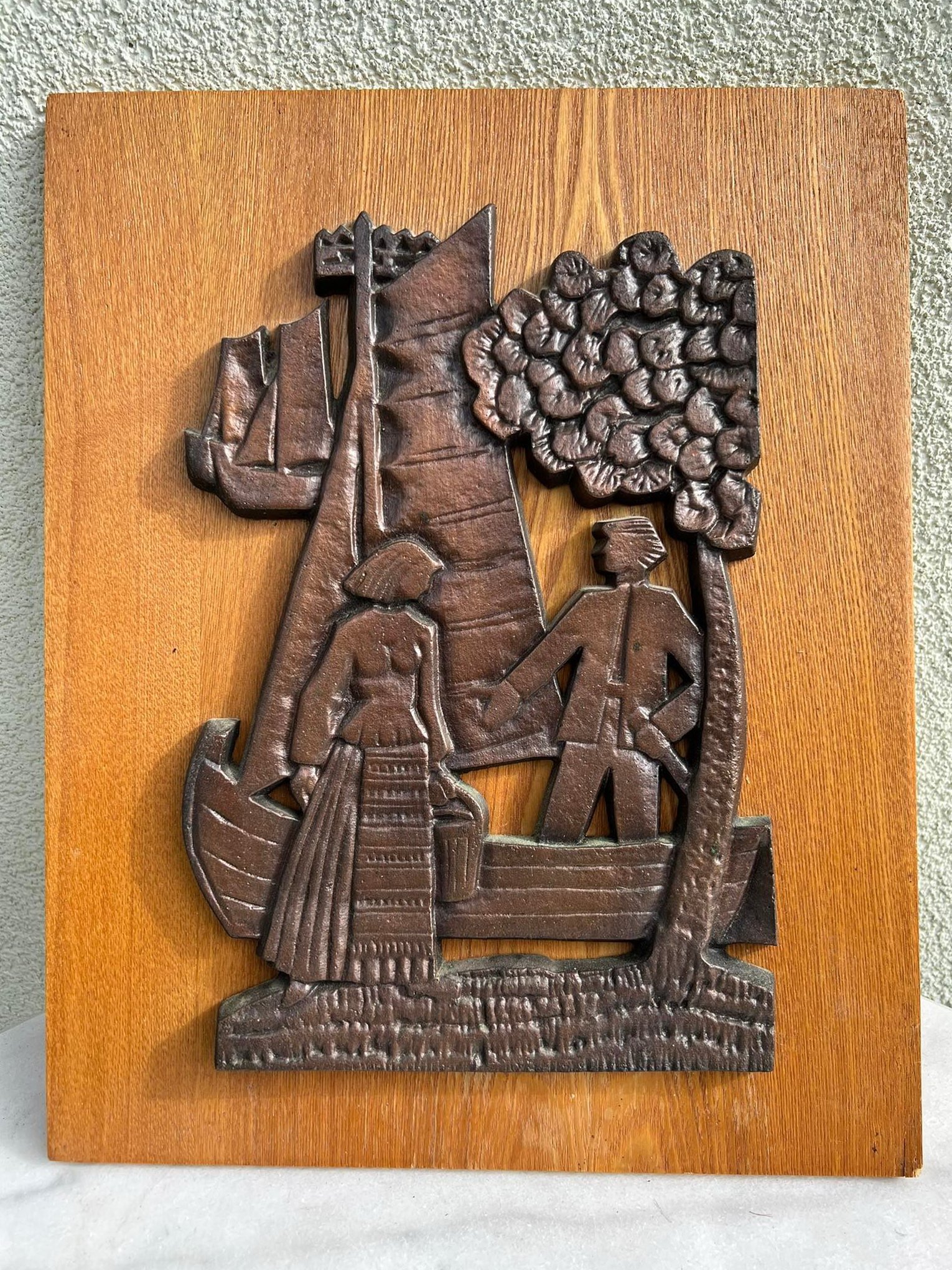 Bareljefas Sėsk mergele į laivelį. Lietuvos TSR VPM gamykla Metalistas. Kaunas, L. Adomausko g. 34. Sovietinis, tarybinių laikų. Lentelės dydis: 20 x 37 cm. Kaina 43