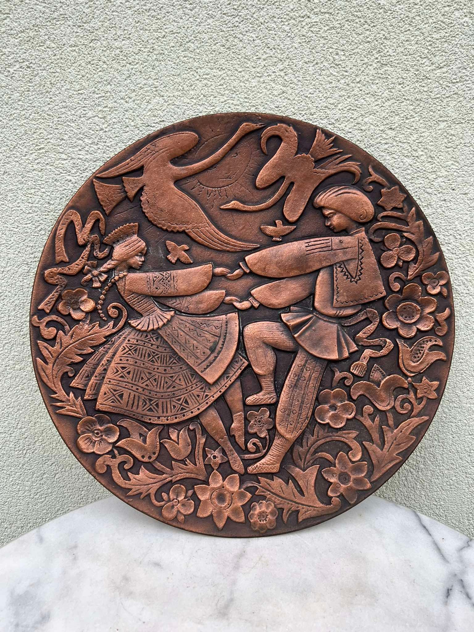Bareljefas Šokėjai. Kauno dailė. Metaloplastika. Skersmuo 42 cm. Signatūra K. Tulienė. 1969 m. Būklė labai gera. Kaina 153