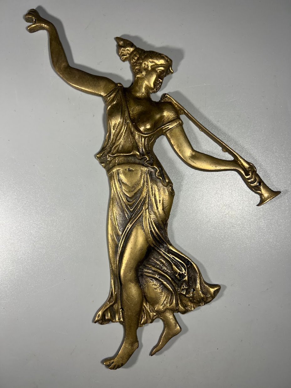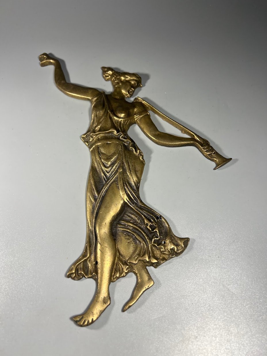 Bareljefas žalvarinis graikų mūza, džiaugsmo deivė. Aukštis 25 cm. Kaina 43