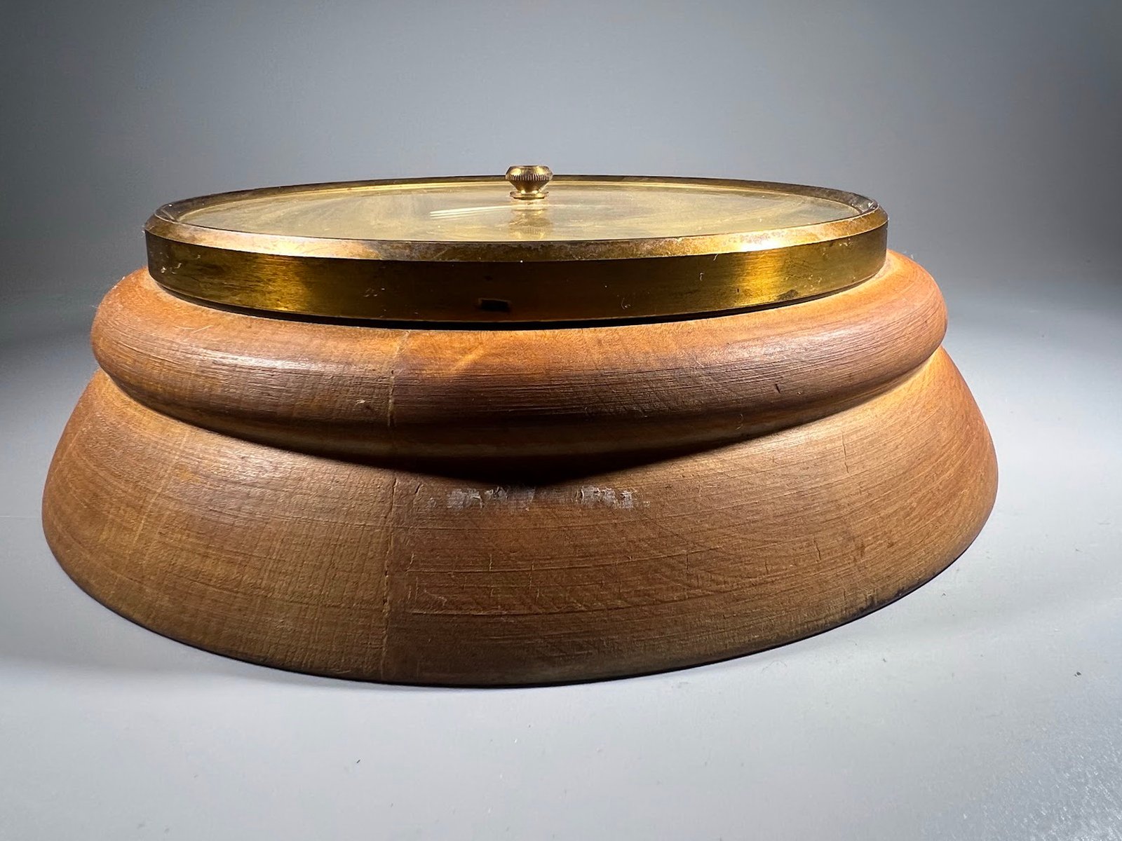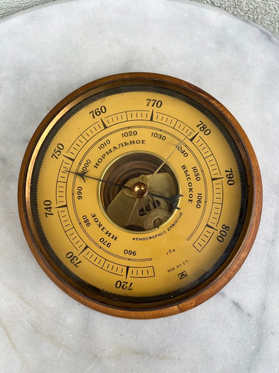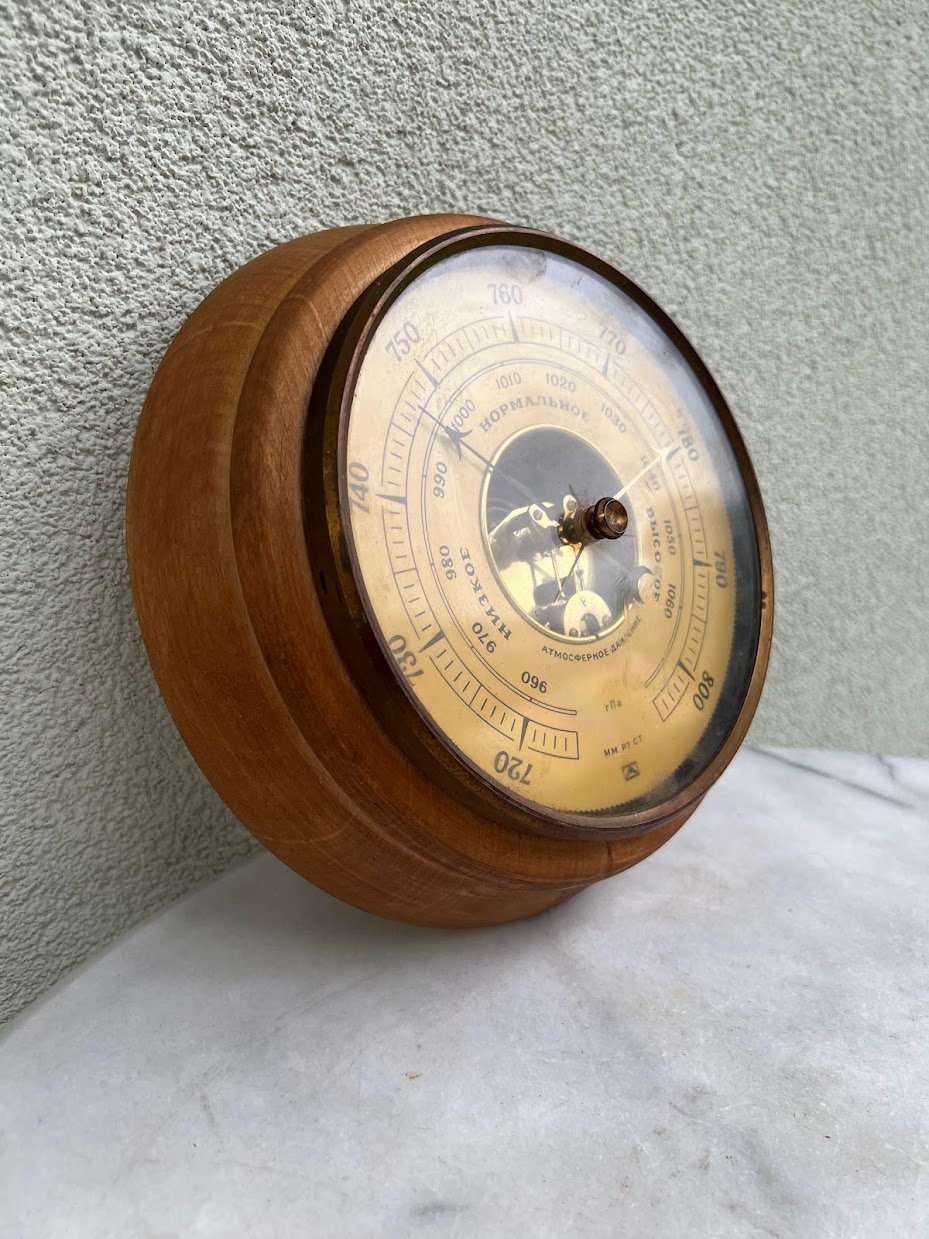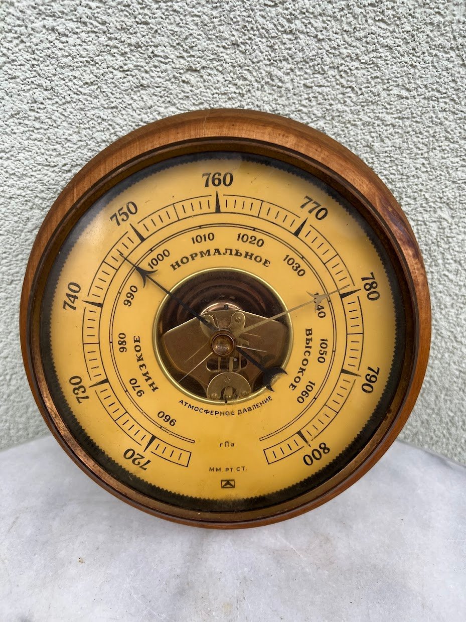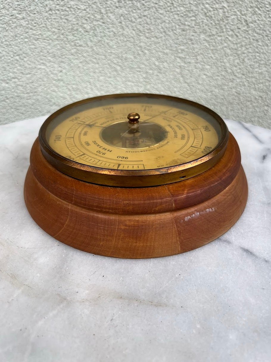 Barometras sovietinis, tarybinių laikų, didelis. Барометр БК-С ГПа. СССР. 1950-1980 m. Veikiantis. Pagrindas medinis. Pagrindo skersmuo 23, ciferblato skersmuo 17 cm. Storis 7 cm. Kaina 78