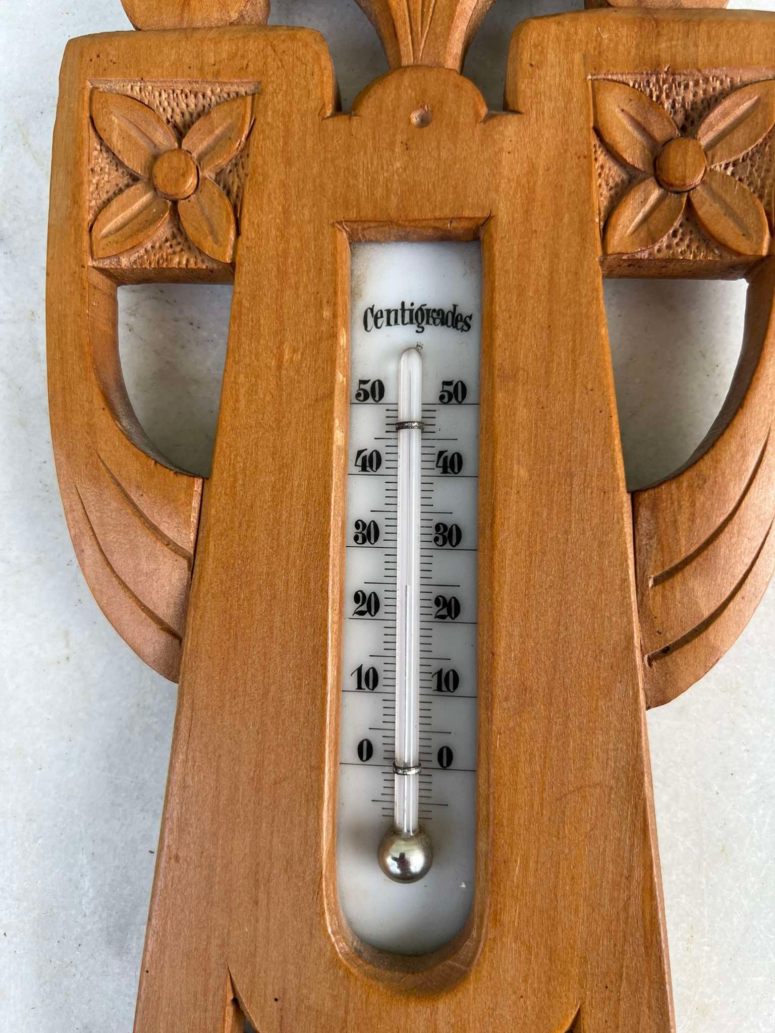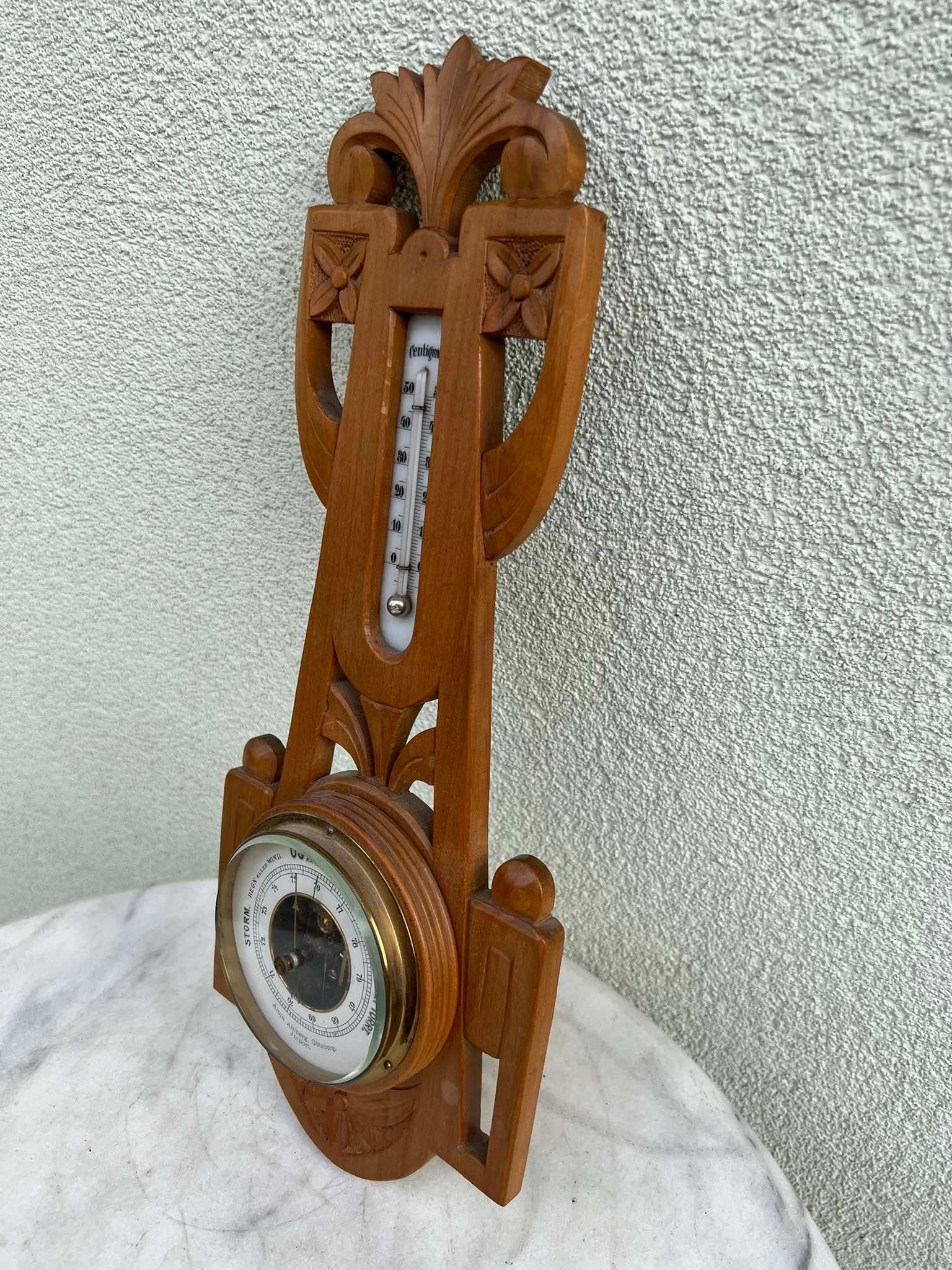 Barometras, termometras antikvarinis, Art Deco stiliaus, tarpukario laikų. Aukštis 50, plotis 18 cm. Kaina 53