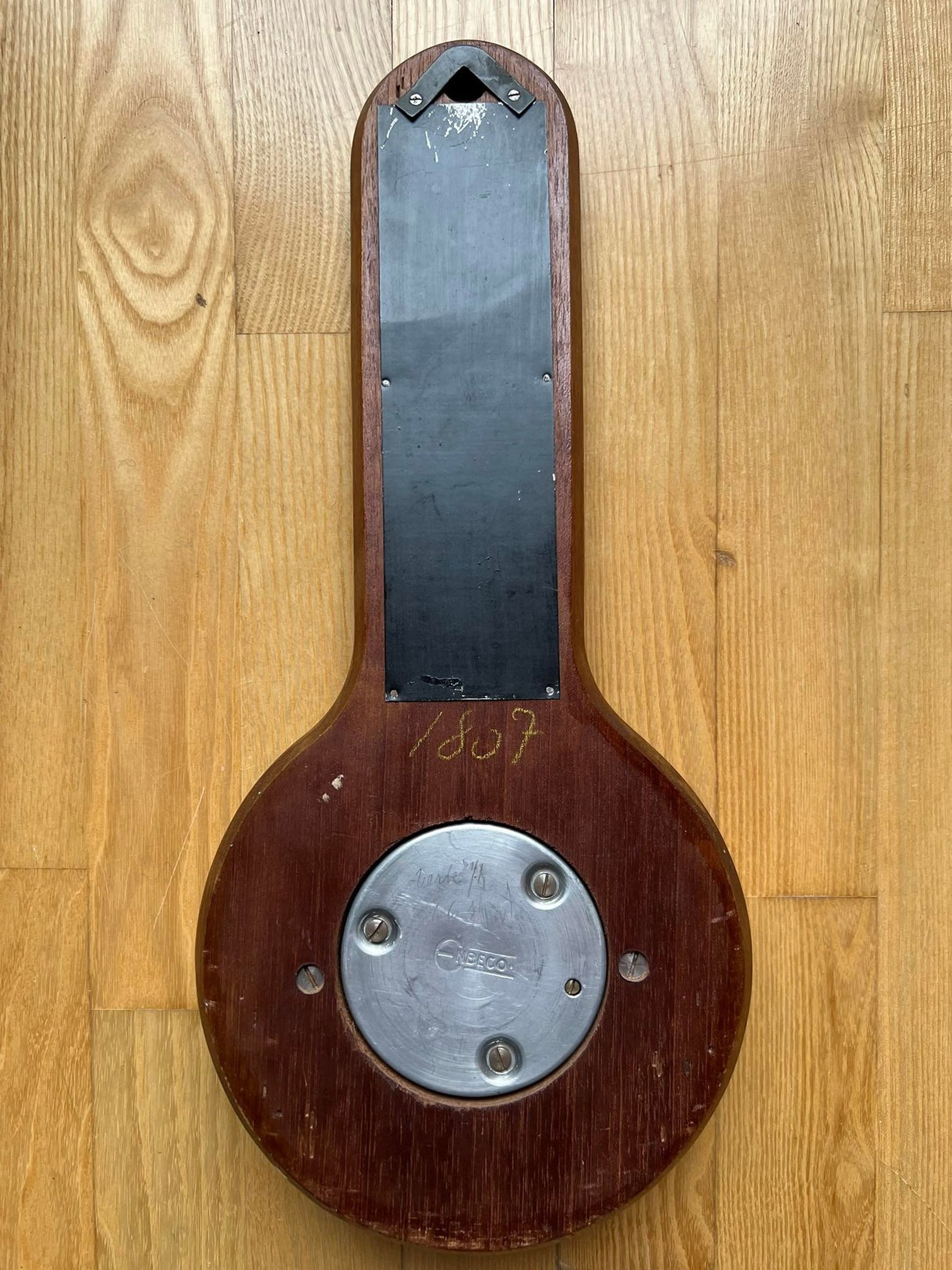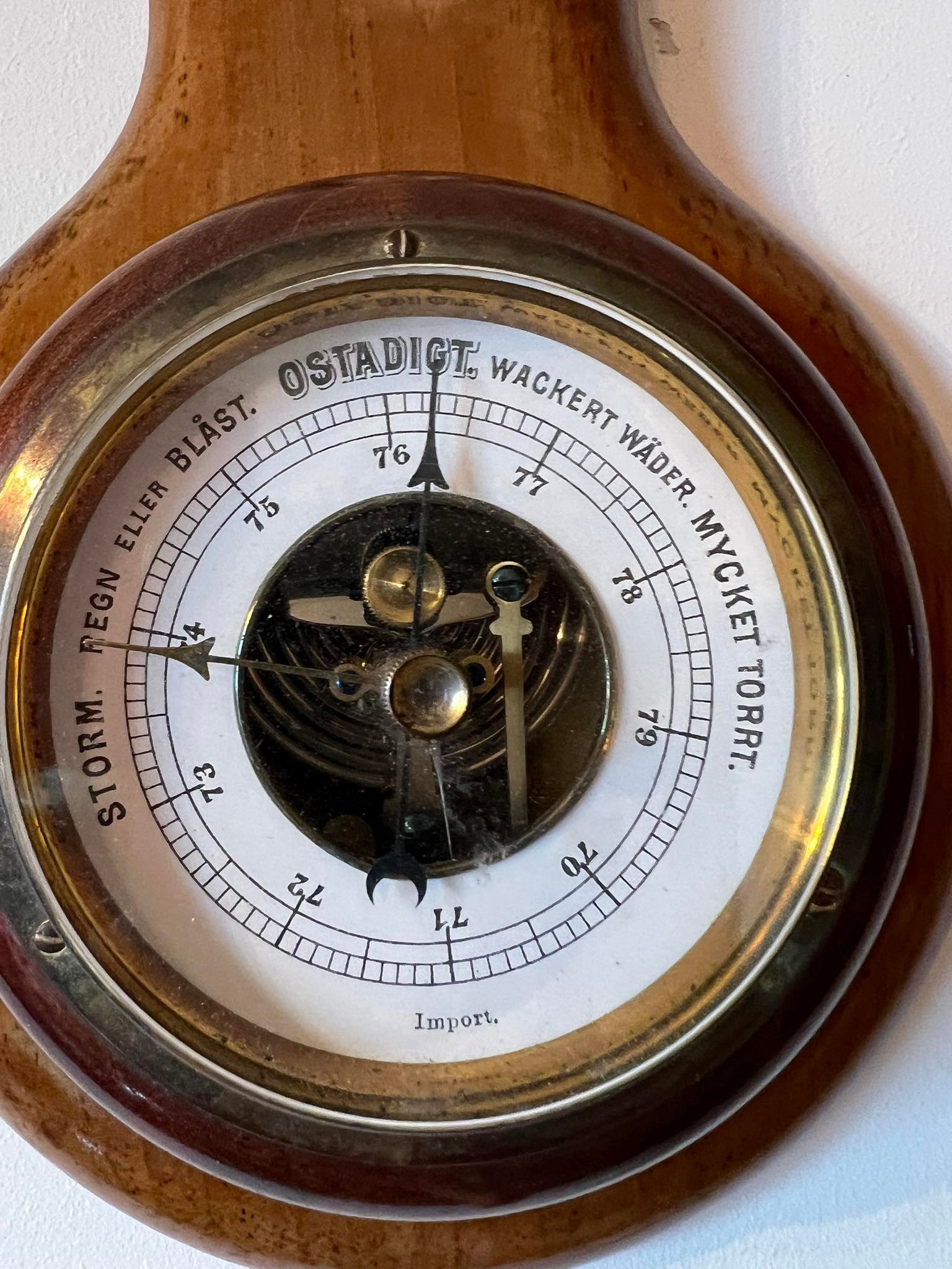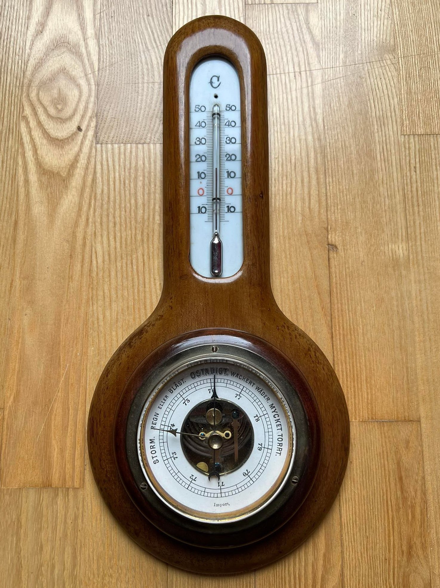 Barometras, termometras antikvarinis, medinis. Veikiantis, tikslumo negarantuoju. Aukštis 34, plotis 15 cm. Kaina 38