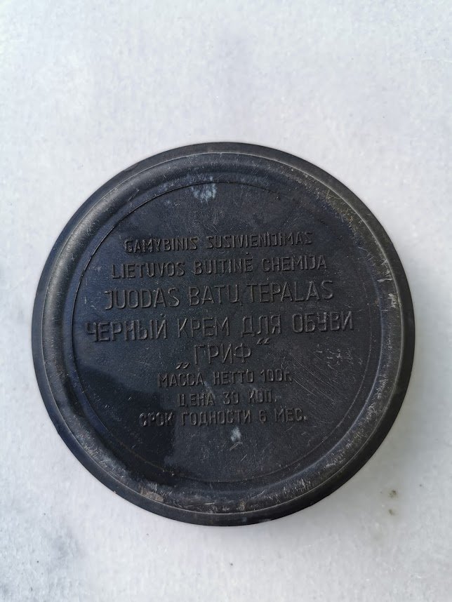 Batų tepalas juodas GRIFAS. Gamybinis susivienijimas Lietuvos buitinė chemija. Cena 30 kop. Skersmuo 9,5, aukštis 3 cm. Kaina 10