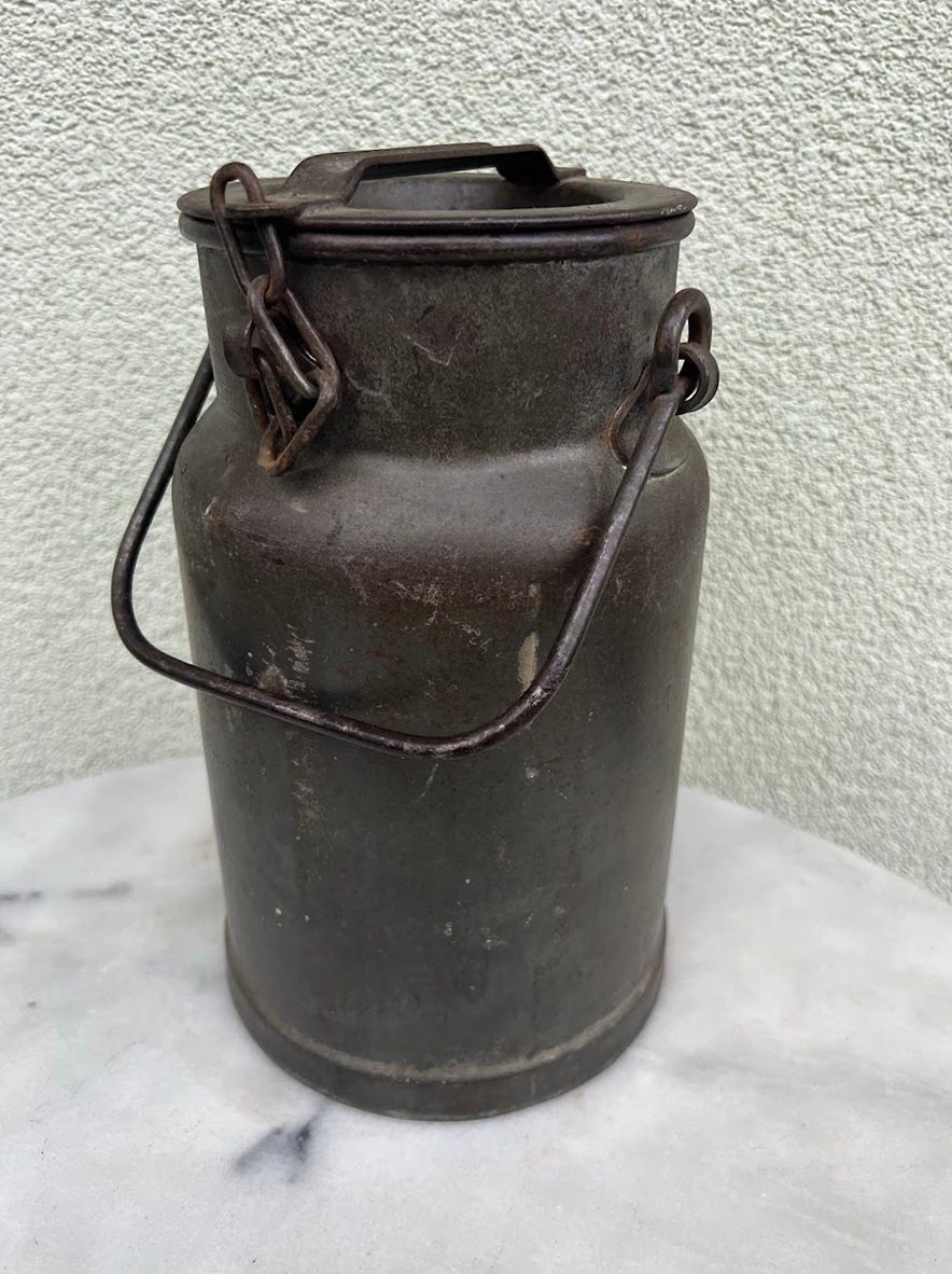 Bidonas antikvarinis, metalinis. Talpa 3 l. Aukštis be rankenos 26 cm. Dugno skersmuo 16 cm. Kaina 43