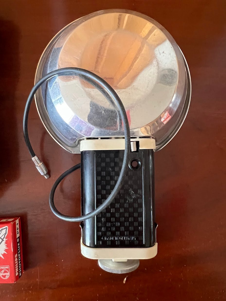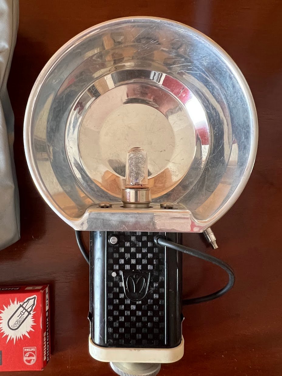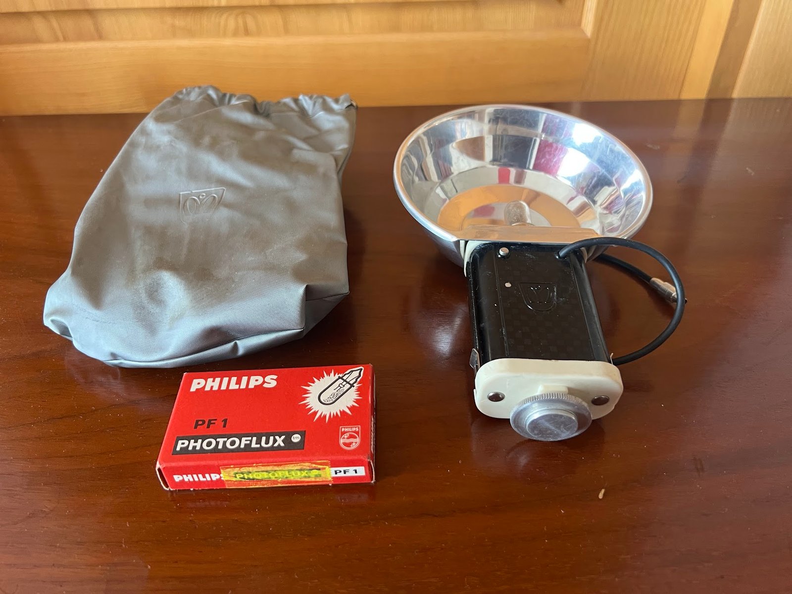 Blykstė, blicas Agfa fotoaparato blykstės rinkinys su dėklu ir Philips Photoflux PF 1 lemputėmis. Made in Germany. 1955–1965 m. Netikrinta. Kaina 28