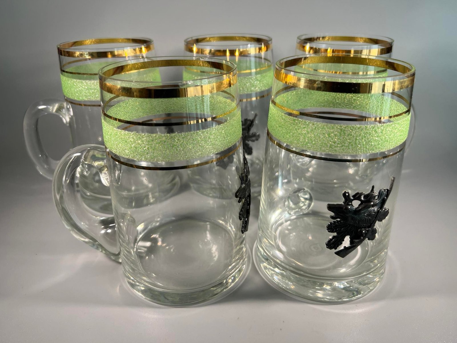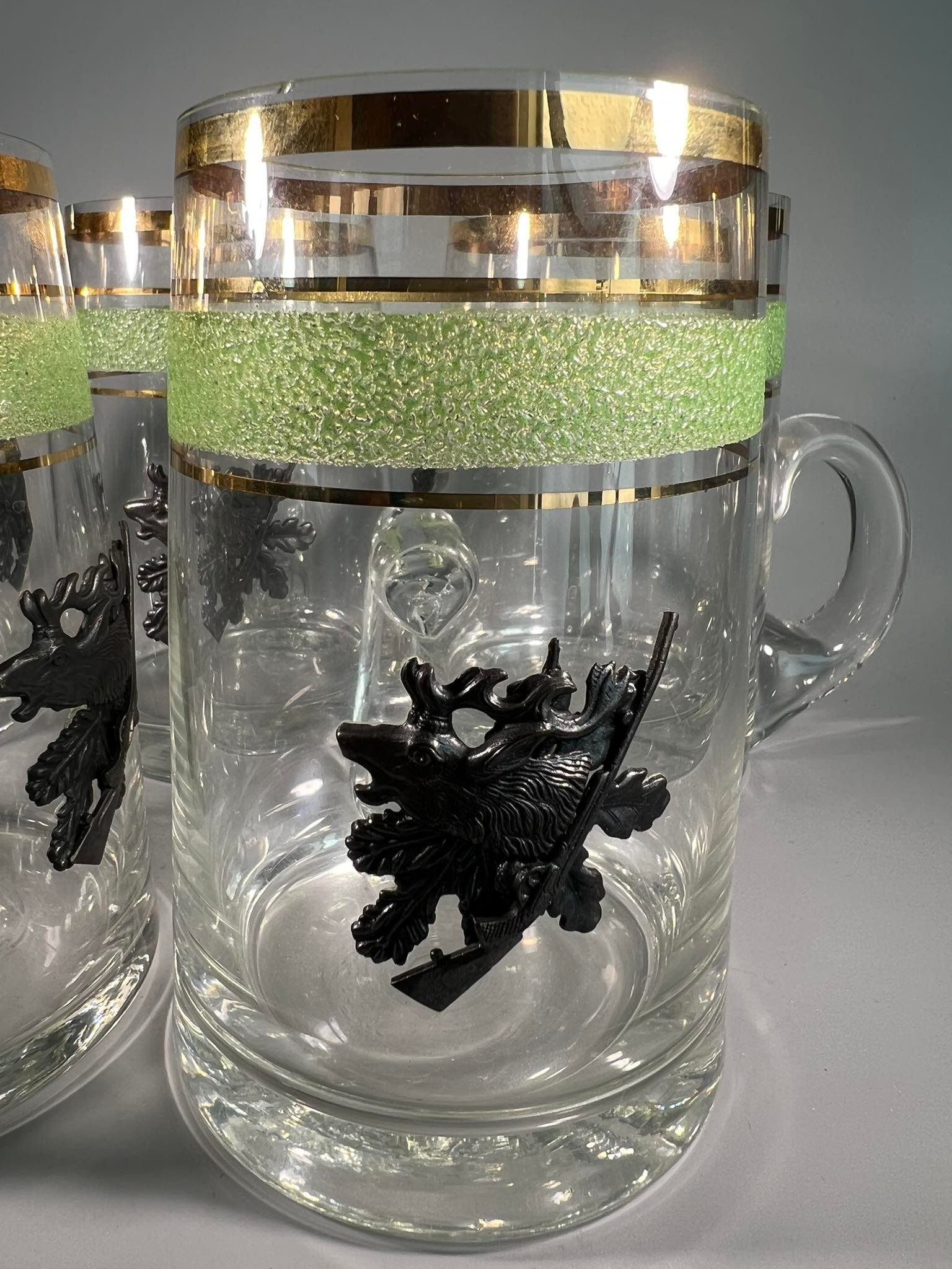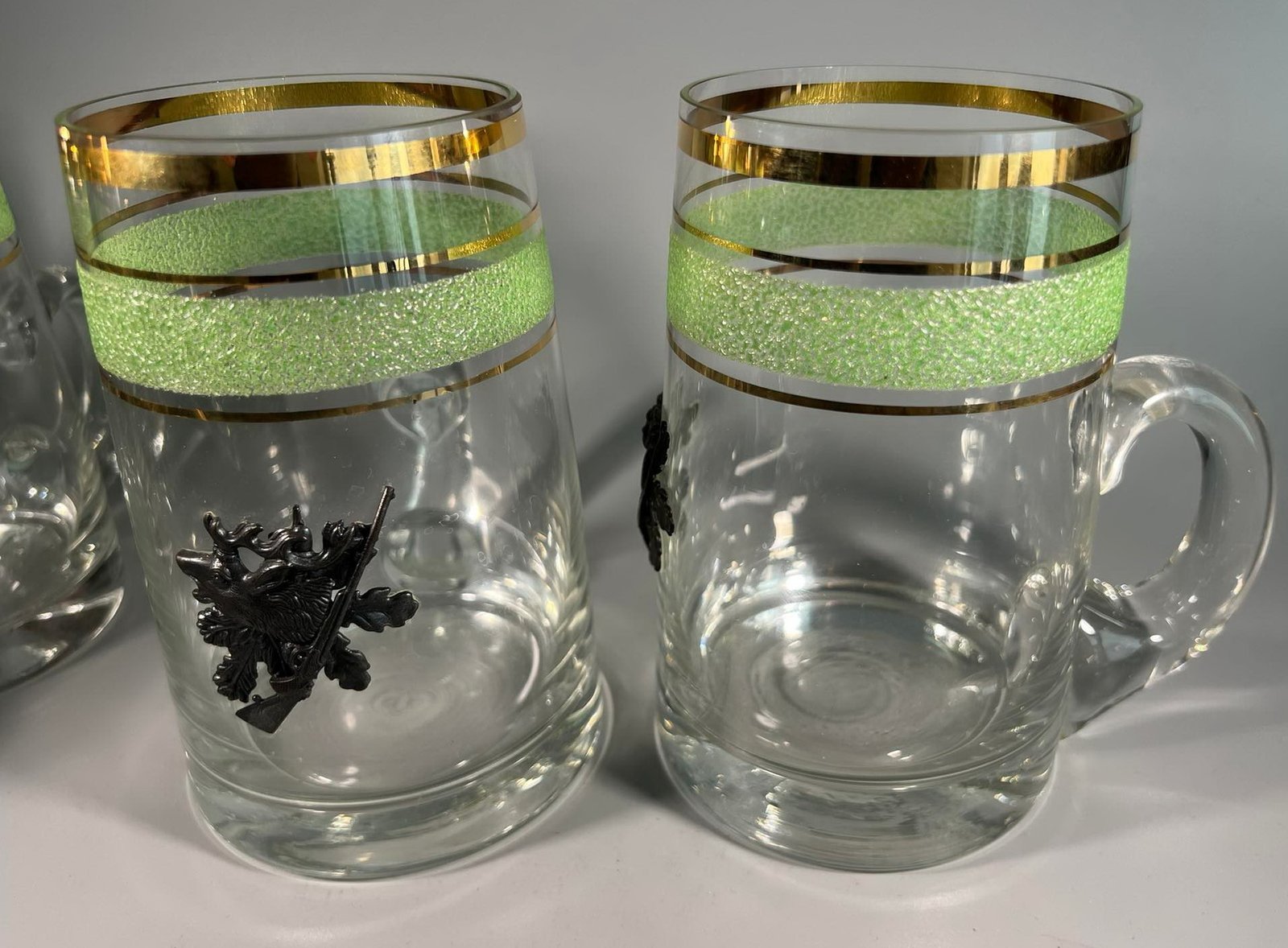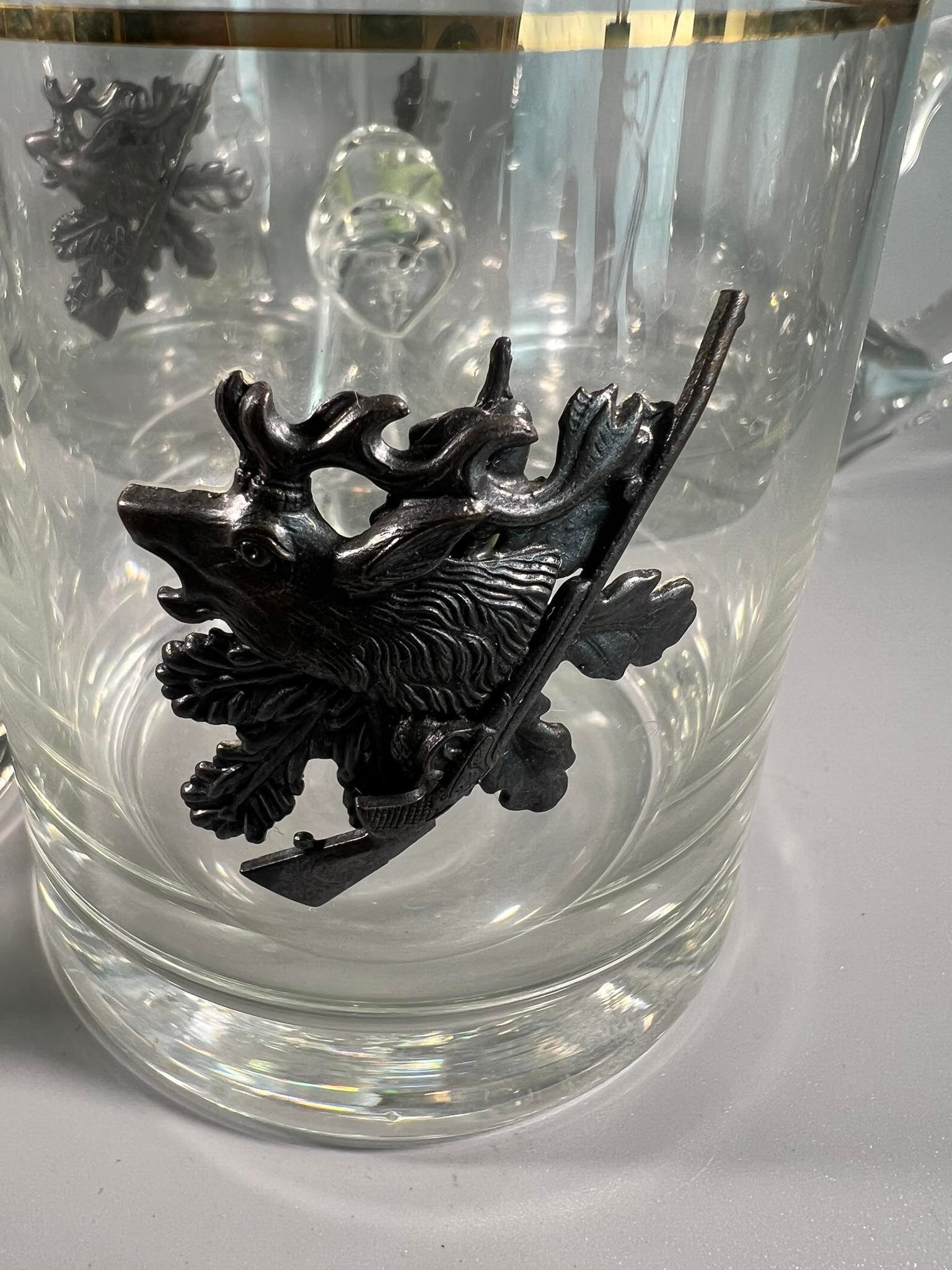 Bokalai medžioklės tema, puošti metaliniu medžioklės bareljefu. 5 vnt. Talpa 0,5 l. Kaina po 18