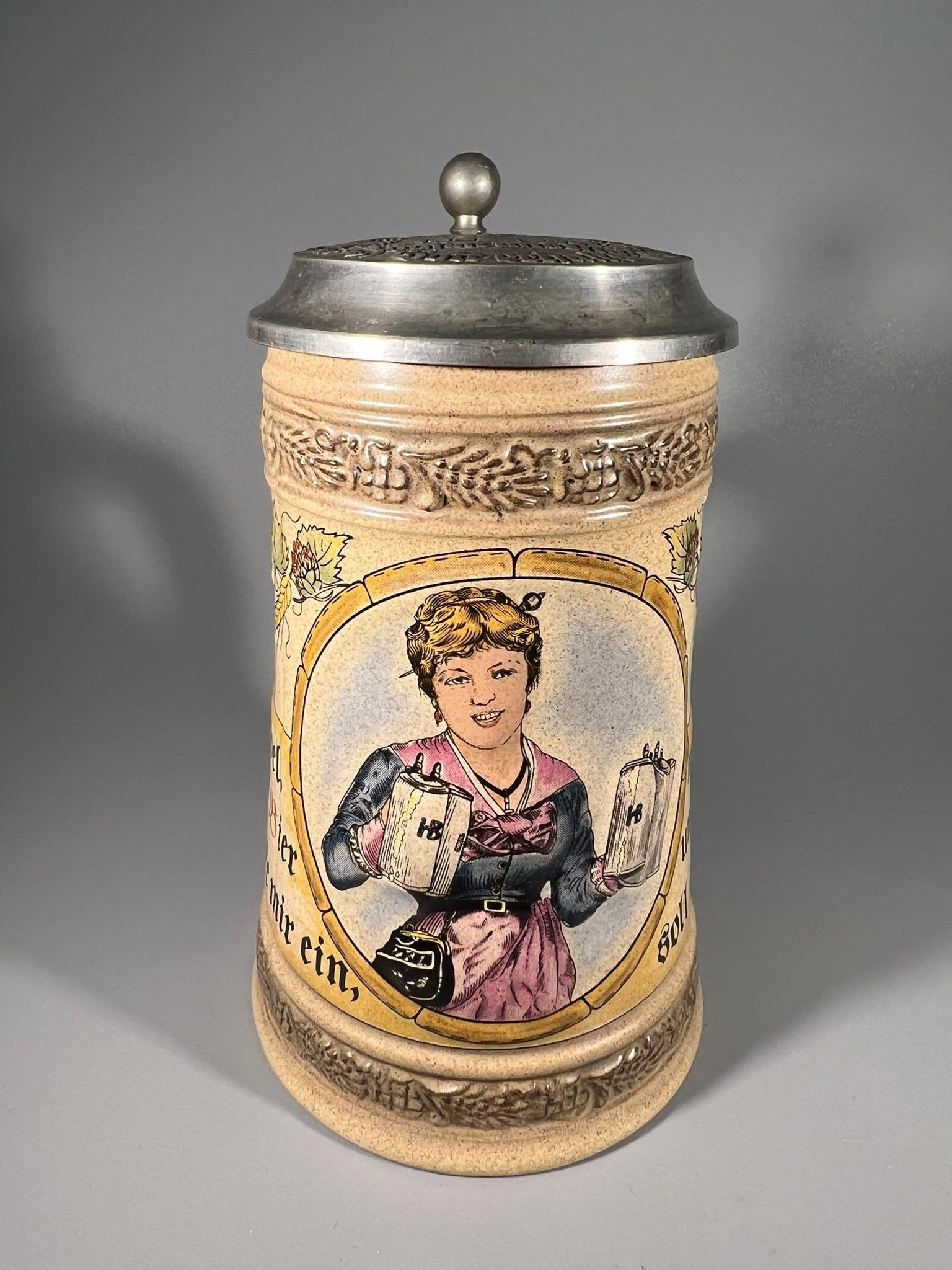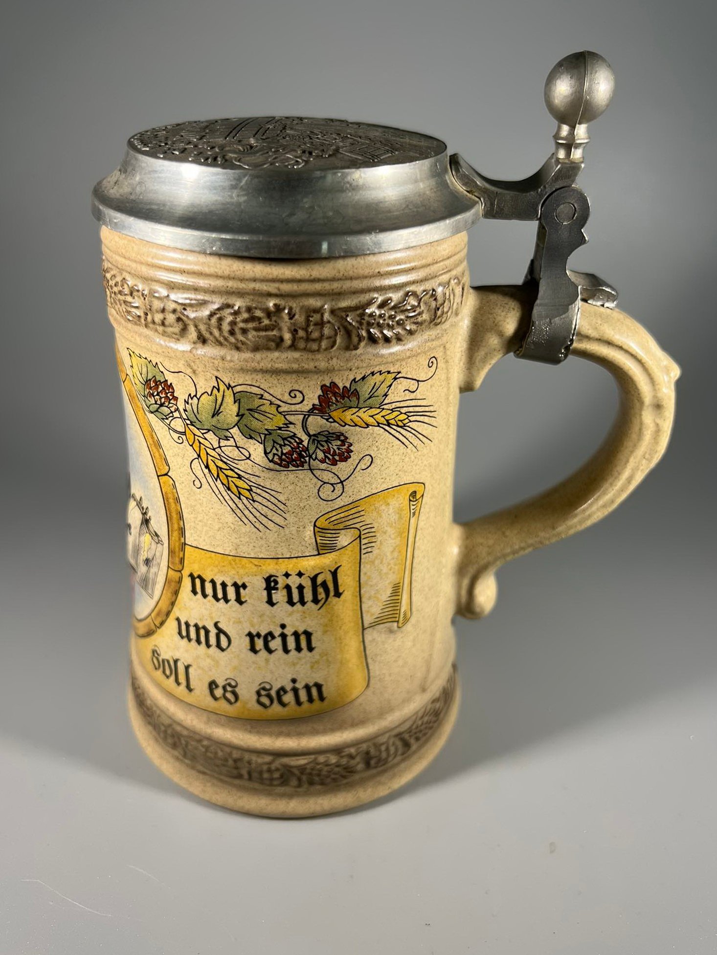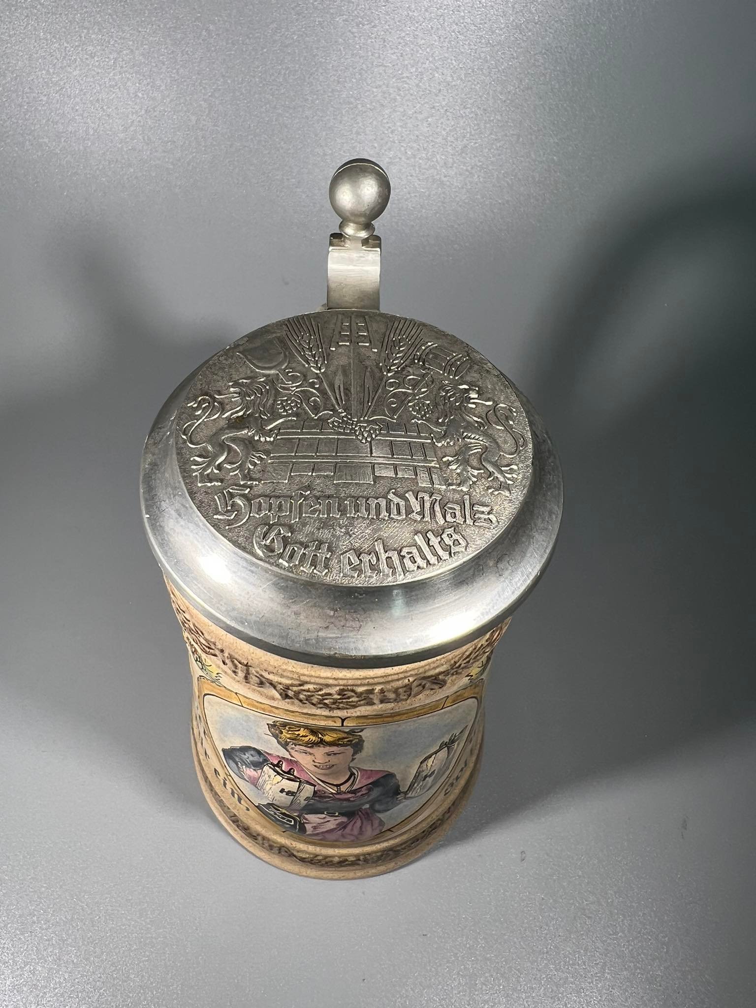 Bokalas keraminis, glazūruotas su alaviniu dangčiu, antikvarinio stiliaus. Vokietija. 0,5 l. Kaina 48
