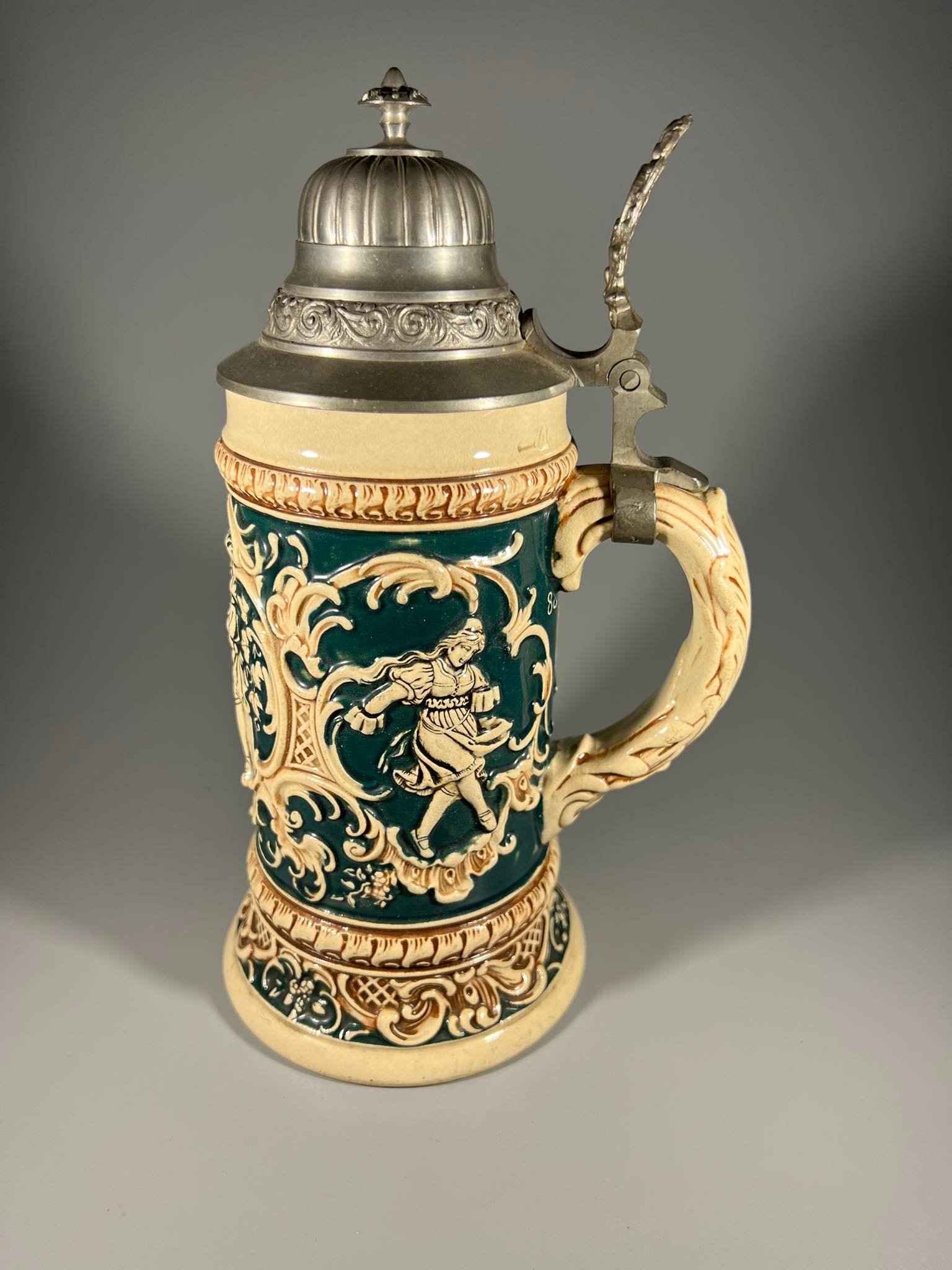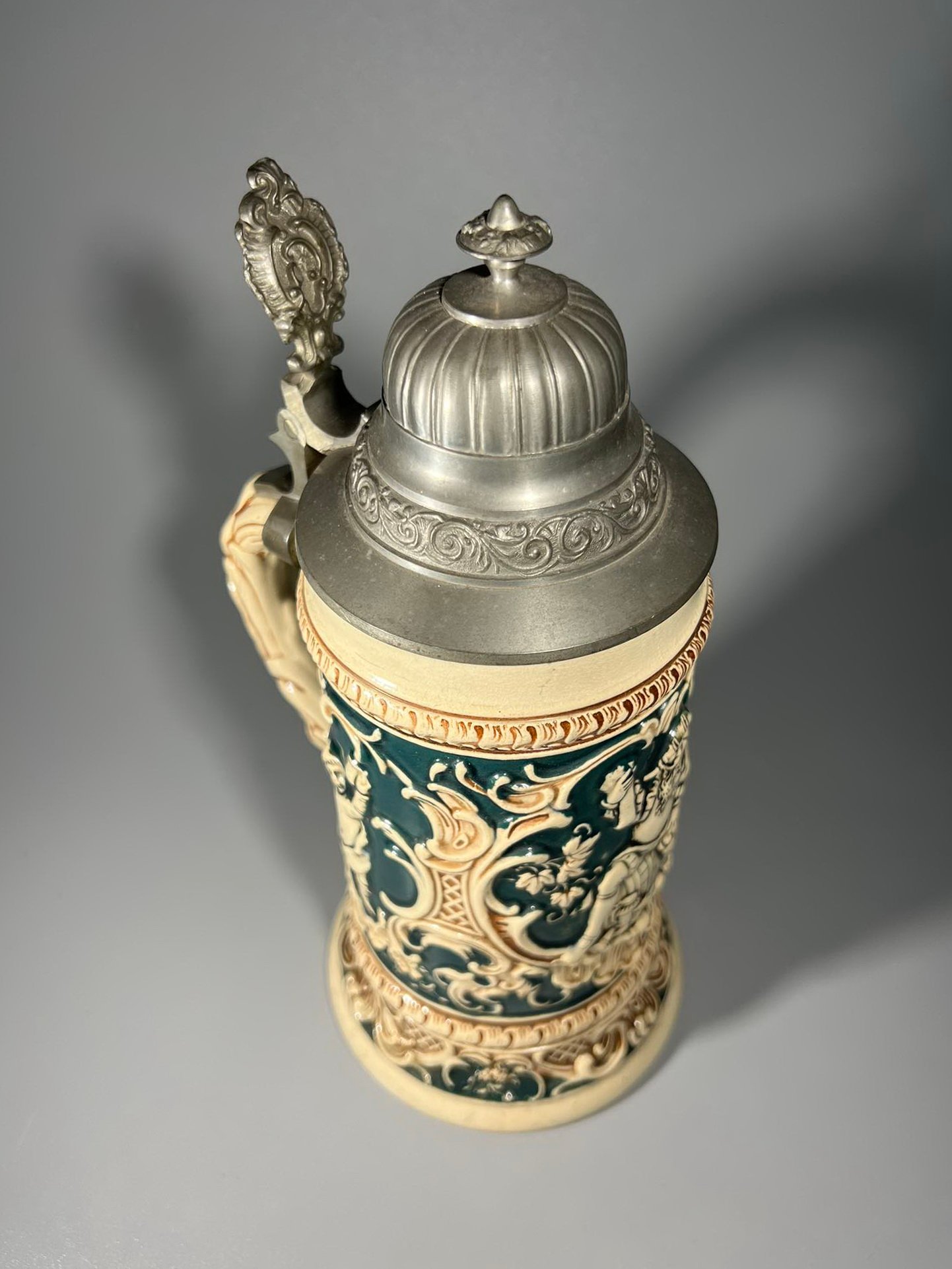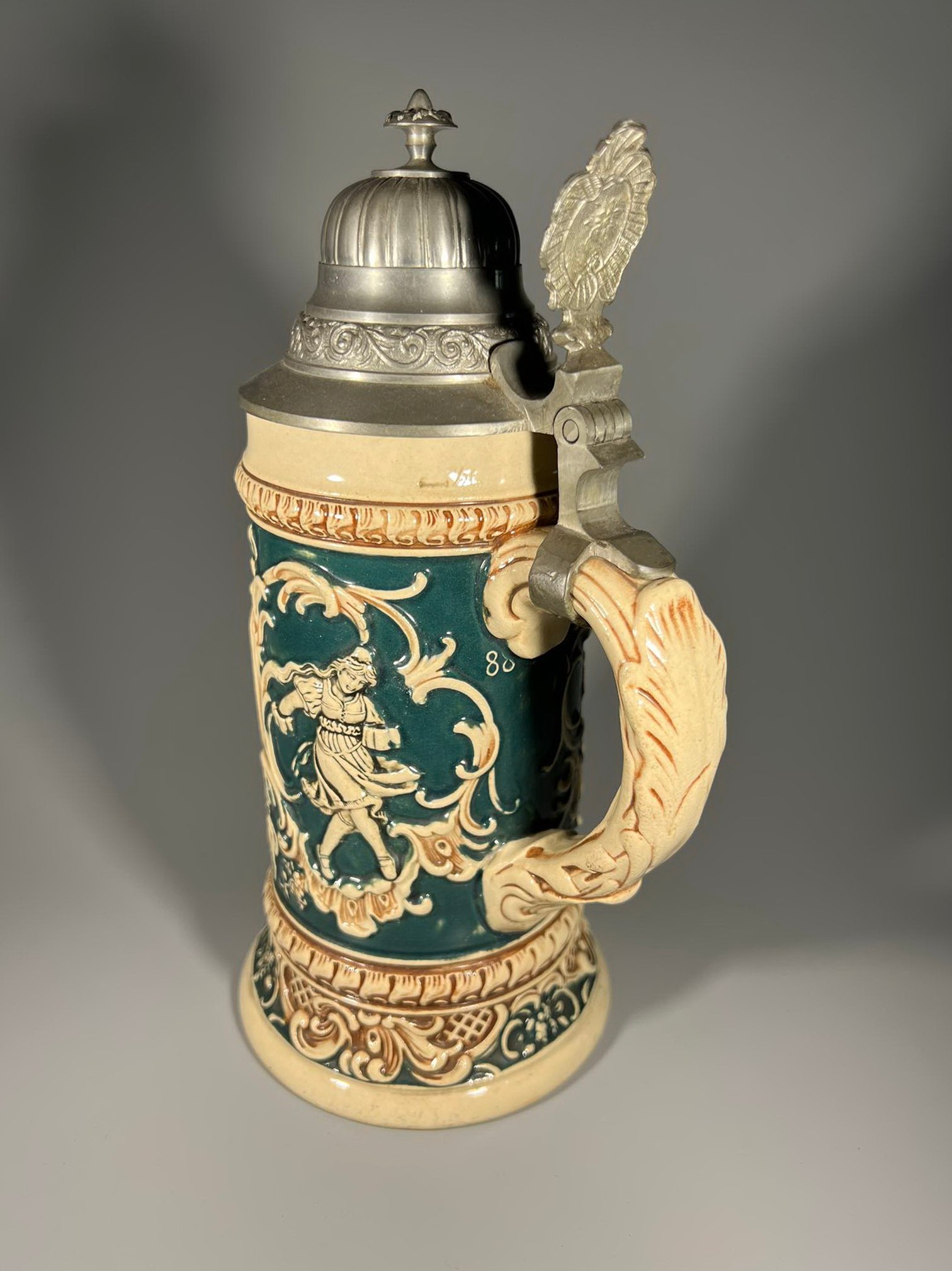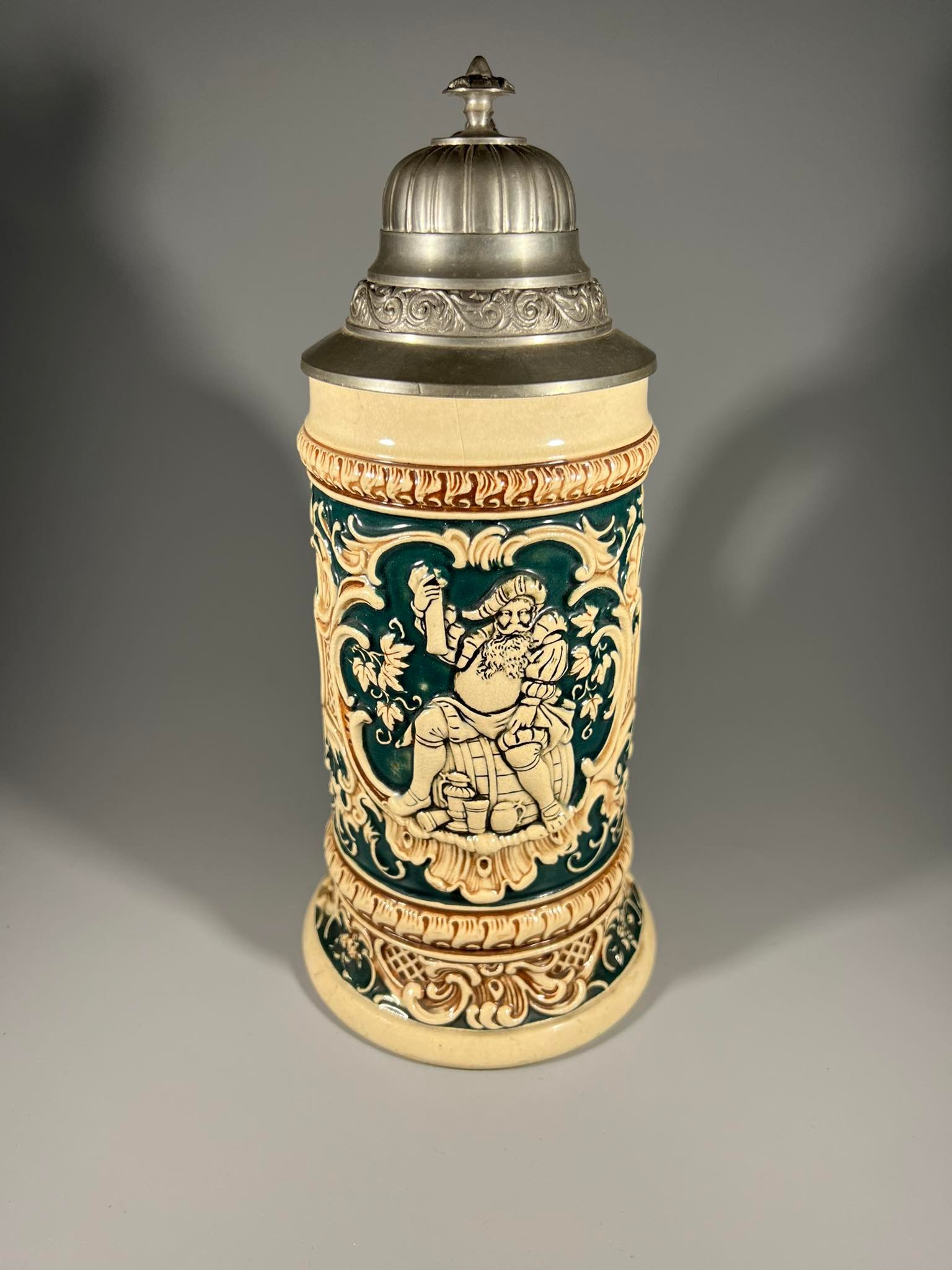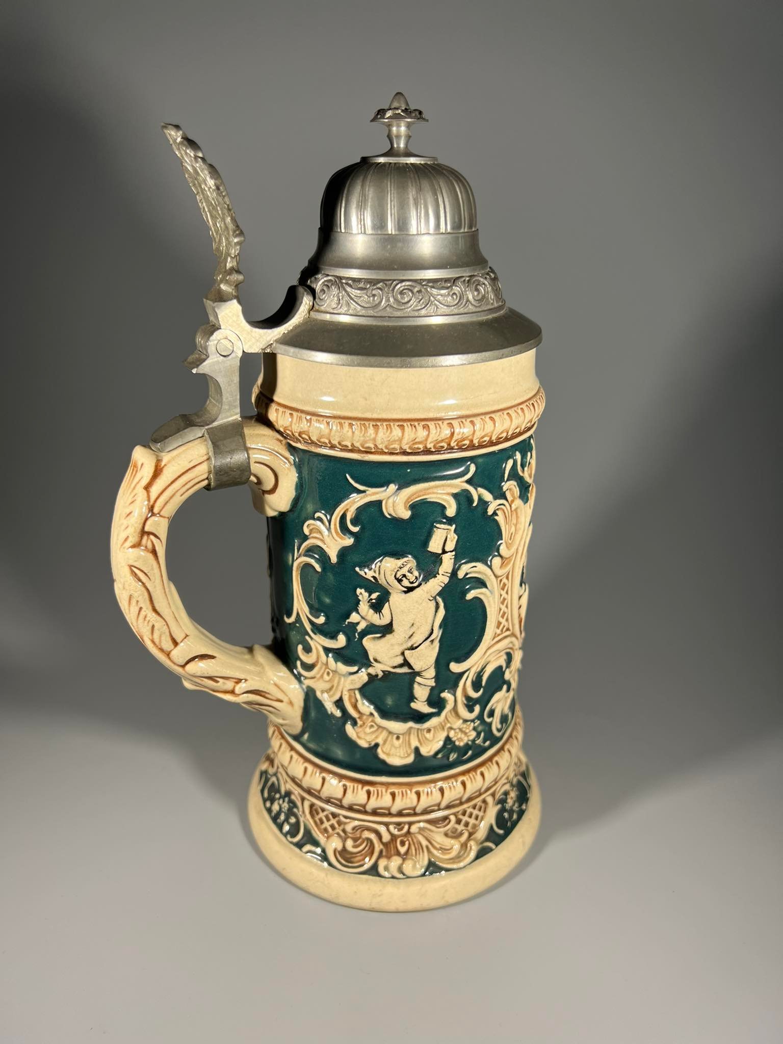 Bokalas keraminis, glazūruotas su alaviniu dangčiu, antikvarinis. Vokietija. 0,5 l. Kaina 88
