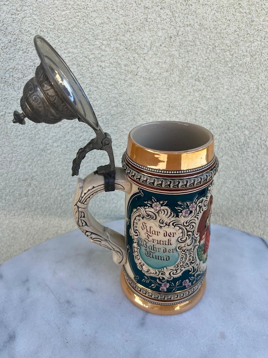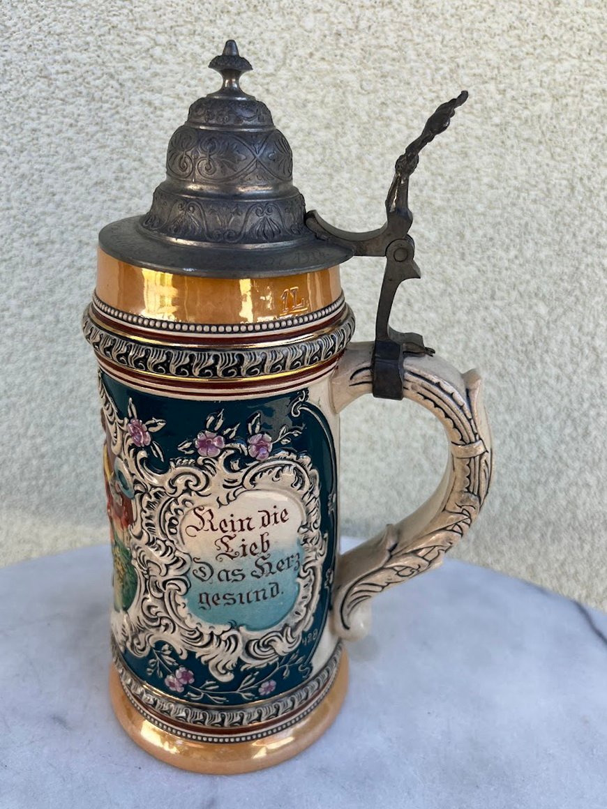 Bokalas keraminis, glazūruotas su alaviniu dangčiu, antikvarinis, vokiškas, 1 l. Rudens šventės, gimnastikos prizas, 1912 m. Kaina 118