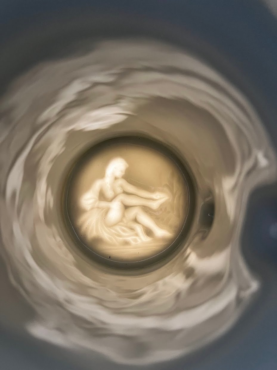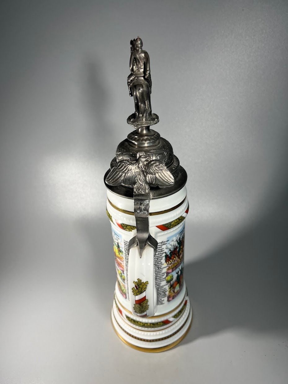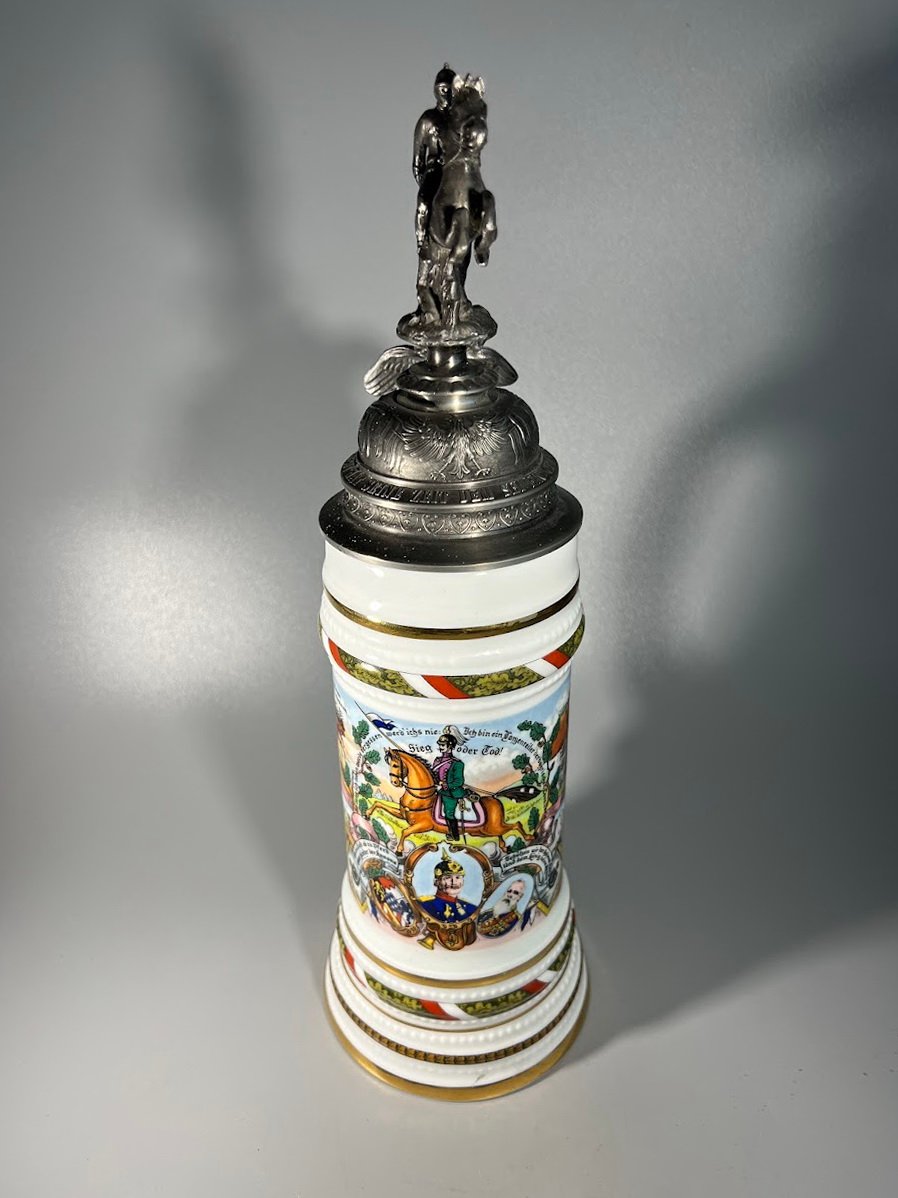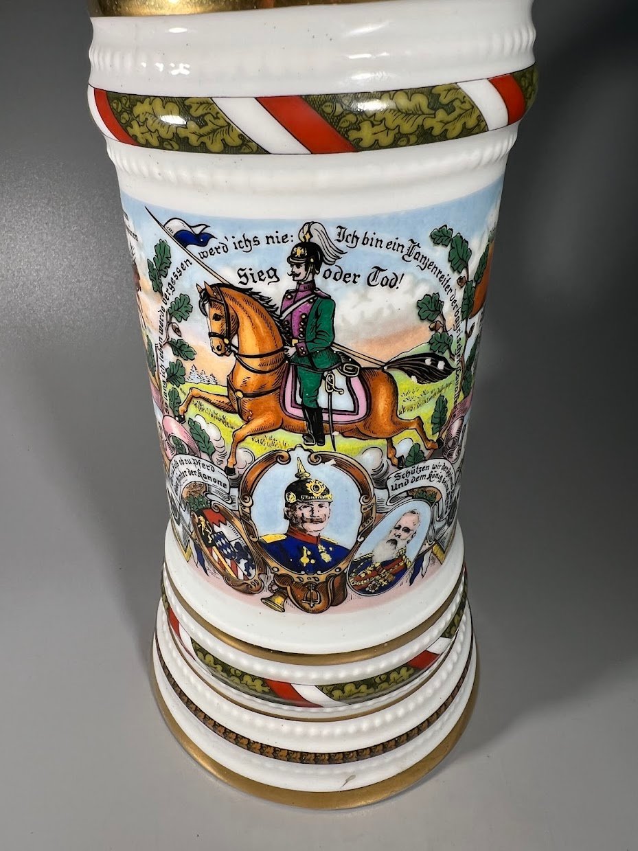 Bokalas porcelianinis vokiečių ulonų rezervistų I PK tema, antikvarinio stiliaus, kariškas, vokiškas, dugne matosi moters litofanija. Aukštis 36 cm. Kaina 188