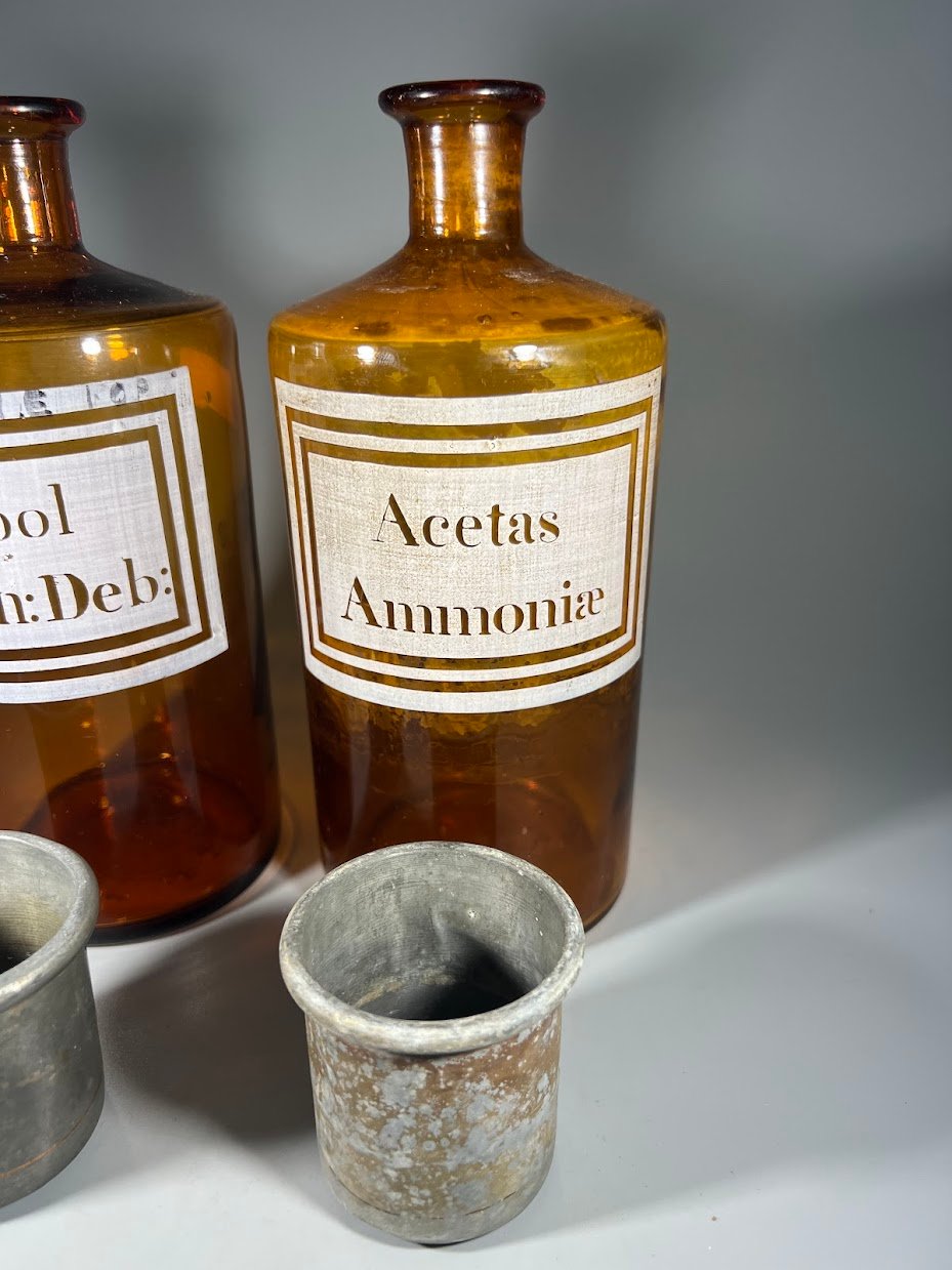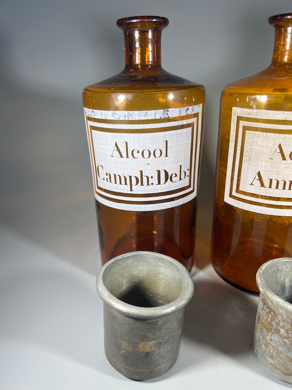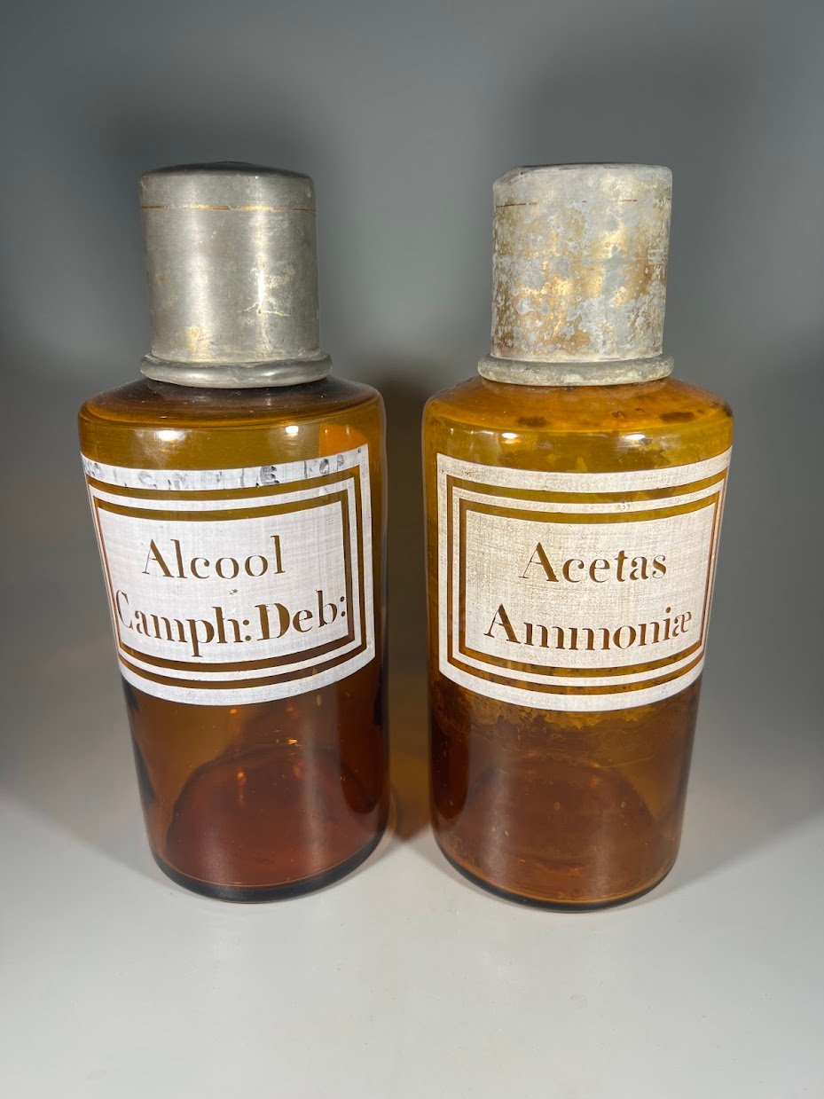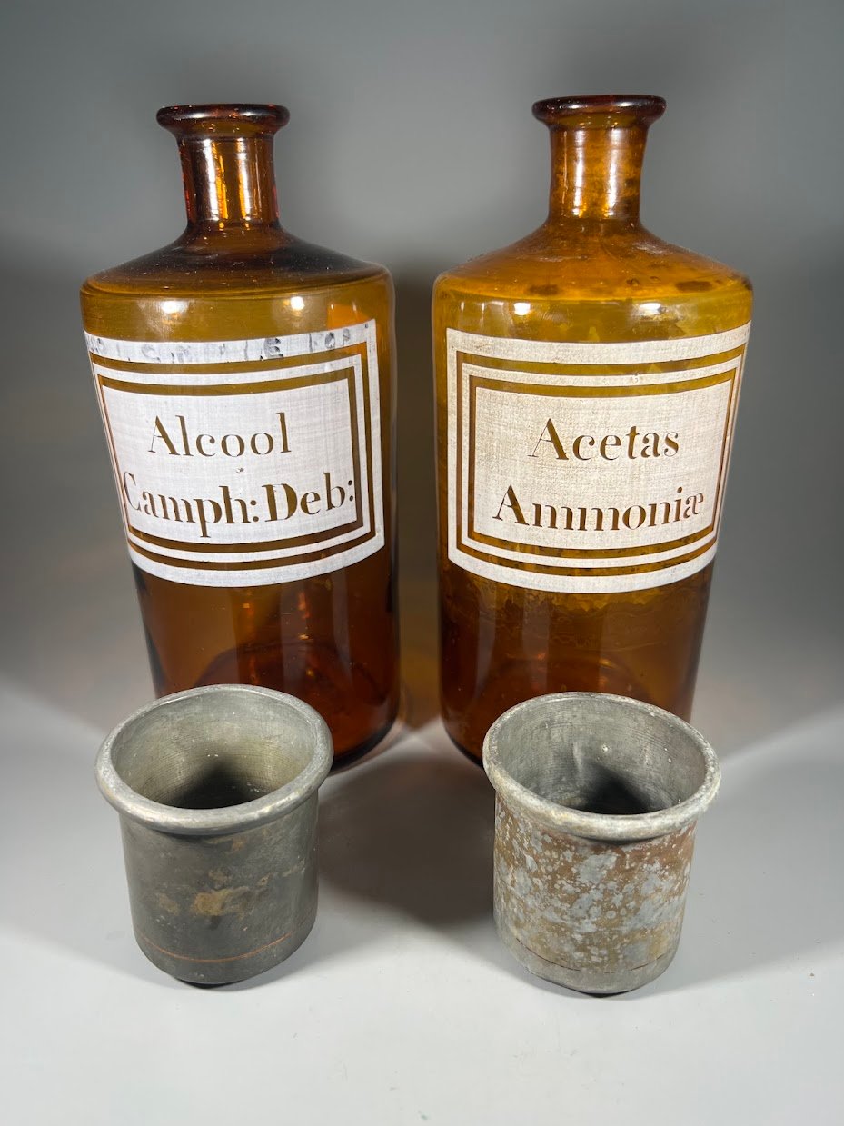 Butelis vaistinės, vaistų, su metaliniu dangčiu, cinko taurele, antikvarinis, prancūziškas. 2 vnt. Aukštis 24, skersmuo 9 cm. Kaina po 56
