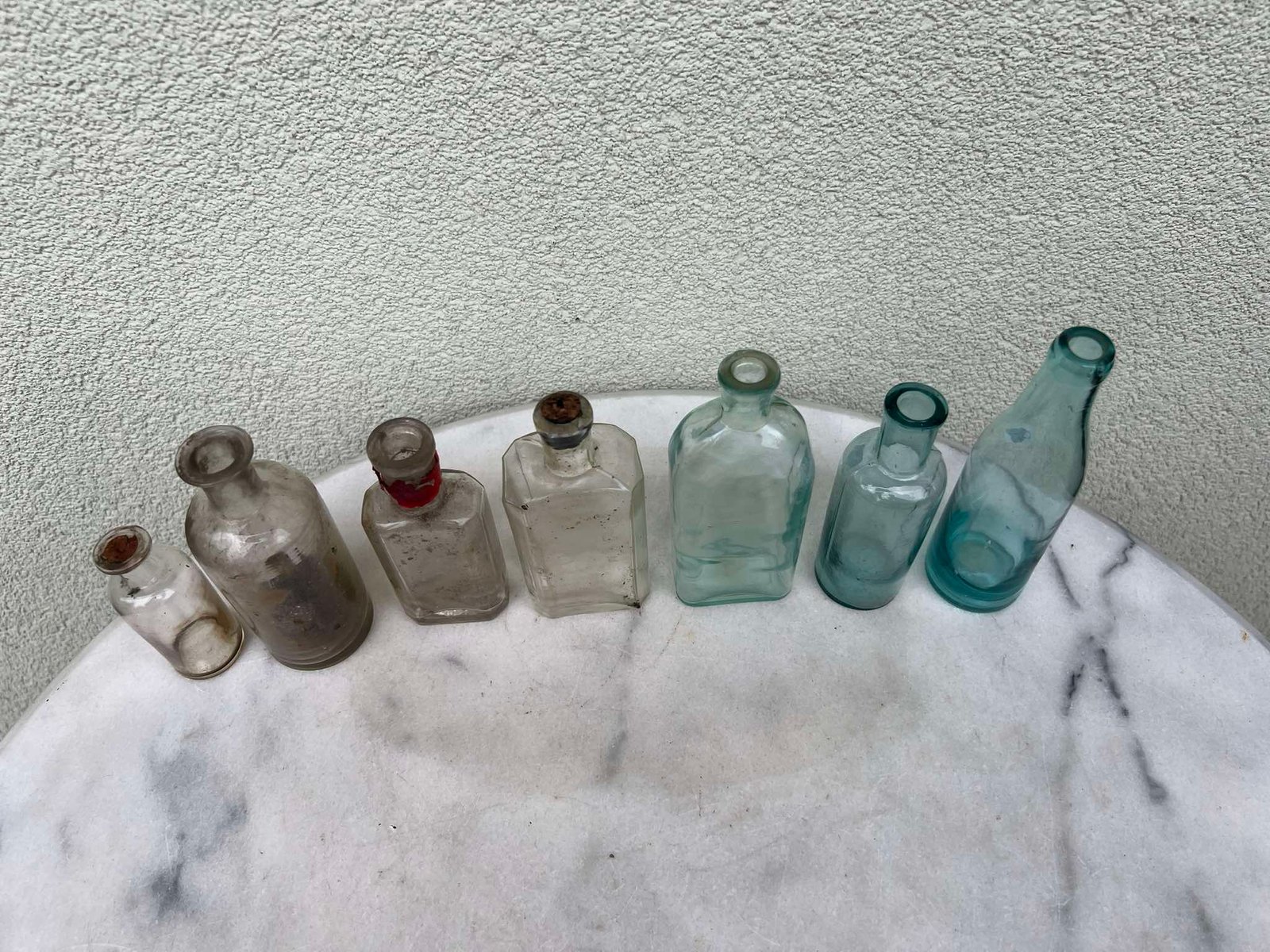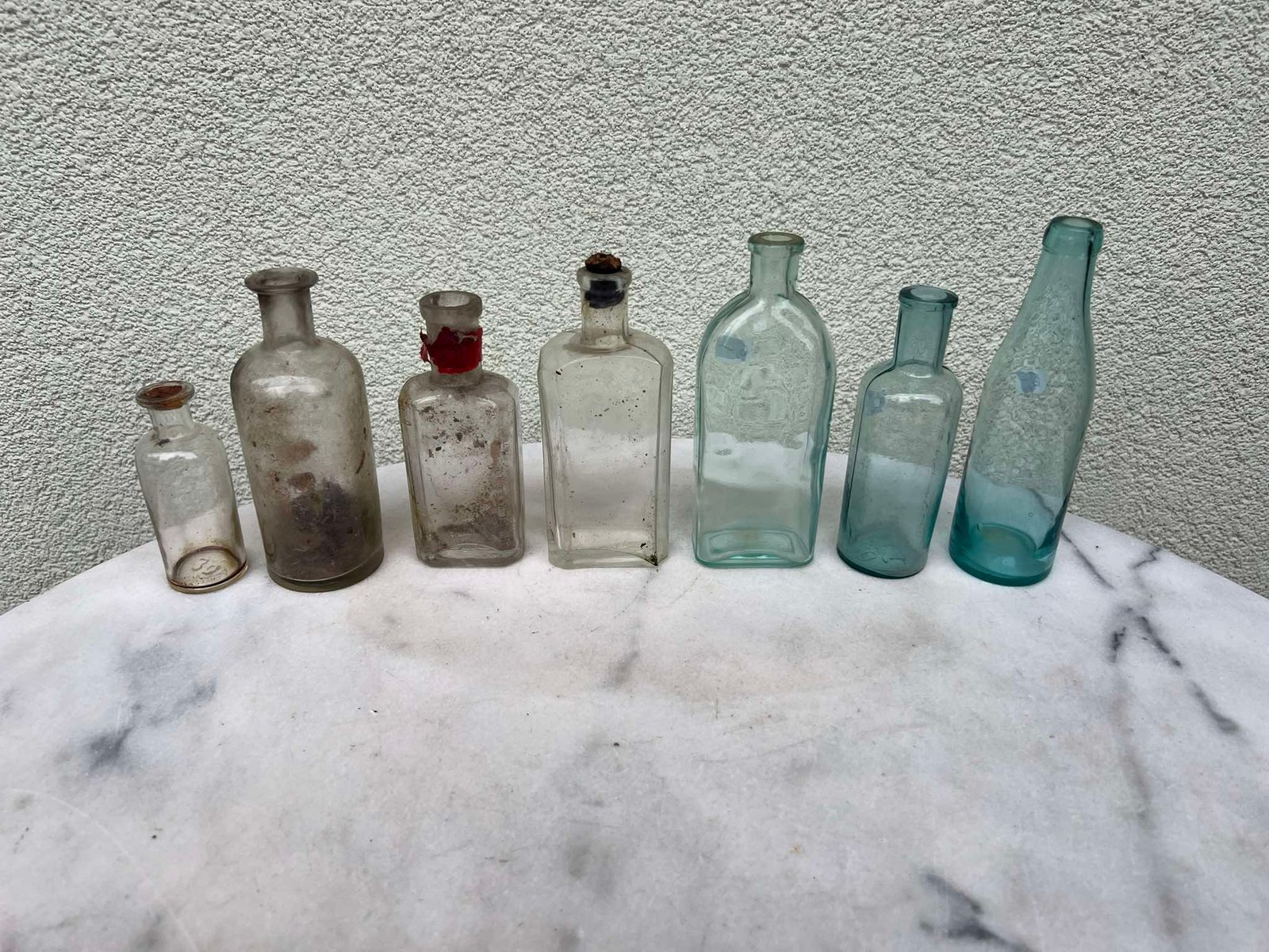 Buteliukai vaistinės, vaistų stikliniai, antikvariniai, tarpukario laikų. LIKO TIK PIRMI 4 vnt. Aukščiausias 15 cm. aukščio. Neskilę ar pan. Kaina po 6