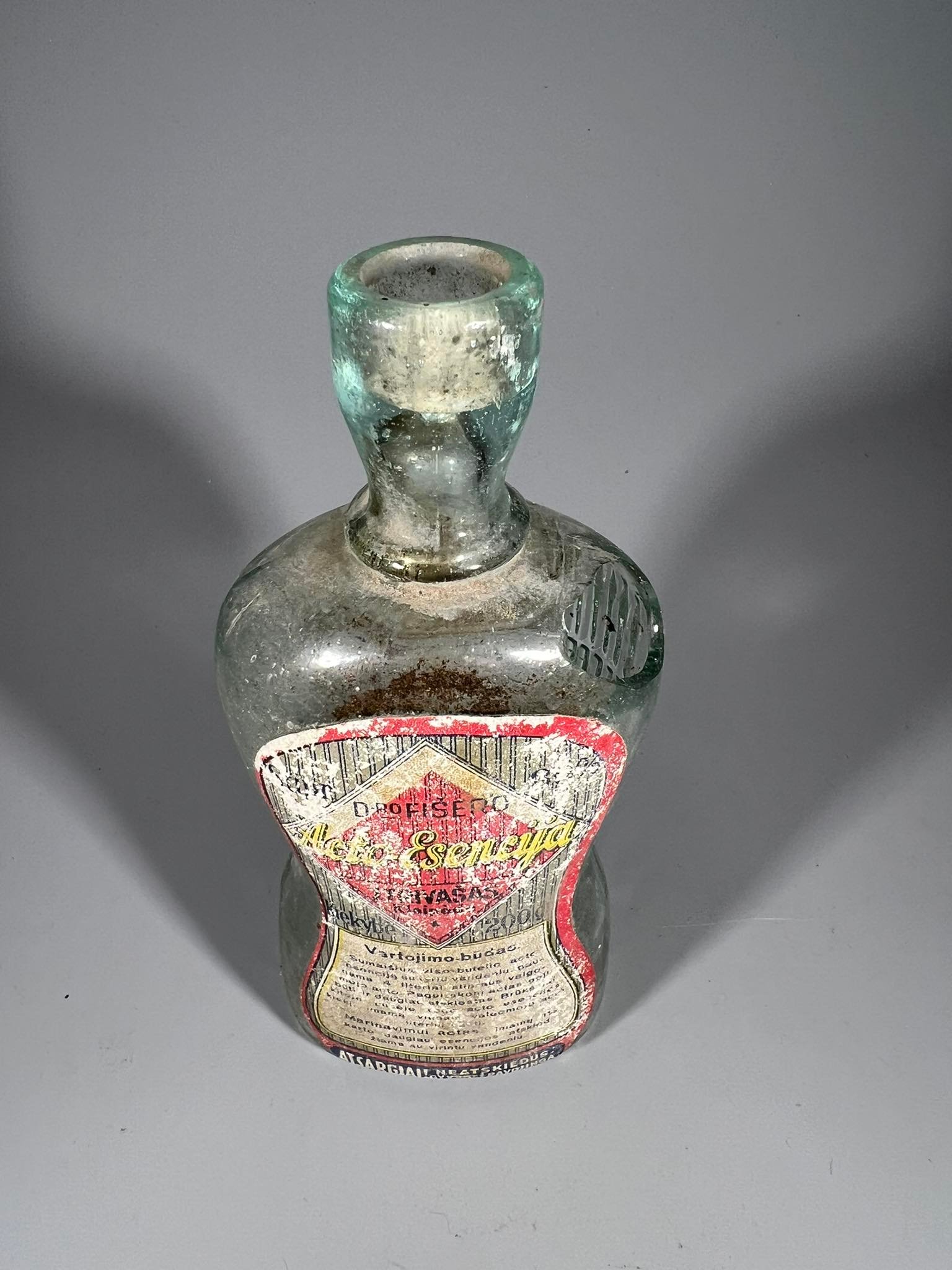 Buteliukas D-ro Fišerio acto esencija lietuviškas, tarpukario laikų. Nusklilęs. Aukštis 17 cm. Kaina 16