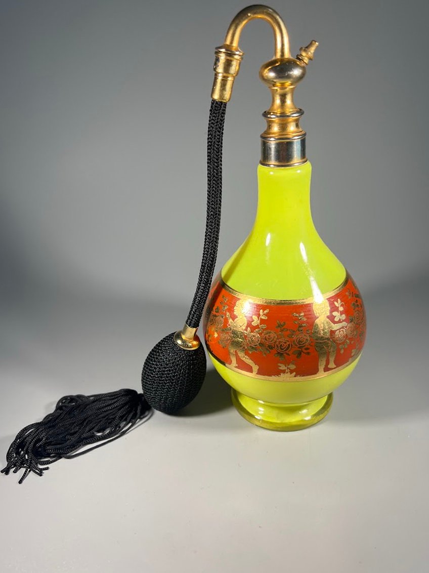Buteliukas, purškiklis kvepalams, odekolonui su gumine kriauše, purkštuku, Art Deco stiliaus, vintažinis. Veikiantis. Aukštis 20,5 cm. Kaina 63