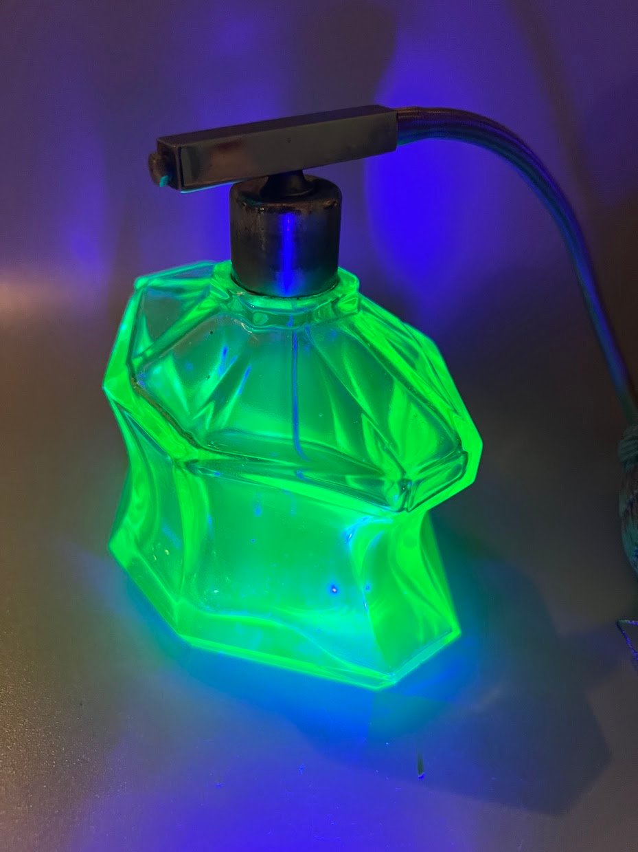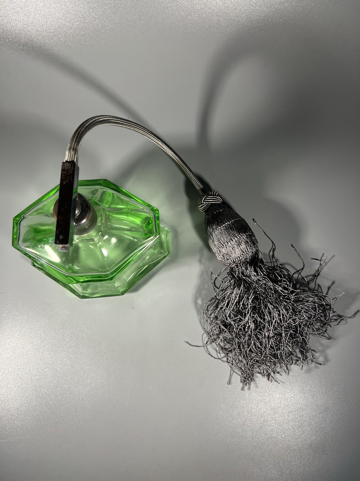Buteliukas, purškiklis urano stiklo, Art Deco stiliaus, antikvarinis, kvepalams, odekolonui su kriauše-purkštuku. Veikiantis. Kaina 128