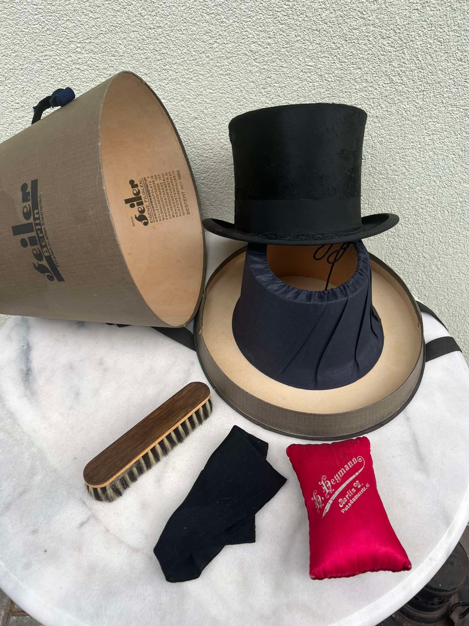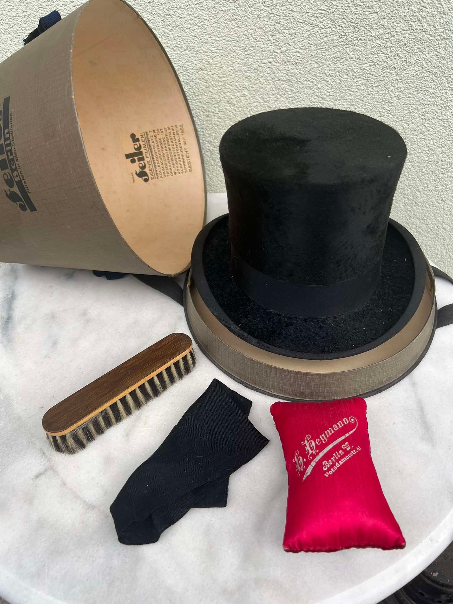 Cilindras, skrybėlė, antikvarinis, vokiškas su dėže ir valymo priemonėmis. Didesnis dydis. Kaina 158