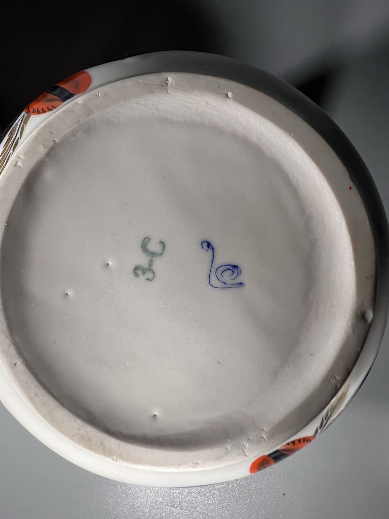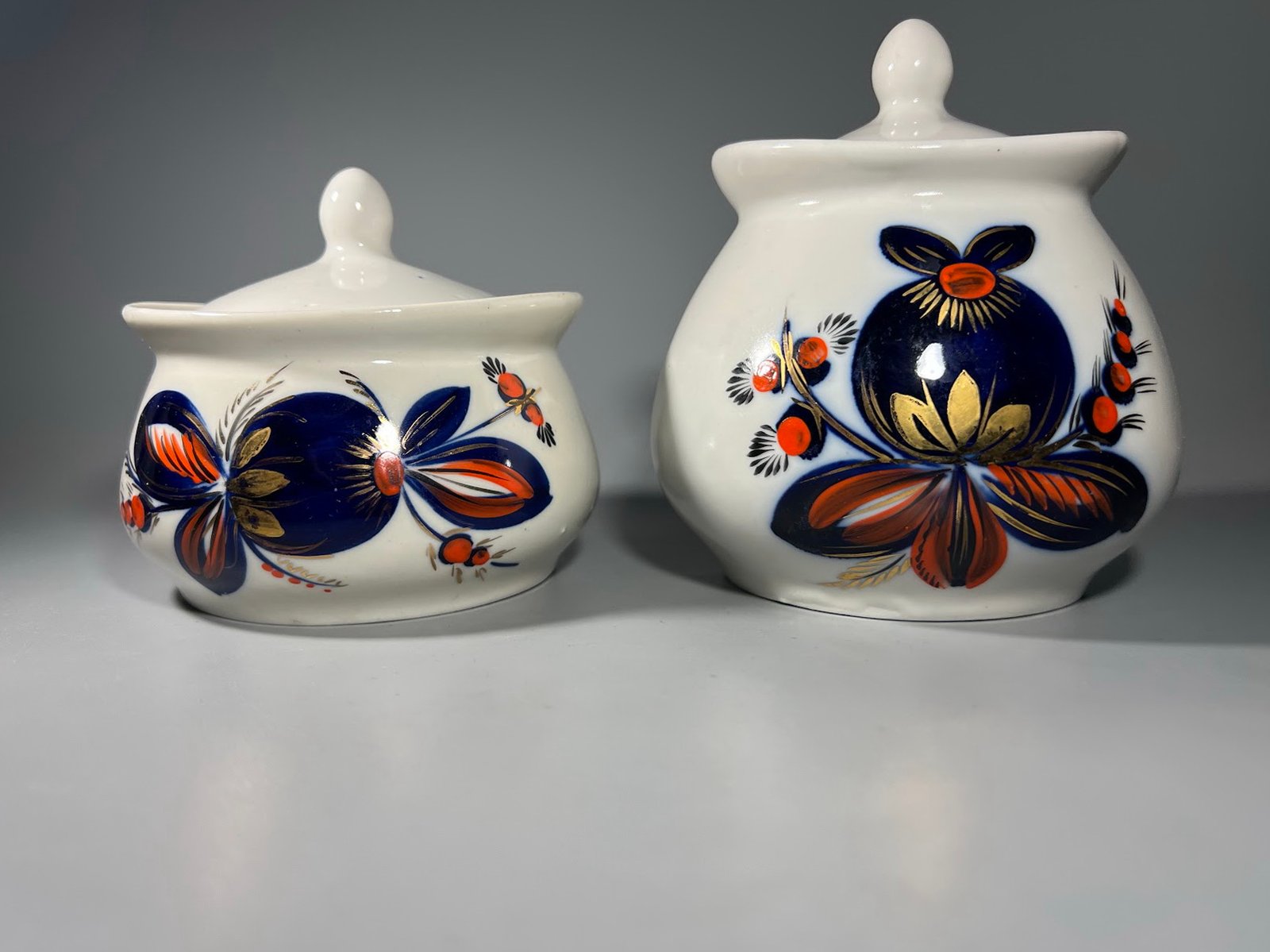Tai vintažinis porcelianas, dekoruotas rankomis tapytais kobalto mėlynumo žiedais, auksu ir ryškiomis oranžinėmis detalėmis.