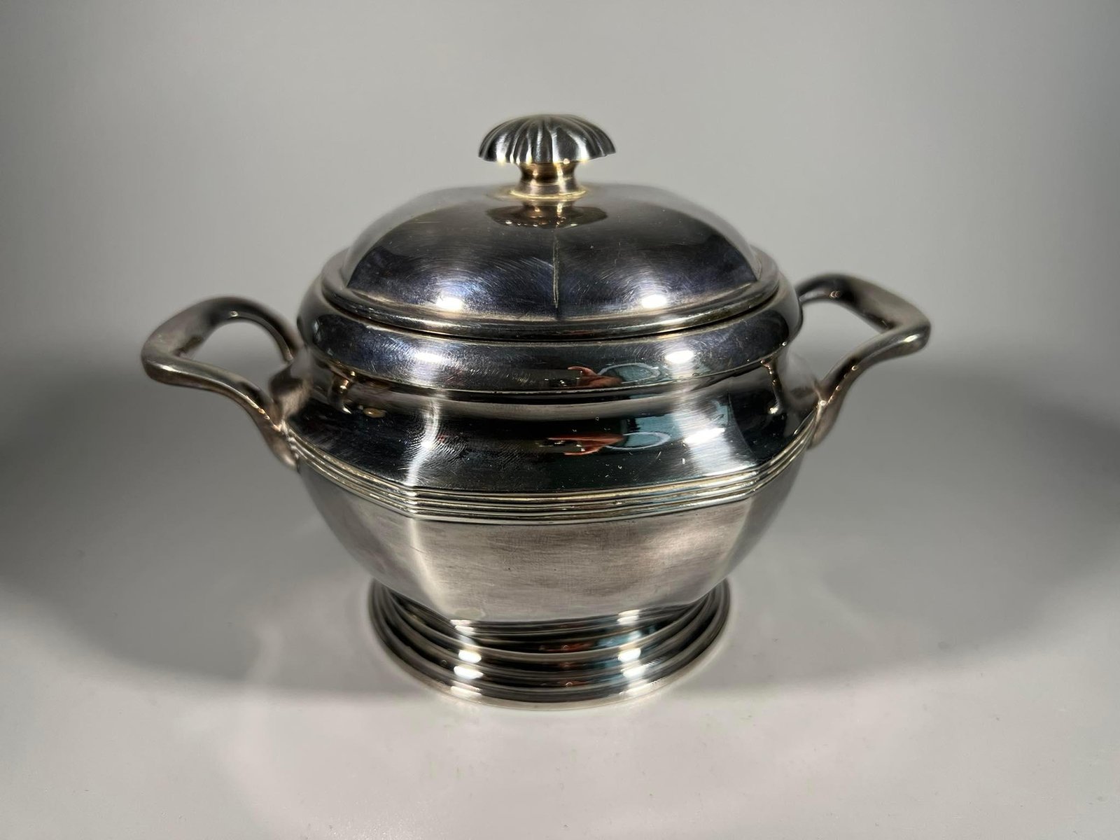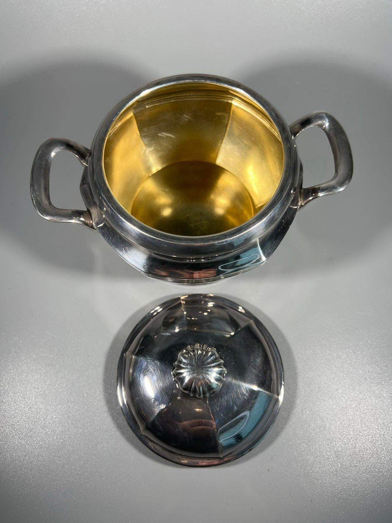 Cukrinė, sidabruotas indas antikvarinis. Aukštis 11, plotis tarp rankenėlų 16 cm. Kaina 38