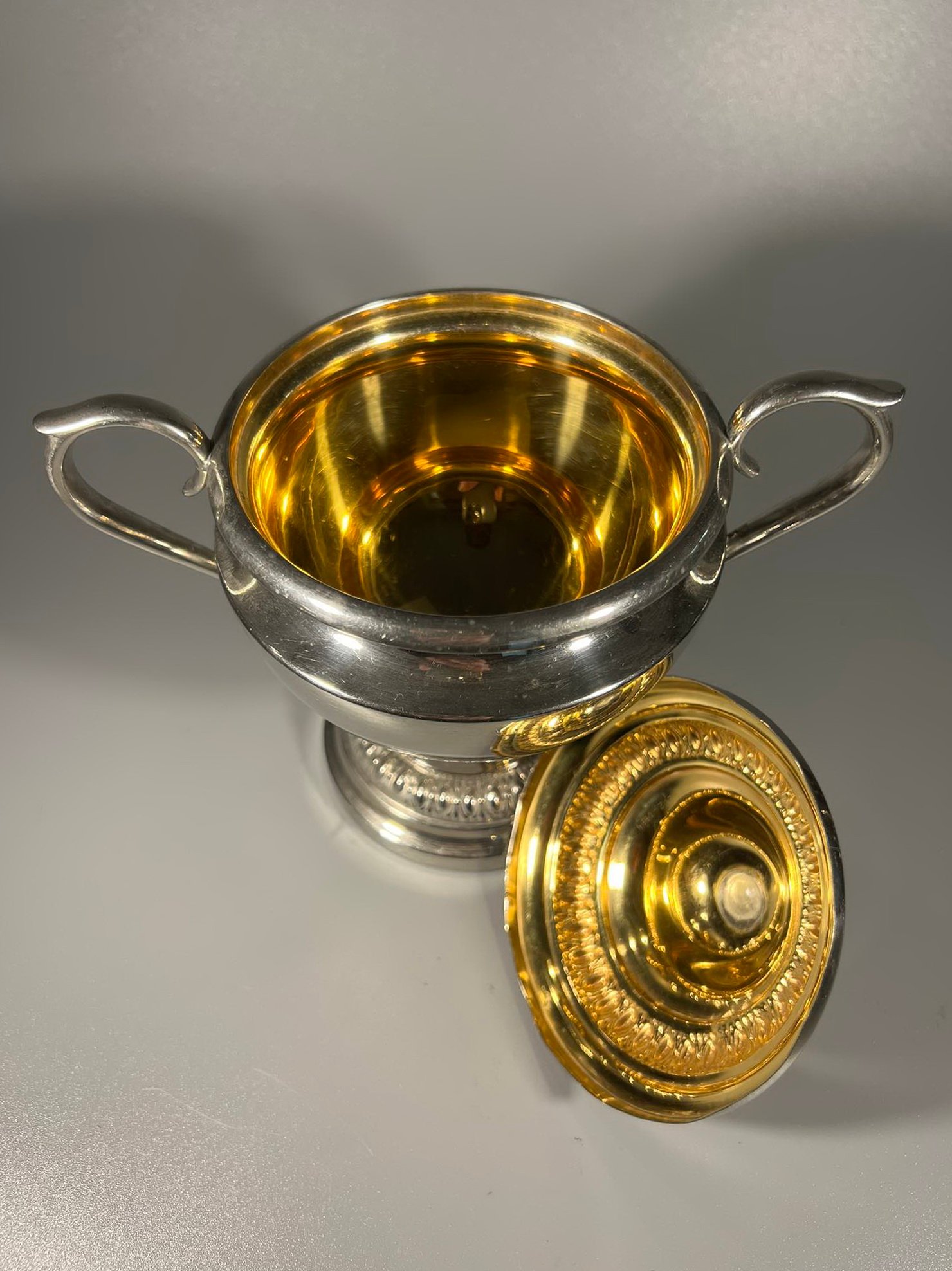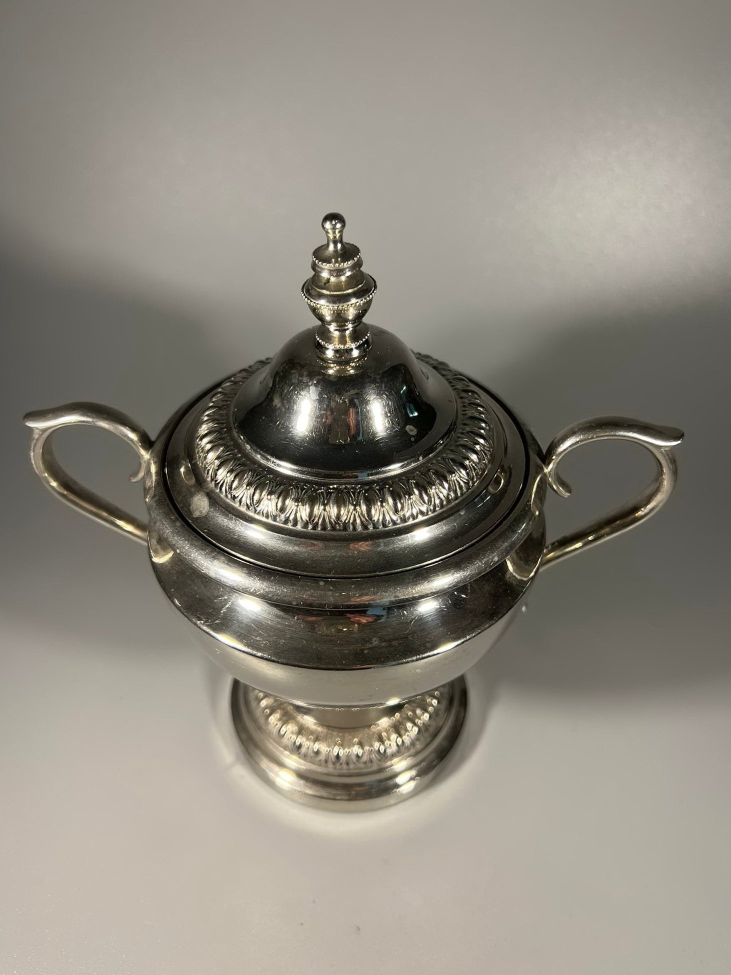 Cukrinė su dangteliu sidabruota, antikvarinė. Aukštis 18 cm. Kaina 28