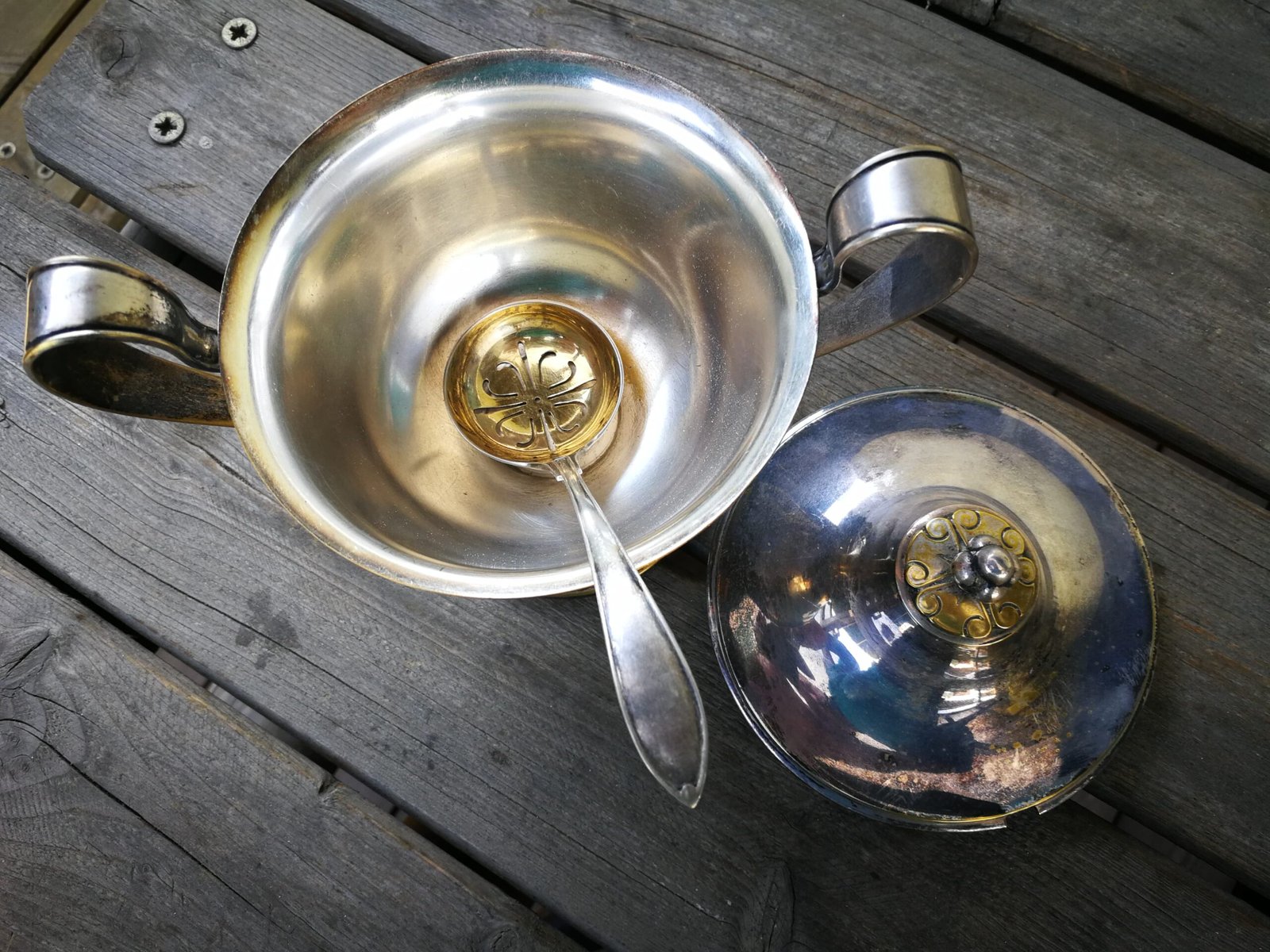 Cukrinė su šaukšteliu antikvarinė, sidabruota. Kaina 32