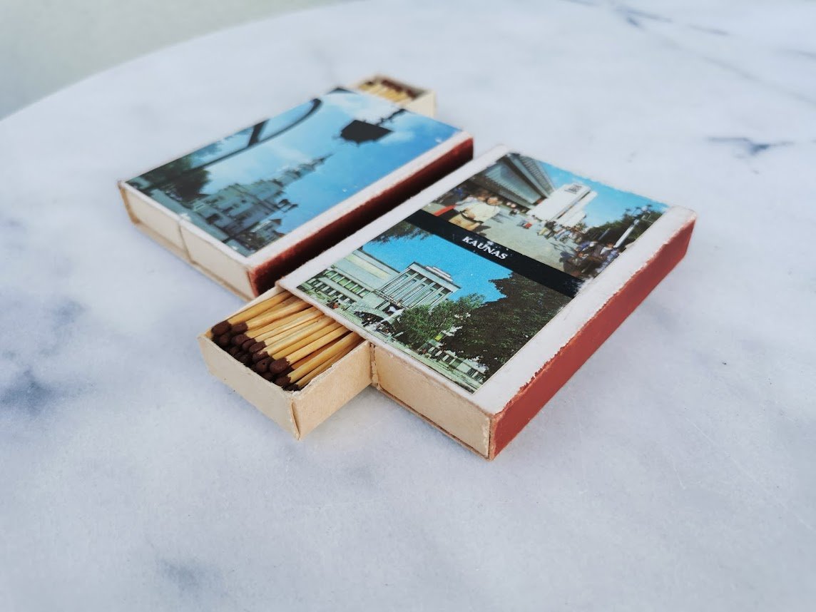 Degtukai KAUNAS tarybinų laikų. 2 vnt. Dydis: 2 x 8 x 10 cm. Dvi vienodos dėžutės nufotografuotos iš skirtingų pusių, Kaina po 12