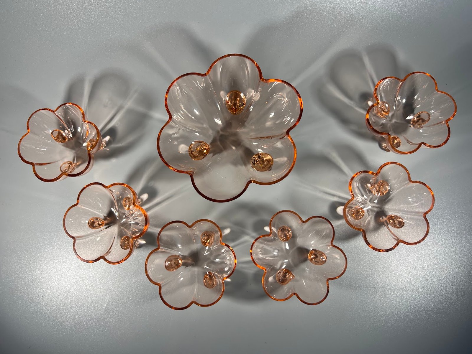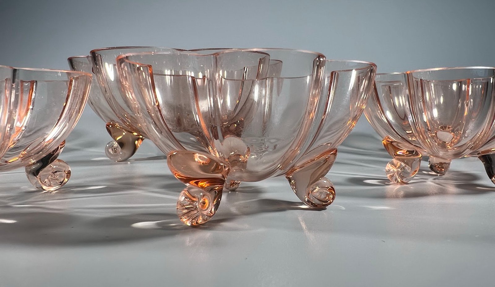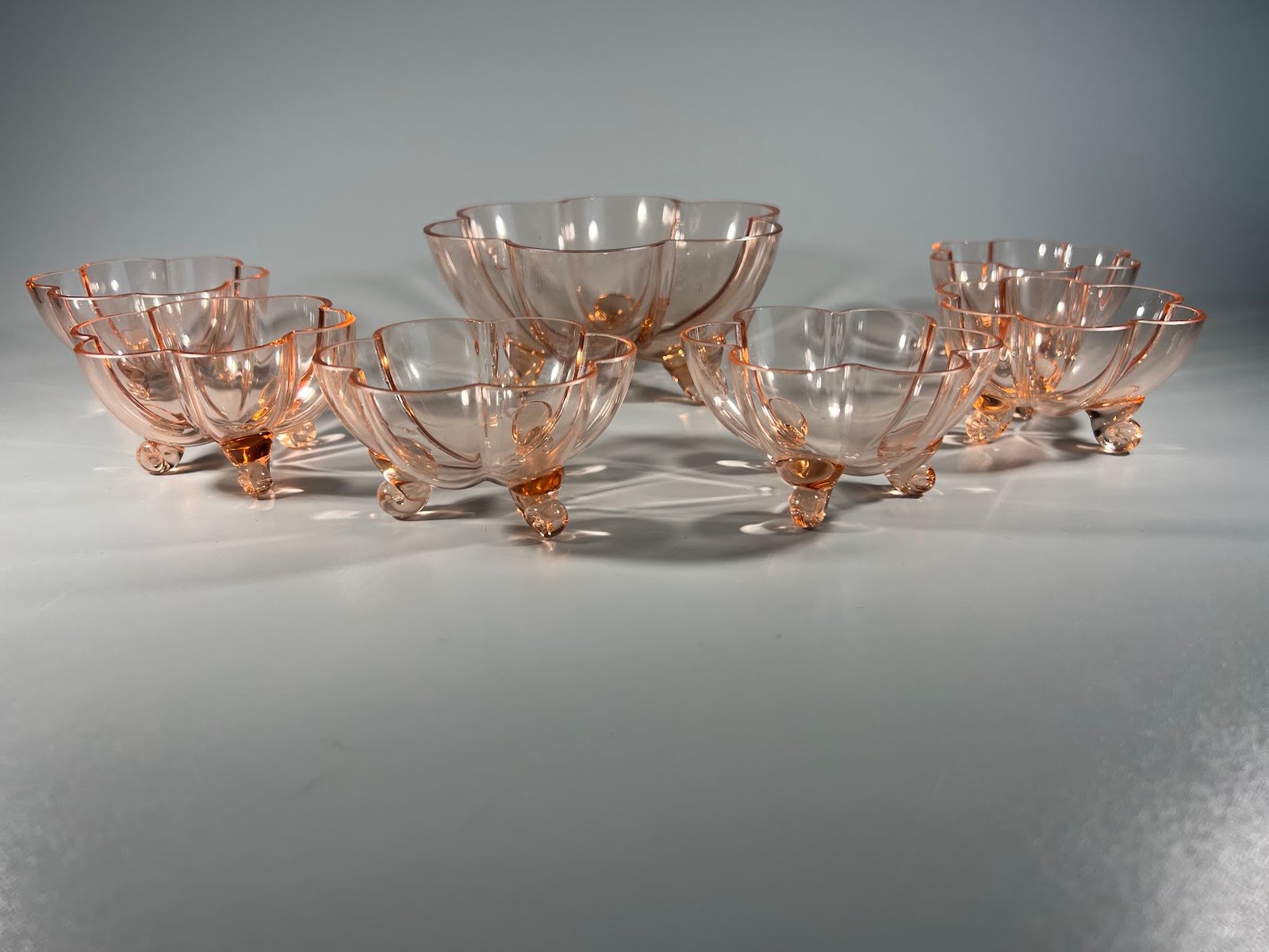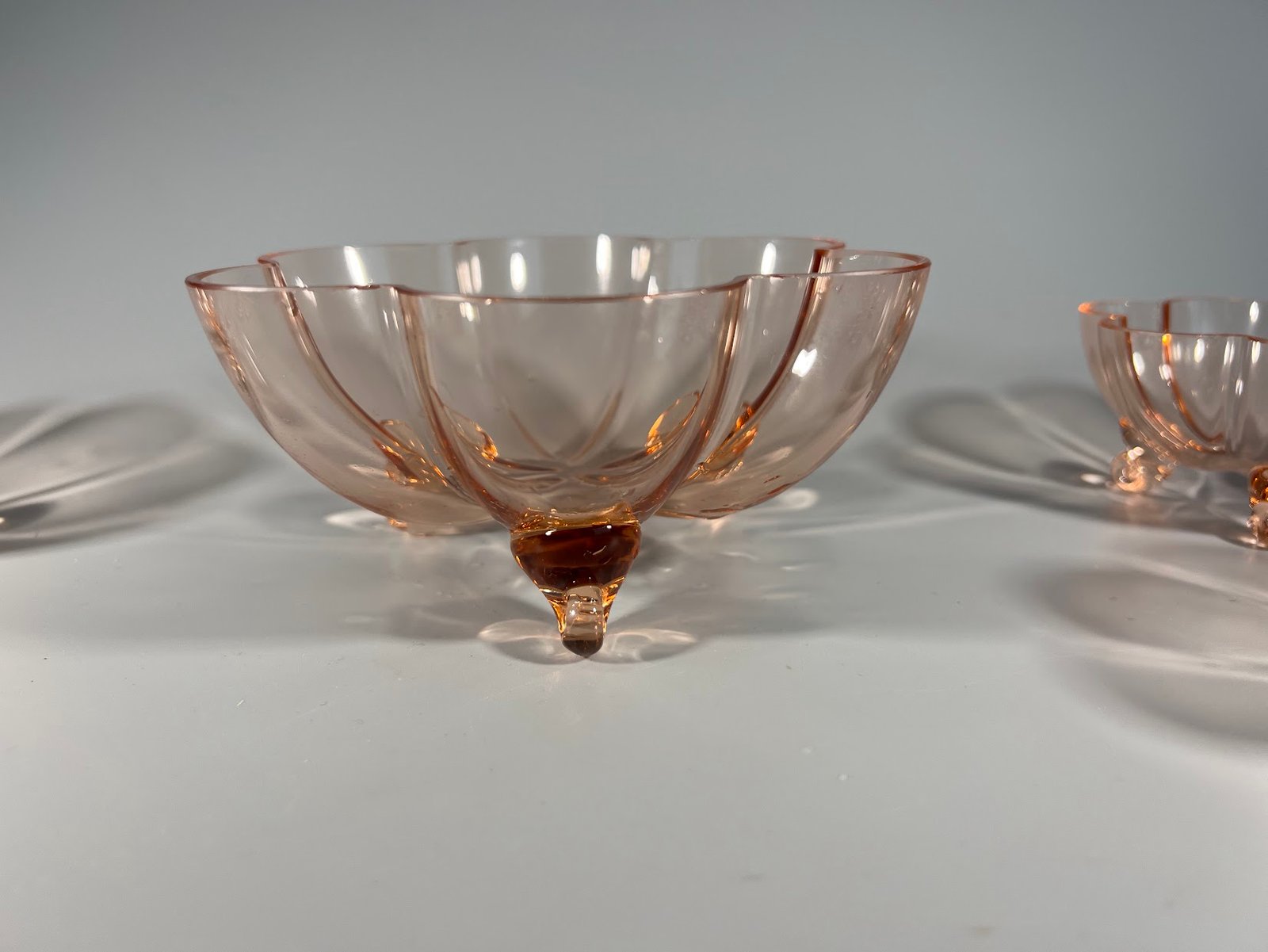 Desertų, vaisių, riešutų serviravimo rinkinys antikvarinis, tarpukario laikų, Art Deco stiliaus, plono rožinio stiklo. Didžiausias 6,5 aukščio, 13 cm. skersmens. Kaina 108 už viską.